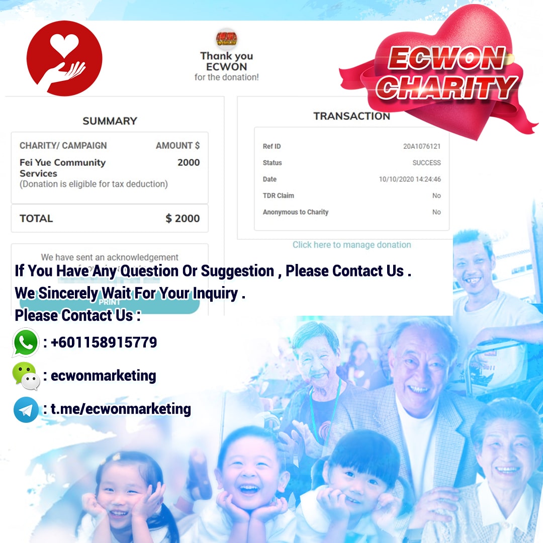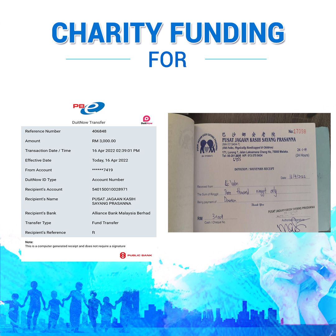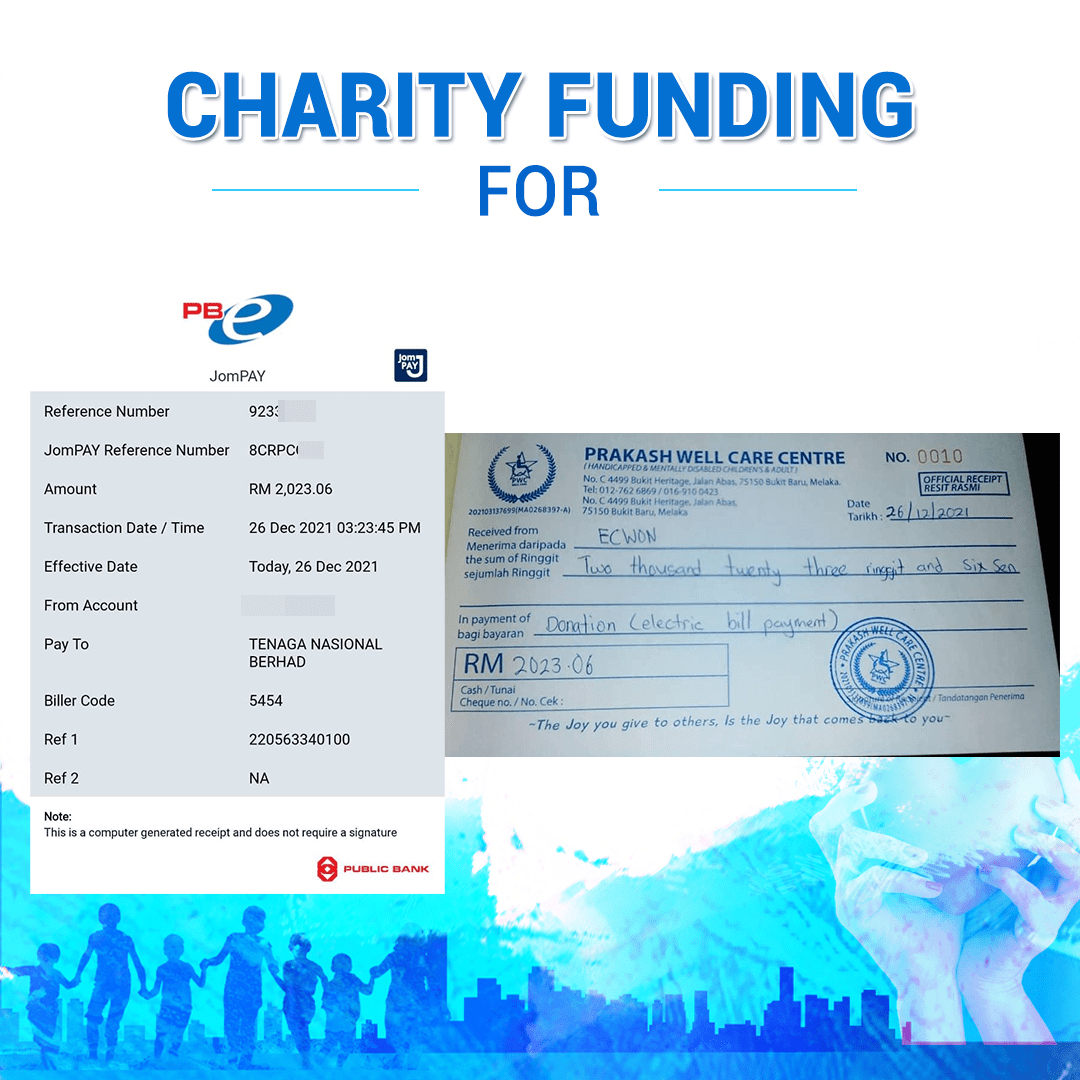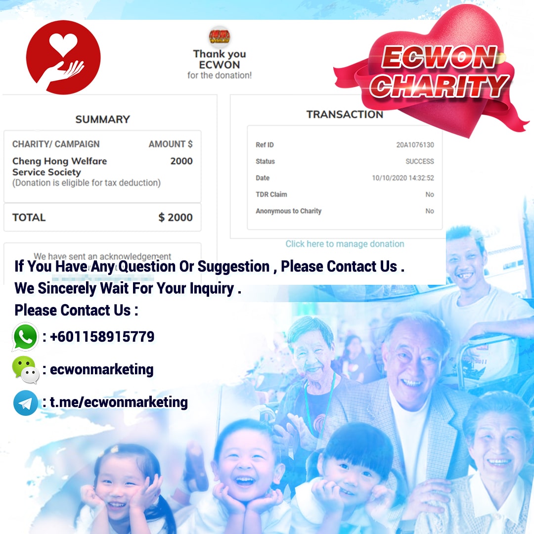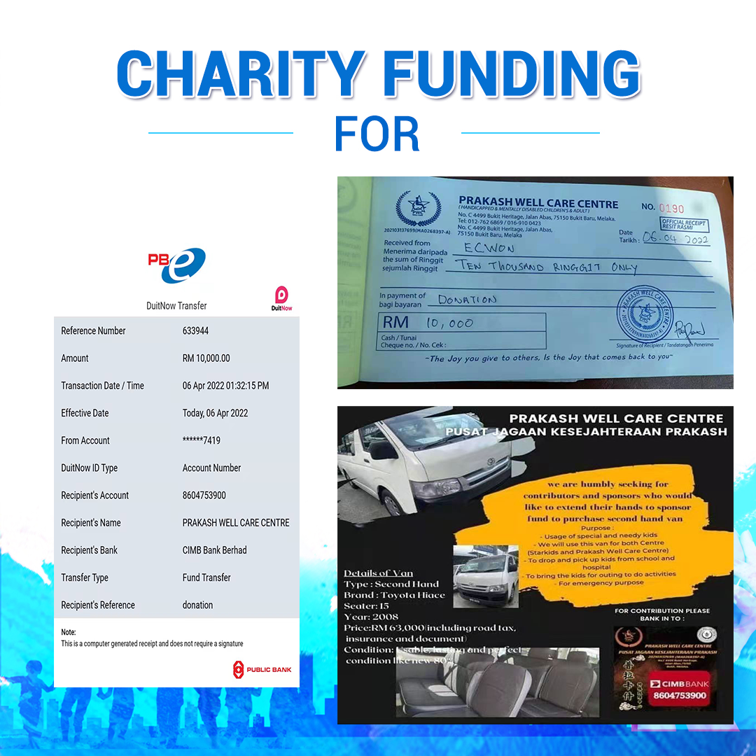 ×DATE UNITS MATTERS(Event/Case) AMOUNT RECEIPT 27/09/2025 One Hope Charity & Welfare September 2025 Donation RM 2,000 more 27/09/2025 One Hope Charity & Welfare September 2025 Donation RM 2,000 more 27/09/2025 UNICEF For Every Child September 2025 Donation RM 2,000 more 27/09/2025 Rayuan Tajaan Anak Yatim Gaza di bawah Projek Yatim KHOM September 2025 Donation RM 2,000 more 27/09/2025 Rayuan Kecemasan Susu Bayi Gaza September 2025 Donation RM 2,000 more 23/01/2024 Auntie Fong Lian (Give Malaysia) January 2024 Donation RM 2,000 more 23/01/2024 Baby Min Thant Chemotherapy Treatments (Give Malaysia) January 2024 Donation RM 2,000 more 23/01/2024 Give Acacia Fighting Chance (Give Malaysia) January 2024 Donation RM 2,000 more 23/01/2024 Haura Cancer Treatment (Give Malaysia) January 2024 Donation RM 2,000 more 23/01/2024 Raysha kidney Treatments (Give Malaysia) January 2024 Donation RM 2,000 more 29/08/2023 Nor Shahidah Heart Surgery August 2023 Donation RM 949.20 more 27/04/2023 Little Girl's Cancer Treatment April 2023 Donation RM 3,343 more 21/02/2023 GIVE Malaysia February 2023 Donation RM 5,000 more 15/12/2022 One Hope Charity & Welfa December 2022 Donation RM 10,000 more 12/07/2022 Lau Mei Jun July 2022 Donation RM 10,000 more 16/04/2022 Pusat Jagaan Kasih Sayang Prasanna April 2022 Donation RM 3,000 more 06/04/2022 Prakash Well Care Centre April 2022 Donation RM 10,000 more 28/03/2022 Yayasan Kebajikan Muslim - Low Xin Yu March 2022 Donation RM 3,000 more 14/02/2022 Puta Baramee Amulet Centre February 2022 Donation RM 2,000 more 31/12/2021 Pertubuhan Kebajikan Mu Zi Kuala Lumpur December Flood Relief RM 50,000 more 27/12/2021 7979 Volunteer Group December Flood Relief RM 6,383.71 more 26/12/2021 Prakash Well Care Centre December Donation RM 2,023.06 more 25/12/2021 Pertubuhan Kebajikan WSC December Flood Relief RM 33,000 more 08/12/2021 Details cannot be made public due to sensitive issues 2021 Qinghan Scholarship RM 10,000 more 31/10/2021 Kiew Lee Yun October Donation RM 2,000 more 14/10/2021 Wong Koy Lean October Donation RM 10,000 more 09/08/2021 Pertubuhan Kebajikan Shi Fang Johor Bahru Johor Urgent Donation for HFNC breathing tube RM 10,000 more 04/08/2021 Rumah Charis ECWON 6TH Anniversary Donation RM 2,000 more 04/08/2021 Be Home For Special Care ECWON 6TH Anniversary Donation RM 2,000 more 04/08/2021 Pusat Jagaan Sri Mesra-Mesra Home Ampang ECWON 6TH Anniversary Donation RM 2,000 more 04/08/2021 En Yuan Old Folk Home ECWON 6TH Anniversary Donation RM 2,000 more 04/08/2021 Association Yee Ran Jing Sheh Handicapped Children's Home ECWON 6TH Anniversary Donation RM 2,000 more 04/08/2021 Penang Handicapped Welfare Association ECWON 6TH Anniversary Donation RM 2,000 more 04/08/2021 Persatuan Rumah Caring Kajang Selangor ECWON 6TH Anniversary Donation RM 2,000 more 04/08/2021 Pertubuhan Kebajikan Orang Tua Cacat Dan Kurang Upaya Taman Connaught ECWON 6TH Anniversary Donation RM 2,000 more 04/08/2021 Pertubuhan Kebajikan Orang Tua Wen Xin ECWON 6TH Anniversary Donation RM 2,000 more 04/08/2021 Pusat Penjagaan Warga Emas Chan ECWON 6TH Anniversary Donation RM 2,000 more 04/08/2021 St. Nicholas' Home ECWON 6TH Anniversary Donation RM 2,000 more 04/08/2021 Pertubuhan Amal Uncle Kentang Malaysia ECWON 6TH Anniversary Donation RM 2,000 more 20/07/2021 White Flag Campaign ECWON 6TH Anniversary Donation RM 6,210.90 more 19/07/2021 Persatuan Kebajikan Amal Da Ai Malaysia Jul'21 Donation RM 1,000 more 01/06/2021 Klang Valley Elderly and Disability Center Klang Valley Elderly and Disability Donation RM 10,000 more 09/02/2021 Pertubuhan Amal Uncle Kentang Malaysia February Donation RM 10,000 more 09/02/2021 Persatuan Kebajikan Prihatin Kuan Yin February Donation RM 3,000 more 09/02/2021 Pkbb Shuang Fu JB February Donation RM 3,000 more 09/02/2021 Pertubuhan Kebajikan Amal Charis Mantin February Donation RM 3,000 more 09/02/2021 Persatuan Kebajikan Warga Emas Ci Shan February Donation RM 3,000 more 09/02/2021 Pertubuhan Pengurusan Rumah Anak-anak Yatim Dan Miskin "Anning" February Donation RM 3,000 more 09/02/2021 Kuching Life Care Society February Donation RM 2,000 more 06/02/2021 NGOhub February Donation RM 2,000 more 06/02/2021 Tenaganita Society February Donation RM 2,000 more 06/02/2021 Yayasan Setia Negara February Donation RM 2,000 more 06/02/2021 Hopis Malaysia February Donation RM 2,000 more 06/02/2021 Pusat Perubatan Universiti Malaya February Donation RM 2,000 more 06/02/2021 Respons Malaysia February Donation RM 2,000 more 06/02/2021 The Lost Food Project February Donation RM 2,000 more 06/02/2021 Unicef February Donation RM 2,000 more 06/02/2021 Protect and Save The Children February Donation RM 3,000 more 06/02/2021 MERCY Malaysia February Donation RM 3,000 more 05/02/2021 Persatuan Kebajikan Ler See February Donation RM 2,000 more 05/02/2021 Persatuan Kebajikan Kanak-kanak OKU Bayan Lebas Pulau Pinang February Donation RM 2,000 more 05/02/2021 Persatuan Insan Istimewa Cheras Selangor February Donation RM 2,000 more 05/02/2021 Persatuan Kebajikan Kanak-kanak Terencat Akal Malaysia February Donation RM 2,000 more 05/02/2021 Pertubuhan Kebajikan Shi Fang Johor February Donation RM 2,000 more 05/02/2021 Pusat Jagaan Kasih Sayang Prasanna February Donation RM 2,000 more 05/02/2021 Pusat Jagaan Kasih Sayang Angel February Donation RM 2,000 more 05/02/2021 Rumah Orang-orang Tua Seri Setia February Donation RM 2,000 more 05/02/2021 Pusat Kebajikan Care Haven Bhd February Donation RM 2,000 more 05/02/2021 Pertubuhan Kebajikan Orang Tua Yi Xing February Donation RM 3,000 more 05/02/2021 Pertubuhan Kebajikan Orang Tua Wen Xin February Donation RM 3,000 more 05/02/2021 Pertubuhan Kebajikan Orang Tua Cacat Dan Kurang Upaya Taman Connaught February Donation RM 3,000 more 05/02/2021 Pusat Penjagaan Warga Emas Chan February Donation RM 3,000 more 05/02/2021 Shine Home February Donation RM 3,000 more 05/02/2021 Pertubuhan Kebajikan Insan Istimewa Kuala Lumpur February Donation RM 3,000 more 05/02/