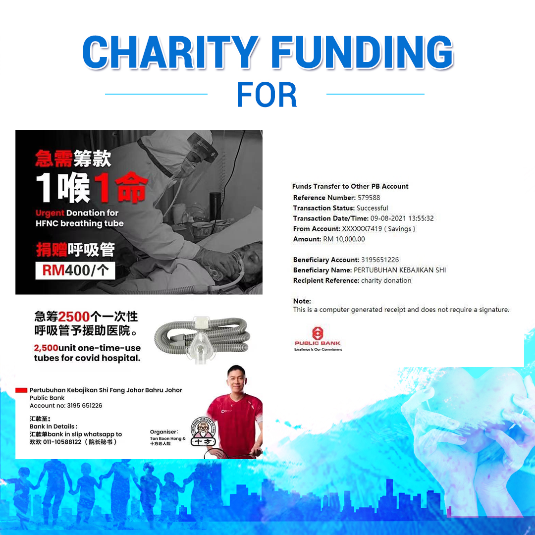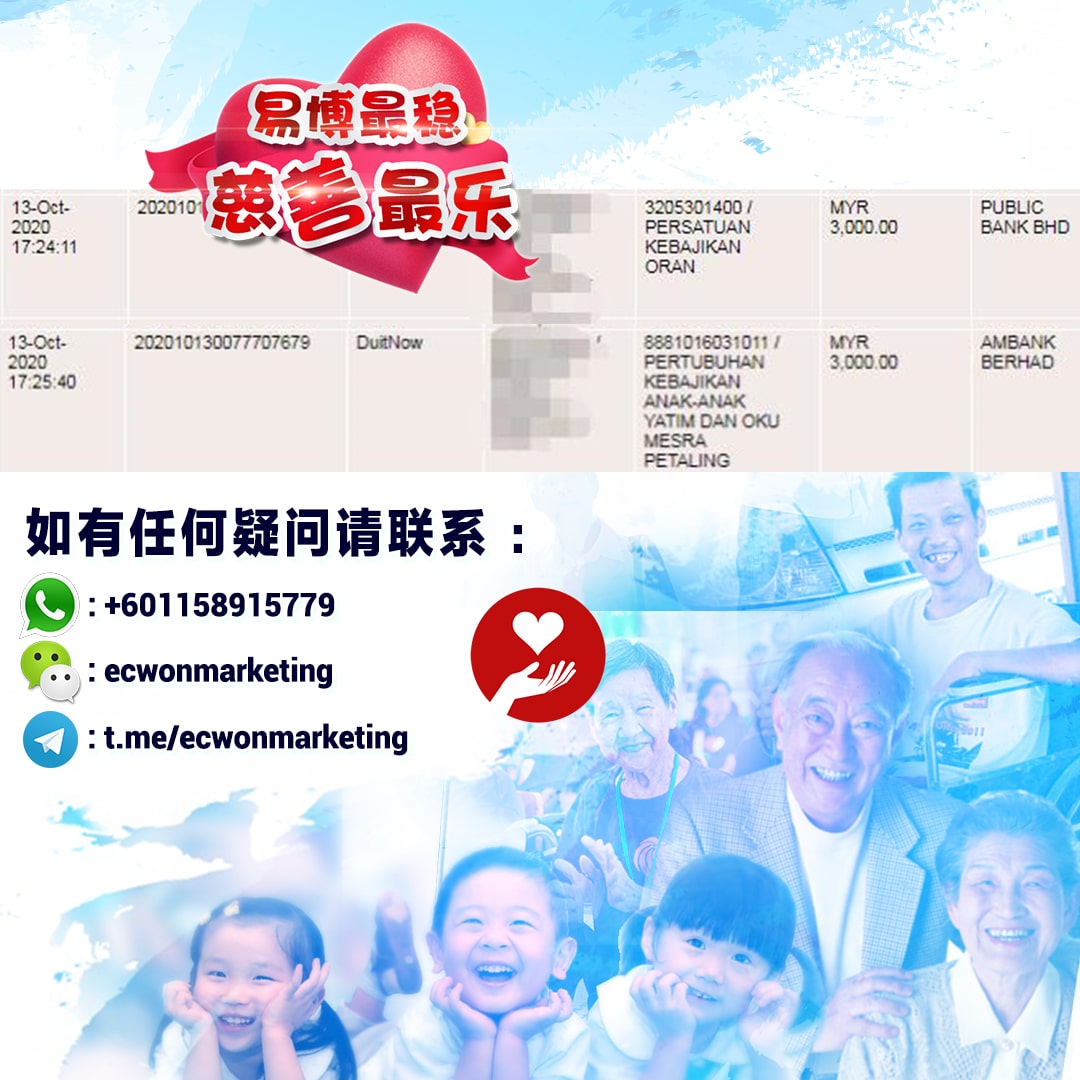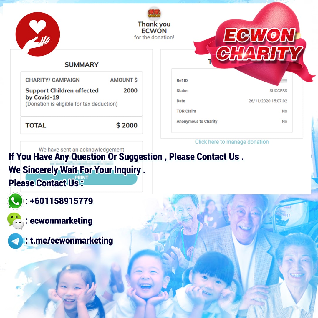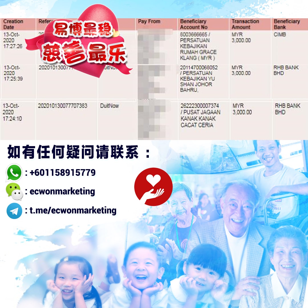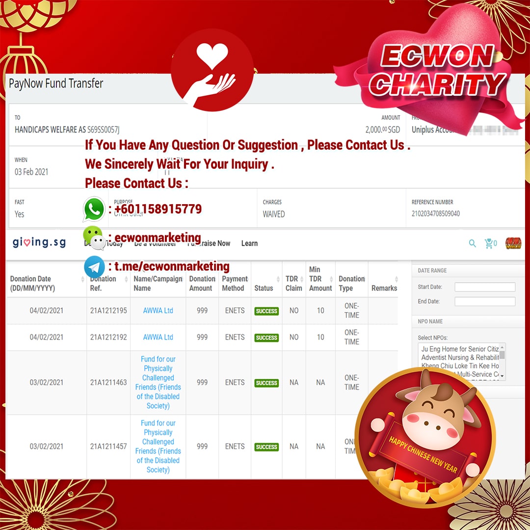 ×DATE UNITS MATTERS(Event/Case) AMOUNT RECEIPT 27/09/2025 One Hope Charity & Welfare September 2025 Donation RM 2,000 more 27/09/2025 One Hope Charity & Welfare September 2025 Donation RM 2,000 more 27/09/2025 UNICEF For Every Child September 2025 Donation RM 2,000 more 27/09/2025 Rayuan Tajaan Anak Yatim Gaza di bawah Projek Yatim KHOM September 2025 Donation RM 2,000 more 27/09/2025 Rayuan Kecemasan Susu Bayi Gaza September 2025 Donation RM 2,000 more 23/01/2024 Auntie Fong Lian (Give Malaysia) January 2024 Donation RM 2,000 more 23/01/2024 Baby Min Thant Chemotherapy Treatments (Give Malaysia) January 2024 Donation RM 2,000 more 23/01/2024 Give Acacia Fighting Chance (Give Malaysia) January 2024 Donation RM 2,000 more 23/01/2024 Haura Cancer Treatment (Give Malaysia) January 2024 Donation RM 2,000 more 23/01/2024 Raysha kidney Treatments (Give Malaysia) January 2024 Donation RM 2,000 more 29/08/2023 Nor Shahidah Heart Surgery August 2023 Donation RM 949.20 more 27/04/2023 Little Girl's Cancer Treatment April 2023 Donation RM 3,343 more 21/02/2023 GIVE Malaysia February 2023 Donation RM 5,000 more 15/12/2022 One Hope Charity & Welfa December 2022 Donation RM 10,000 more 12/07/2022 Lau Mei Jun July 2022 Donation RM 10,000 more 16/04/2022 Pusat Jagaan Kasih Sayang Prasanna April 2022 Donation RM 3,000 more 06/04/2022 Prakash Well Care Centre April 2022 Donation RM 10,000 more 28/03/2022 Yayasan Kebajikan Muslim - Low Xin Yu March 2022 Donation RM 3,000 more 14/02/2022 Puta Baramee Amulet Centre February 2022 Donation RM 2,000 more 31/12/2021 Pertubuhan Kebajikan Mu Zi Kuala Lumpur December Flood Relief RM 50,000 more 27/12/2021 7979 Volunteer Group December Flood Relief RM 6,383.71 more 26/12/2021 Prakash Well Care Centre December Donation RM 2,023.06 more 25/12/2021 Pertubuhan Kebajikan WSC December Flood Relief RM 33,000 more 08/12/2021 Details cannot be made public due to sensitive issues 2021 Qinghan Scholarship RM 10,000 more 31/10/2021 Kiew Lee Yun October Donation RM 2,000 more 14/10/2021 Wong Koy Lean October Donation RM 10,000 more 09/08/2021 Pertubuhan Kebajikan Shi Fang Johor Bahru Johor Urgent Donation for HFNC breathing tube RM 10,000 more 04/08/2021 Rumah Charis ECWON 6TH Anniversary Donation RM 2,000 more 04/08/2021 Be Home For Special Care ECWON 6TH Anniversary Donation RM 2,000 more 04/08/2021 Pusat Jagaan Sri Mesra-Mesra Home Ampang ECWON 6TH Anniversary Donation RM 2,000 more 04/08/2021 En Yuan Old Folk Home ECWON 6TH Anniversary Donation RM 2,000 more 04/08/2021 Association Yee Ran Jing Sheh Handicapped Children's Home ECWON 6TH Anniversary Donation RM 2,000 more 04/08/2021 Penang Handicapped Welfare Association ECWON 6TH Anniversary Donation RM 2,000 more 04/08/2021 Persatuan Rumah Caring Kajang Selangor ECWON 6TH Anniversary Donation RM 2,000 more 04/08/2021 Pertubuhan Kebajikan Orang Tua Cacat Dan Kurang Upaya Taman Connaught ECWON 6TH Anniversary Donation RM 2,000 more 04/08/2021 Pertubuhan Kebajikan Orang Tua Wen Xin ECWON 6TH Anniversary Donation RM 2,000 more 04/08/2021 Pusat Penjagaan Warga Emas Chan ECWON 6TH Anniversary Donation RM 2,000 more 04/08/2021 St. Nicholas' Home ECWON 6TH Anniversary Donation RM 2,000 more 04/08/2021 Pertubuhan Amal Uncle Kentang Malaysia ECWON 6TH Anniversary Donation RM 2,000 more 20/07/2021 White Flag Campaign ECWON 6TH Anniversary Donation RM 6,210.90 more 19/07/2021 Persatuan Kebajikan Amal Da Ai Malaysia Jul'21 Donation RM 1,000 more 01/06/2021 Klang Valley Elderly and Disability Center Klang Valley Elderly and Disability Donation RM 10,000 more 09/02/2021 Pertubuhan Amal Uncle Kentang Malaysia February Donation RM 10,000 more 09/02/2021 Persatuan Kebajikan Prihatin Kuan Yin February Donation RM 3,000 more 09/02/2021 Pkbb Shuang Fu JB February Donation RM 3,000 more 09/02/2021 Pertubuhan Kebajikan Amal Charis Mantin February Donation RM 3,000 more 09/02/2021 Persatuan Kebajikan Warga Emas Ci Shan February Donation RM 3,000 more 09/02/2021 Pertubuhan Pengurusan Rumah Anak-anak Yatim Dan Miskin "Anning" February Donation RM 3,000 more 09/02/2021 Kuching Life Care Society February Donation RM 2,000 more 06/02/2021 NGOhub February Donation RM 2,000 more 06/02/2021 Tenaganita Society February Donation RM 2,000 more 06/02/2021 Yayasan Setia Negara February Donation RM 2,000 more 06/02/2021 Hopis Malaysia February Donation RM 2,000 more 06/02/2021 Pusat Perubatan Universiti Malaya February Donation RM 2,000 more 06/02/2021 Respons Malaysia February Donation RM 2,000 more 06/02/2021 The Lost Food Project February Donation RM 2,000 more 06/02/2021 Unicef February Donation RM 2,000 more 06/02/2021 Protect and Save The Children February Donation RM 3,000 more 06/02/2021 MERCY Malaysia February Donation RM 3,000 more 05/02/2021 Persatuan Kebajikan Ler See February Donation RM 2,000 more 05/02/2021 Persatuan Kebajikan Kanak-kanak OKU Bayan Lebas Pulau Pinang February Donation RM 2,000 more 05/02/2021 Persatuan Insan Istimewa Cheras Selangor February Donation RM 2,000 more 05/02/2021 Persatuan Kebajikan Kanak-kanak Terencat Akal Malaysia February Donation RM 2,000 more 05/02/2021 Pertubuhan Kebajikan Shi Fang Johor February Donation RM 2,000 more 05/02/2021 Pusat Jagaan Kasih Sayang Prasanna February Donation RM 2,000 more 05/02/2021 Pusat Jagaan Kasih Sayang Angel February Donation RM 2,000 more 05/02/2021 Rumah Orang-orang Tua Seri Setia February Donation RM 2,000 more 05/02/2021 Pusat Kebajikan Care Haven Bhd February Donation RM 2,000 more 05/02/2021 Pertubuhan Kebajikan Orang Tua Yi Xing February Donation RM 3,000 more 05/02/2021 Pertubuhan Kebajikan Orang Tua Wen Xin February Donation RM 3,000 more 05/02/2021 Pertubuhan Kebajikan Orang Tua Cacat Dan Kurang Upaya Taman Connaught February Donation RM 3,000 more 05/02/2021 Pusat Penjagaan Warga Emas Chan February Donation RM 3,000 more 05/02/2021 Shine Home February Donation RM 3,000 more 05/02/2021 Pertubuhan Kebajikan Insan Istimewa Kuala Lumpur February Donation RM 3,000 more 05/02/
