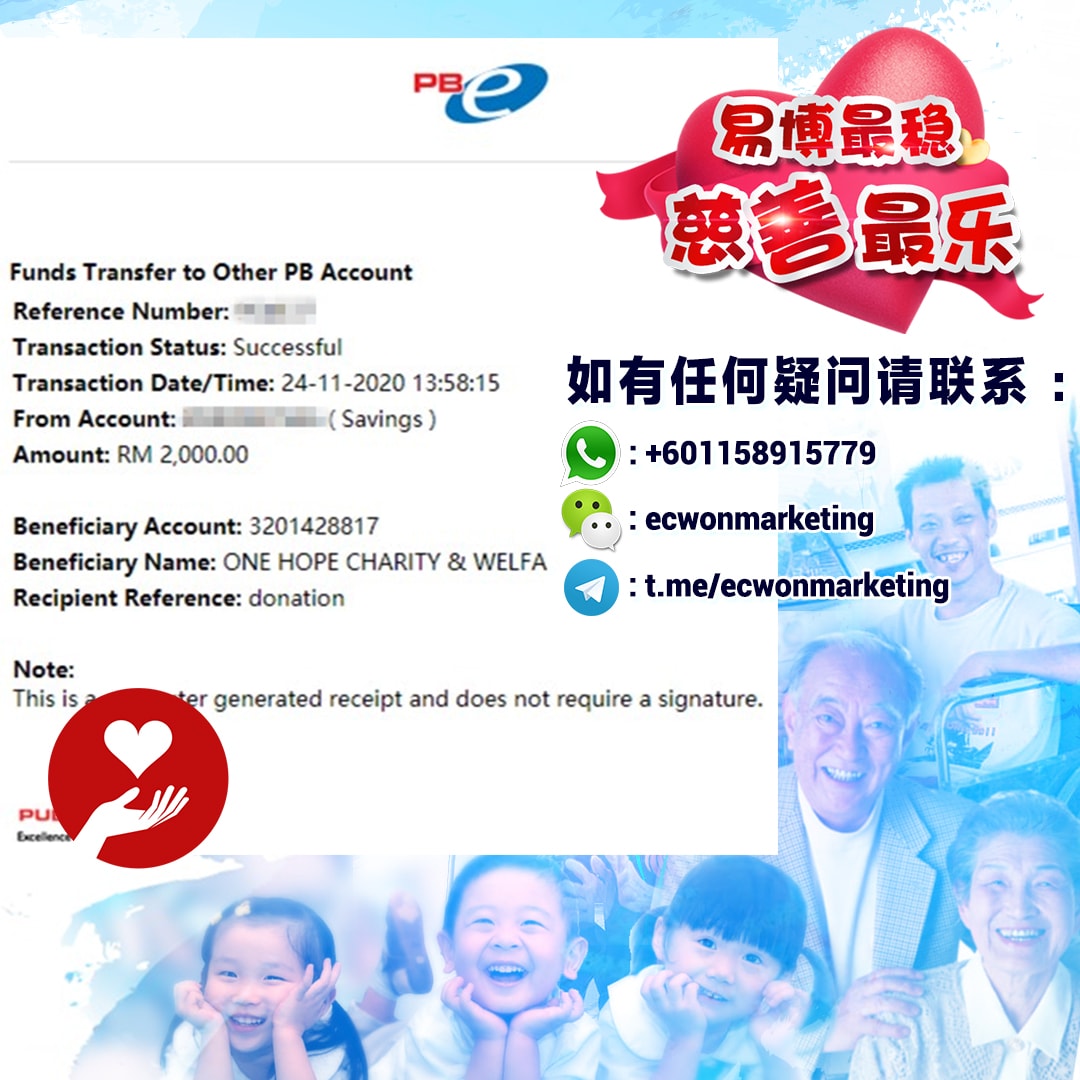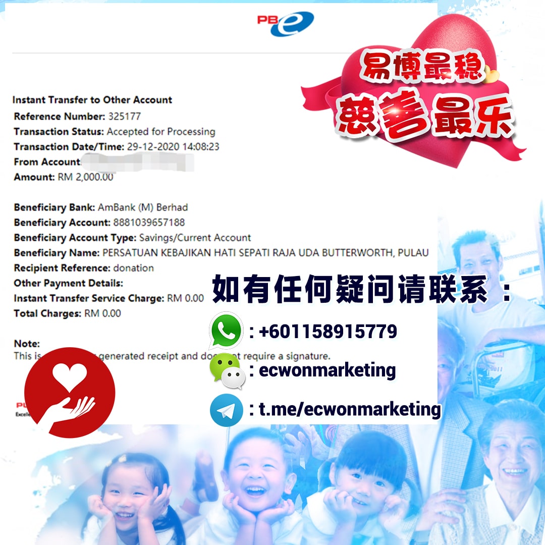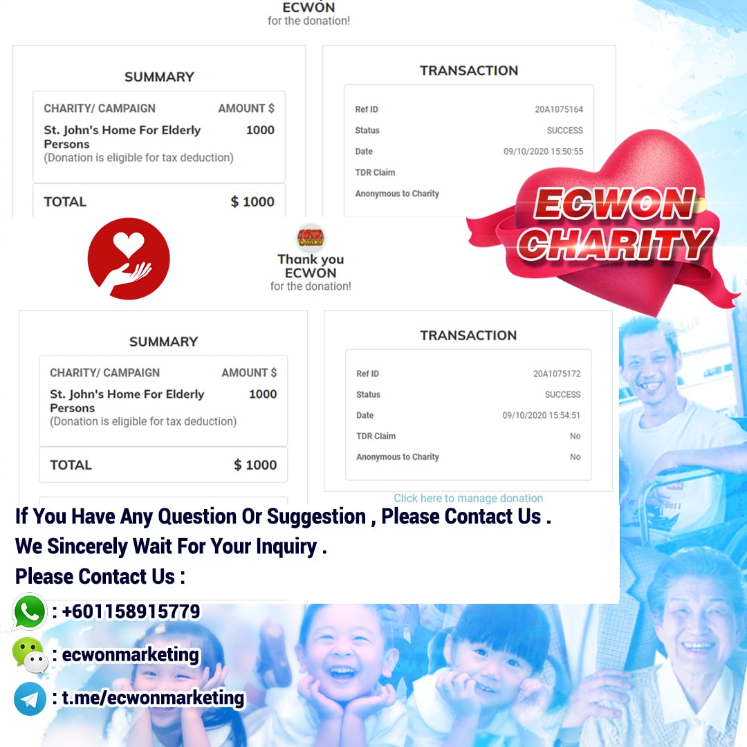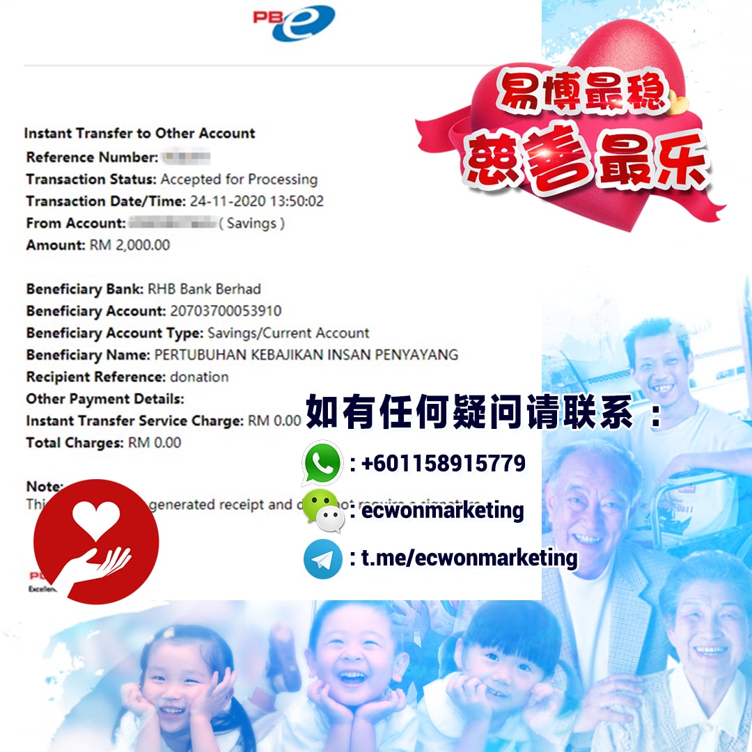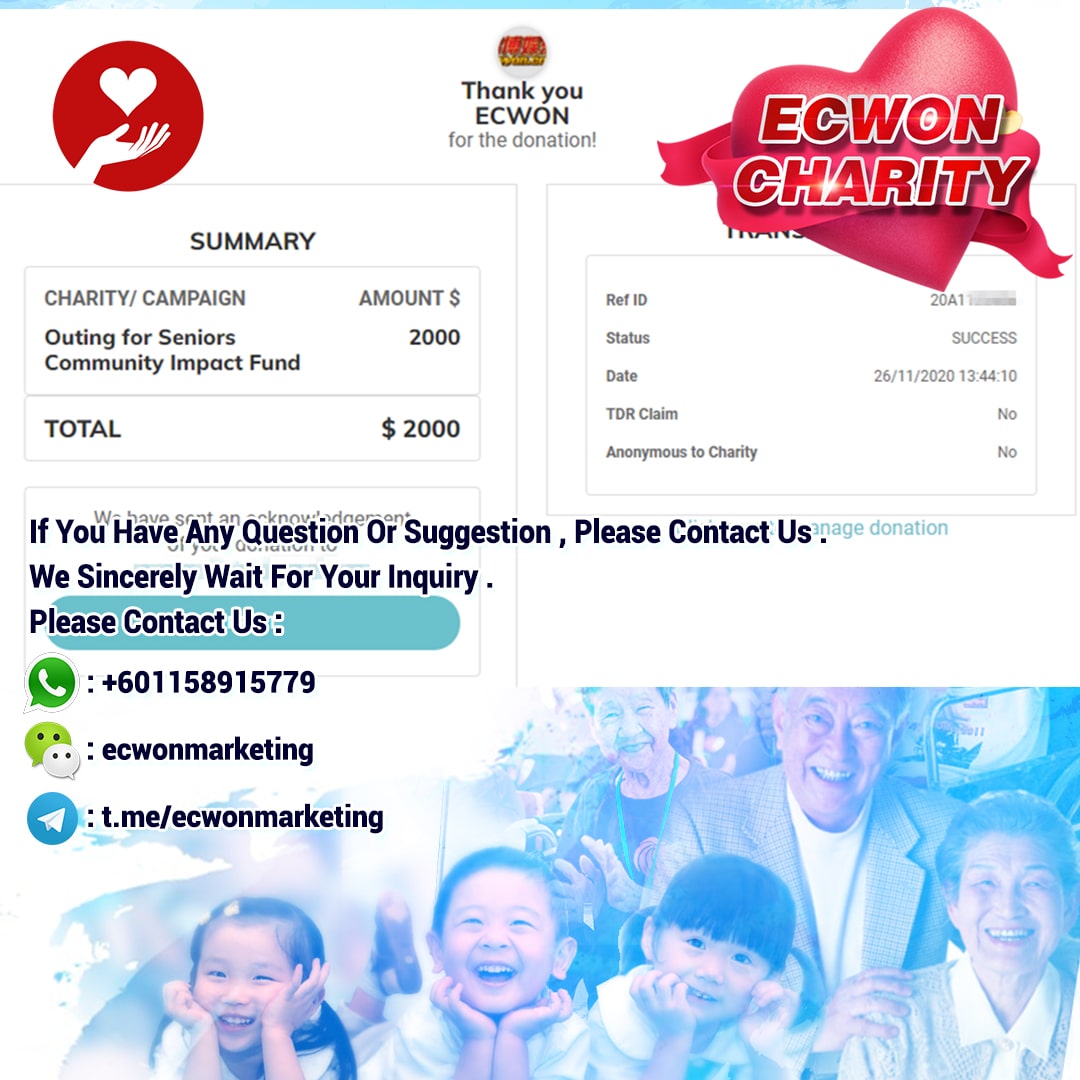 ×DATE UNITS MATTERS(Event/Case) AMOUNT RECEIPT 27/09/2025 One Hope Charity & Welfare September 2025 Donation RM 2,000 more 27/09/2025 One Hope Charity & Welfare September 2025 Donation RM 2,000 more 27/09/2025 UNICEF For Every Child September 2025 Donation RM 2,000 more 27/09/2025 Rayuan Tajaan Anak Yatim Gaza di bawah Projek Yatim KHOM September 2025 Donation RM 2,000 more 27/09/2025 Rayuan Kecemasan Susu Bayi Gaza September 2025 Donation RM 2,000 more 23/01/2024 Auntie Fong Lian (Give Malaysia) January 2024 Donation RM 2,000 more 23/01/2024 Baby Min Thant Chemotherapy Treatments (Give Malaysia) January 2024 Donation RM 2,000 more 23/01/2024 Give Acacia Fighting Chance (Give Malaysia) January 2024 Donation RM 2,000 more 23/01/2024 Haura Cancer Treatment (Give Malaysia) January 2024 Donation RM 2,000 more 23/01/2024 Raysha kidney Treatments (Give Malaysia) January 2024 Donation RM 2,000 more 29/08/2023 Nor Shahidah Heart Surgery August 2023 Donation RM 949.20 more 27/04/2023 Little Girl's Cancer Treatment April 2023 Donation RM 3,343 more 21/02/2023 GIVE Malaysia February 2023 Donation RM 5,000 more 15/12/2022 One Hope Charity & Welfa December 2022 Donation RM 10,000 more 12/07/2022 Lau Mei Jun July 2022 Donation RM 10,000 more 16/04/2022 Pusat Jagaan Kasih Sayang Prasanna April 2022 Donation RM 3,000 more 06/04/2022 Prakash Well Care Centre April 2022 Donation RM 10,000 more 28/03/2022 Yayasan Kebajikan Muslim - Low Xin Yu March 2022 Donation RM 3,000 more 14/02/2022 Puta Baramee Amulet Centre February 2022 Donation RM 2,000 more 31/12/2021 Pertubuhan Kebajikan Mu Zi Kuala Lumpur December Flood Relief RM 50,000 more 27/12/2021 7979 Volunteer Group December Flood Relief RM 6,383.71 more 26/12/2021 Prakash Well Care Centre December Donation RM 2,023.06 more 25/12/2021 Pertubuhan Kebajikan WSC December Flood Relief RM 33,000 more 08/12/2021 Details cannot be made public due to sensitive issues 2021 Qinghan Scholarship RM 10,000 more 31/10/2021 Kiew Lee Yun October Donation RM 2,000 more 14/10/2021 Wong Koy Lean October Donation RM 10,000 more 09/08/2021 Pertubuhan Kebajikan Shi Fang Johor Bahru Johor Urgent Donation for HFNC breathing tube RM 10,000 more 04/08/2021 Rumah Charis ECWON 6TH Anniversary Donation RM 2,000 more 04/08/2021 Be Home For Special Care ECWON 6TH Anniversary Donation RM 2,000 more 04/08/2021 Pusat Jagaan Sri Mesra-Mesra Home Ampang ECWON 6TH Anniversary Donation RM 2,000 more 04/08/2021 En Yuan Old Folk Home ECWON 6TH Anniversary Donation RM 2,000 more 04/08/2021 Association Yee Ran Jing Sheh Handicapped Children's Home ECWON 6TH Anniversary Donation RM 2,000 more 04/08/2021 Penang Handicapped Welfare Association ECWON 6TH Anniversary Donation RM 2,000 more 04/08/2021 Persatuan Rumah Caring Kajang Selangor ECWON 6TH Anniversary Donation RM 2,000 more 04/08/2021 Pertubuhan Kebajikan Orang Tua Cacat Dan Kurang Upaya Taman Connaught ECWON 6TH Anniversary Donation RM 2,000 more 04/08/2021 Pertubuhan Kebajikan Orang Tua Wen Xin ECWON 6TH Anniversary Donation RM 2,000 more 04/08/2021 Pusat Penjagaan Warga Emas Chan ECWON 6TH Anniversary Donation RM 2,000 more 04/08/2021 St. Nicholas' Home ECWON 6TH Anniversary Donation RM 2,000 more 04/08/2021 Pertubuhan Amal Uncle Kentang Malaysia ECWON 6TH Anniversary Donation RM 2,000 more 20/07/2021 White Flag Campaign ECWON 6TH Anniversary Donation RM 6,210.90 more 19/07/2021 Persatuan Kebajikan Amal Da Ai Malaysia Jul'21 Donation RM 1,000 more 01/06/2021 Klang Valley Elderly and Disability Center Klang Valley Elderly and Disability Donation RM 10,000 more 09/02/2021 Pertubuhan Amal Uncle Kentang Malaysia February Donation RM 10,000 more 09/02/2021 Persatuan Kebajikan Prihatin Kuan Yin February Donation RM 3,000 more 09/02/2021 Pkbb Shuang Fu JB February Donation RM 3,000 more 09/02/2021 Pertubuhan Kebajikan Amal Charis Mantin February Donation RM 3,000 more 09/02/2021 Persatuan Kebajikan Warga Emas Ci Shan February Donation RM 3,000 more 09/02/2021 Pertubuhan Pengurusan Rumah Anak-anak Yatim Dan Miskin "Anning" February Donation RM 3,000 more 09/02/2021 Kuching Life Care Society February Donation RM 2,000 more 06/02/2021 NGOhub February Donation RM 2,000 more 06/02/2021 Tenaganita Society February Donation RM 2,000 more 06/02/2021 Yayasan Setia Negara February Donation RM 2,000 more 06/02/2021 Hopis Malaysia February Donation RM 2,000 more 06/02/2021 Pusat Perubatan Universiti Malaya February Donation RM 2,000 more 06/02/2021 Respons Malaysia February Donation RM 2,000 more 06/02/2021 The Lost Food Project February Donation RM 2,000 more 06/02/2021 Unicef February Donation RM 2,000 more 06/02/2021 Protect and Save The Children February Donation RM 3,000 more 06/02/2021 MERCY Malaysia February Donation RM 3,000 more 05/02/2021 Persatuan Kebajikan Ler See February Donation RM 2,000 more 05/02/2021 Persatuan Kebajikan Kanak-kanak OKU Bayan Lebas Pulau Pinang February Donation RM 2,000 more 05/02/2021 Persatuan Insan Istimewa Cheras Selangor February Donation RM 2,000 more 05/02/2021 Persatuan Kebajikan Kanak-kanak Terencat Akal Malaysia February Donation RM 2,000 more 05/02/2021 Pertubuhan Kebajikan Shi Fang Johor February Donation RM 2,000 more 05/02/2021 Pusat Jagaan Kasih Sayang Prasanna February Donation RM 2,000 more 05/02/2021 Pusat Jagaan Kasih Sayang Angel February Donation RM 2,000 more 05/02/2021 Rumah Orang-orang Tua Seri Setia February Donation RM 2,000 more 05/02/2021 Pusat Kebajikan Care Haven Bhd February Donation RM 2,000 more 05/02/2021 Pertubuhan Kebajikan Orang Tua Yi Xing February Donation RM 3,000 more 05/02/2021 Pertubuhan Kebajikan Orang Tua Wen Xin February Donation RM 3,000 more 05/02/2021 Pertubuhan Kebajikan Orang Tua Cacat Dan Kurang Upaya Taman Connaught February Donation RM 3,000 more 05/02/2021 Pusat Penjagaan Warga Emas Chan February Donation RM 3,000 more 05/02/2021 Shine Home February Donation RM 3,000 more 05/02/2021 Pertubuhan Kebajikan Insan Istimewa Kuala Lumpur February Donation RM 3,000 more 05/02/