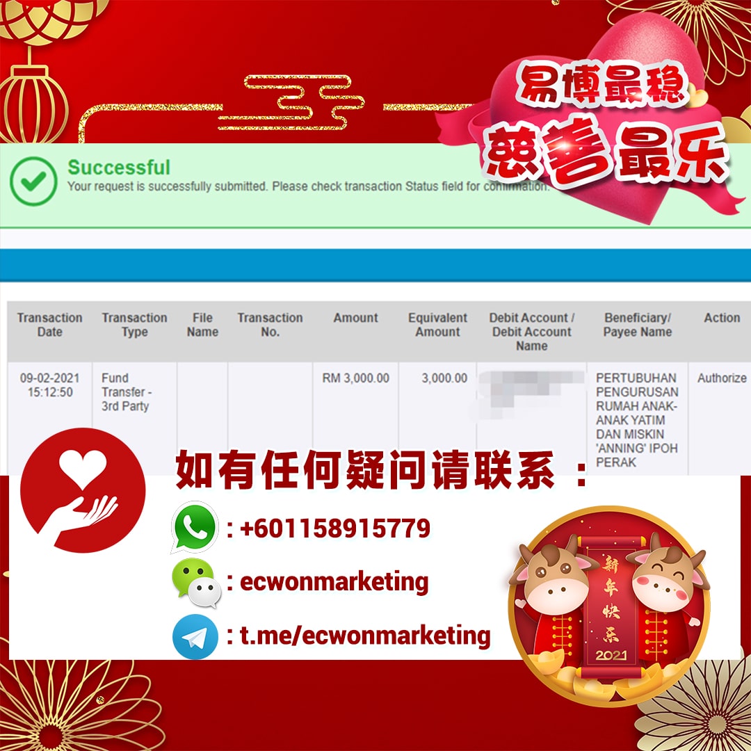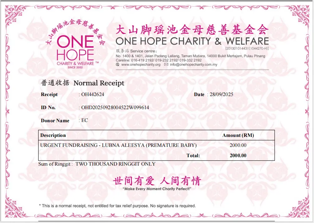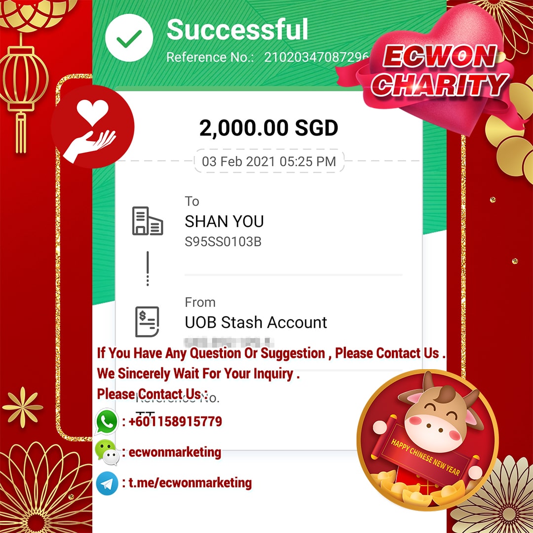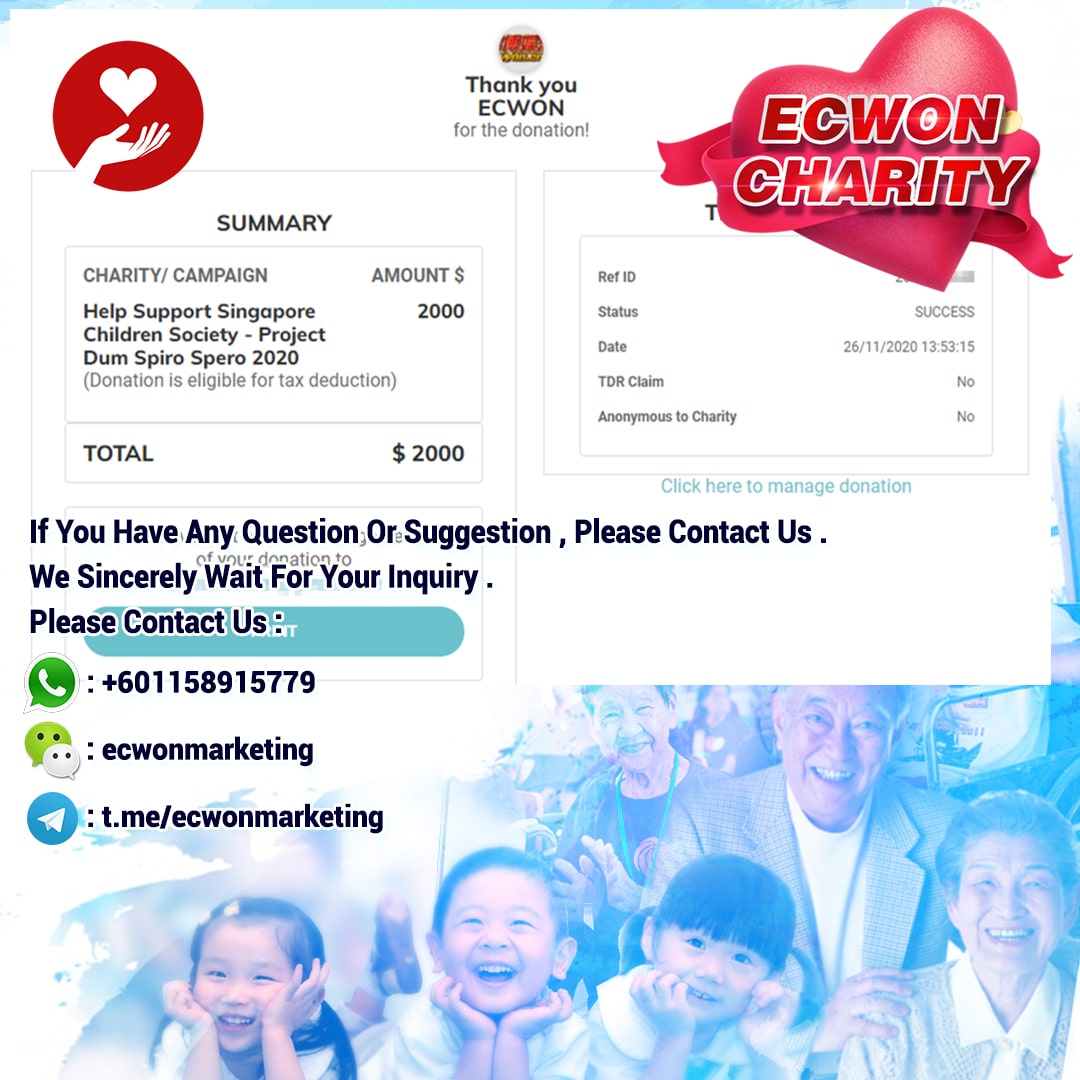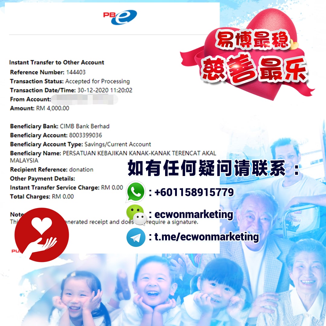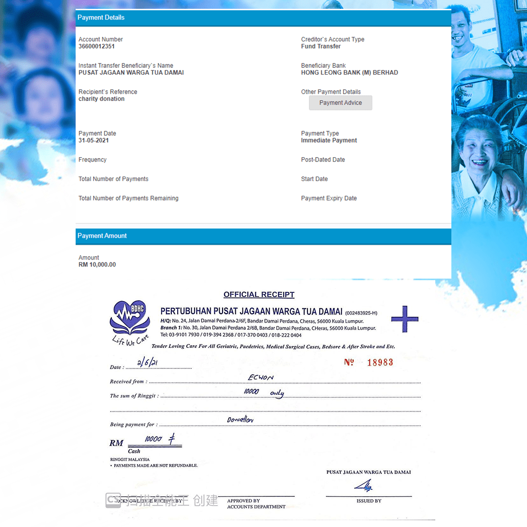 ×DATE UNITS MATTERS(Event/Case) AMOUNT RECEIPT 27/09/2025 One Hope Charity & Welfare September 2025 Donation RM 2,000 more 27/09/2025 One Hope Charity & Welfare September 2025 Donation RM 2,000 more 27/09/2025 UNICEF For Every Child September 2025 Donation RM 2,000 more 27/09/2025 Rayuan Tajaan Anak Yatim Gaza di bawah Projek Yatim KHOM September 2025 Donation RM 2,000 more 27/09/2025 Rayuan Kecemasan Susu Bayi Gaza September 2025 Donation RM 2,000 more 23/01/2024 Auntie Fong Lian (Give Malaysia) January 2024 Donation RM 2,000 more 23/01/2024 Baby Min Thant Chemotherapy Treatments (Give Malaysia) January 2024 Donation RM 2,000 more 23/01/2024 Give Acacia Fighting Chance (Give Malaysia) January 2024 Donation RM 2,000 more 23/01/2024 Haura Cancer Treatment (Give Malaysia) January 2024 Donation RM 2,000 more 23/01/2024 Raysha kidney Treatments (Give Malaysia) January 2024 Donation RM 2,000 more 29/08/2023 Nor Shahidah Heart Surgery August 2023 Donation RM 949.20 more 27/04/2023 Little Girl's Cancer Treatment April 2023 Donation RM 3,343 more 21/02/2023 GIVE Malaysia February 2023 Donation RM 5,000 more 15/12/2022 One Hope Charity & Welfa December 2022 Donation RM 10,000 more 12/07/2022 Lau Mei Jun July 2022 Donation RM 10,000 more 16/04/2022 Pusat Jagaan Kasih Sayang Prasanna April 2022 Donation RM 3,000 more 06/04/2022 Prakash Well Care Centre April 2022 Donation RM 10,000 more 28/03/2022 Yayasan Kebajikan Muslim - Low Xin Yu March 2022 Donation RM 3,000 more 14/02/2022 Puta Baramee Amulet Centre February 2022 Donation RM 2,000 more 31/12/2021 Pertubuhan Kebajikan Mu Zi Kuala Lumpur December Flood Relief RM 50,000 more 27/12/2021 7979 Volunteer Group December Flood Relief RM 6,383.71 more 26/12/2021 Prakash Well Care Centre December Donation RM 2,023.06 more 25/12/2021 Pertubuhan Kebajikan WSC December Flood Relief RM 33,000 more 08/12/2021 Details cannot be made public due to sensitive issues 2021 Qinghan Scholarship RM 10,000 more 31/10/2021 Kiew Lee Yun October Donation RM 2,000 more 14/10/2021 Wong Koy Lean October Donation RM 10,000 more 09/08/2021 Pertubuhan Kebajikan Shi Fang Johor Bahru Johor Urgent Donation for HFNC breathing tube RM 10,000 more 04/08/2021 Rumah Charis ECWON 6TH Anniversary Donation RM 2,000 more 04/08/2021 Be Home For Special Care ECWON 6TH Anniversary Donation RM 2,000 more 04/08/2021 Pusat Jagaan Sri Mesra-Mesra Home Ampang ECWON 6TH Anniversary Donation RM 2,000 more 04/08/2021 En Yuan Old Folk Home ECWON 6TH Anniversary Donation RM 2,000 more 04/08/2021 Association Yee Ran Jing Sheh Handicapped Children's Home ECWON 6TH Anniversary Donation RM 2,000 more 04/08/2021 Penang Handicapped Welfare Association ECWON 6TH Anniversary Donation RM 2,000 more 04/08/2021 Persatuan Rumah Caring Kajang Selangor ECWON 6TH Anniversary Donation RM 2,000 more 04/08/2021 Pertubuhan Kebajikan Orang Tua Cacat Dan Kurang Upaya Taman Connaught ECWON 6TH Anniversary Donation RM 2,000 more 04/08/2021 Pertubuhan Kebajikan Orang Tua Wen Xin ECWON 6TH Anniversary Donation RM 2,000 more 04/08/2021 Pusat Penjagaan Warga Emas Chan ECWON 6TH Anniversary Donation RM 2,000 more 04/08/2021 St. Nicholas' Home ECWON 6TH Anniversary Donation RM 2,000 more 04/08/2021 Pertubuhan Amal Uncle Kentang Malaysia ECWON 6TH Anniversary Donation RM 2,000 more 20/07/2021 White Flag Campaign ECWON 6TH Anniversary Donation RM 6,210.90 more 19/07/2021 Persatuan Kebajikan Amal Da Ai Malaysia Jul'21 Donation RM 1,000 more 01/06/2021 Klang Valley Elderly and Disability Center Klang Valley Elderly and Disability Donation RM 10,000 more 09/02/2021 Pertubuhan Amal Uncle Kentang Malaysia February Donation RM 10,000 more 09/02/2021 Persatuan Kebajikan Prihatin Kuan Yin February Donation RM 3,000 more 09/02/2021 Pkbb Shuang Fu JB February Donation RM 3,000 more 09/02/2021 Pertubuhan Kebajikan Amal Charis Mantin February Donation RM 3,000 more 09/02/2021 Persatuan Kebajikan Warga Emas Ci Shan February Donation RM 3,000 more 09/02/2021 Pertubuhan Pengurusan Rumah Anak-anak Yatim Dan Miskin "Anning" February Donation RM 3,000 more 09/02/2021 Kuching Life Care Society February Donation RM 2,000 more 06/02/2021 NGOhub February Donation RM 2,000 more 06/02/2021 Tenaganita Society February Donation RM 2,000 more 06/02/2021 Yayasan Setia Negara February Donation RM 2,000 more 06/02/2021 Hopis Malaysia February Donation RM 2,000 more 06/02/2021 Pusat Perubatan Universiti Malaya February Donation RM 2,000 more 06/02/2021 Respons Malaysia February Donation RM 2,000 more 06/02/2021 The Lost Food Project February Donation RM 2,000 more 06/02/2021 Unicef February Donation RM 2,000 more 06/02/2021 Protect and Save The Children February Donation RM 3,000 more 06/02/2021 MERCY Malaysia February Donation RM 3,000 more 05/02/2021 Persatuan Kebajikan Ler See February Donation RM 2,000 more 05/02/2021 Persatuan Kebajikan Kanak-kanak OKU Bayan Lebas Pulau Pinang February Donation RM 2,000 more 05/02/2021 Persatuan Insan Istimewa Cheras Selangor February Donation RM 2,000 more 05/02/2021 Persatuan Kebajikan Kanak-kanak Terencat Akal Malaysia February Donation RM 2,000 more 05/02/2021 Pertubuhan Kebajikan Shi Fang Johor February Donation RM 2,000 more 05/02/2021 Pusat Jagaan Kasih Sayang Prasanna February Donation RM 2,000 more 05/02/2021 Pusat Jagaan Kasih Sayang Angel February Donation RM 2,000 more 05/02/2021 Rumah Orang-orang Tua Seri Setia February Donation RM 2,000 more 05/02/2021 Pusat Kebajikan Care Haven Bhd February Donation RM 2,000 more 05/02/2021 Pertubuhan Kebajikan Orang Tua Yi Xing February Donation RM 3,000 more 05/02/2021 Pertubuhan Kebajikan Orang Tua Wen Xin February Donation RM 3,000 more 05/02/2021 Pertubuhan Kebajikan Orang Tua Cacat Dan Kurang Upaya Taman Connaught February Donation RM 3,000 more 05/02/2021 Pusat Penjagaan Warga Emas Chan February Donation RM 3,000 more 05/02/2021 Shine Home February Donation RM 3,000 more 05/02/2021 Pertubuhan Kebajikan Insan Istimewa Kuala Lumpur February Donation RM 3,000 more 05/02/