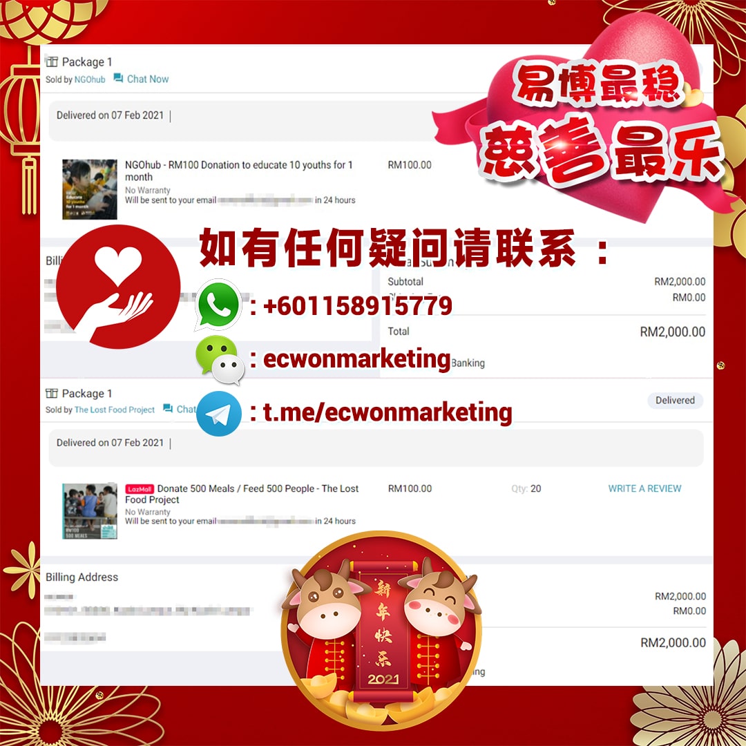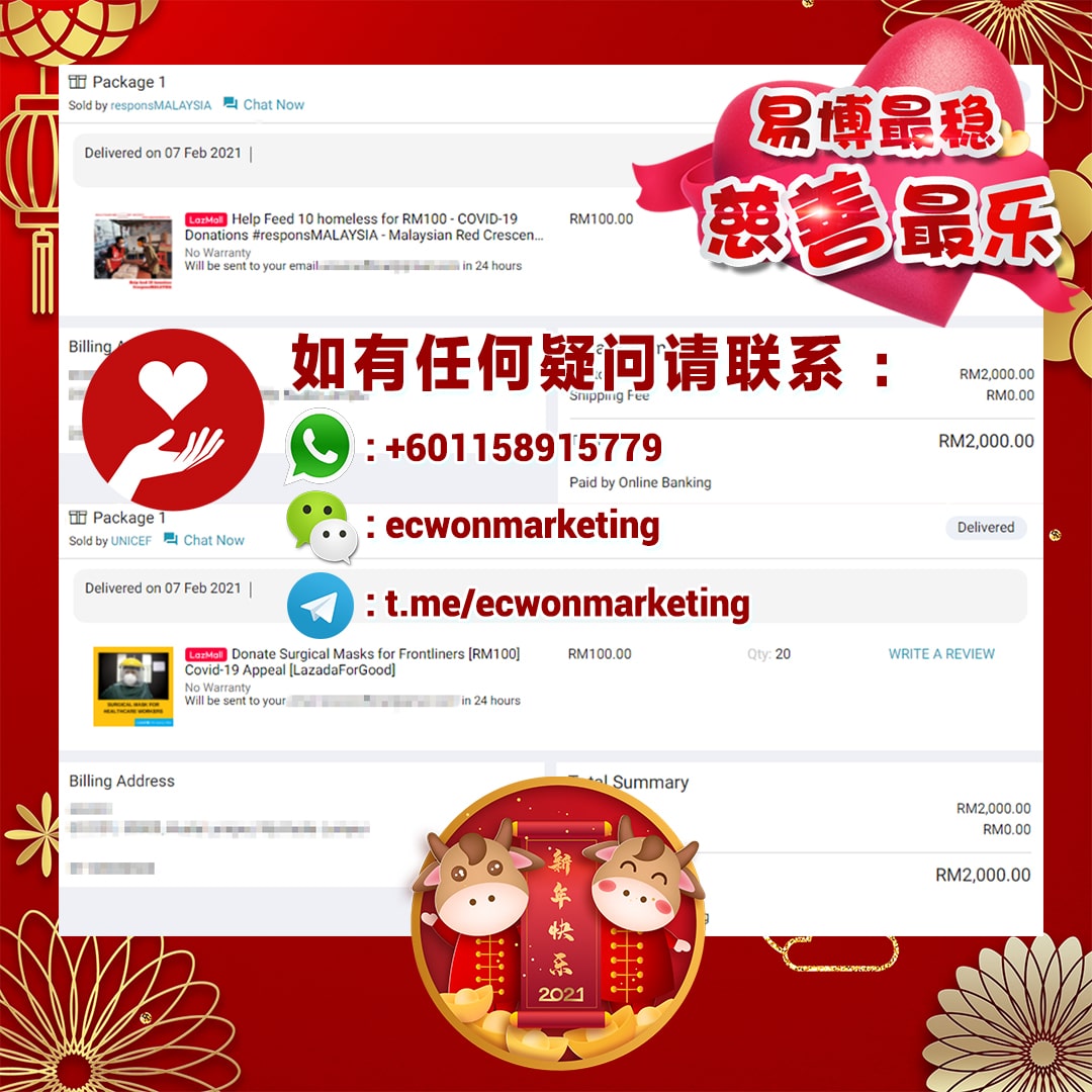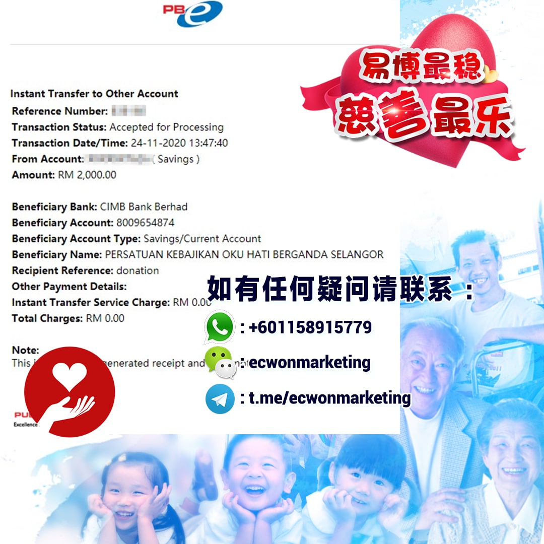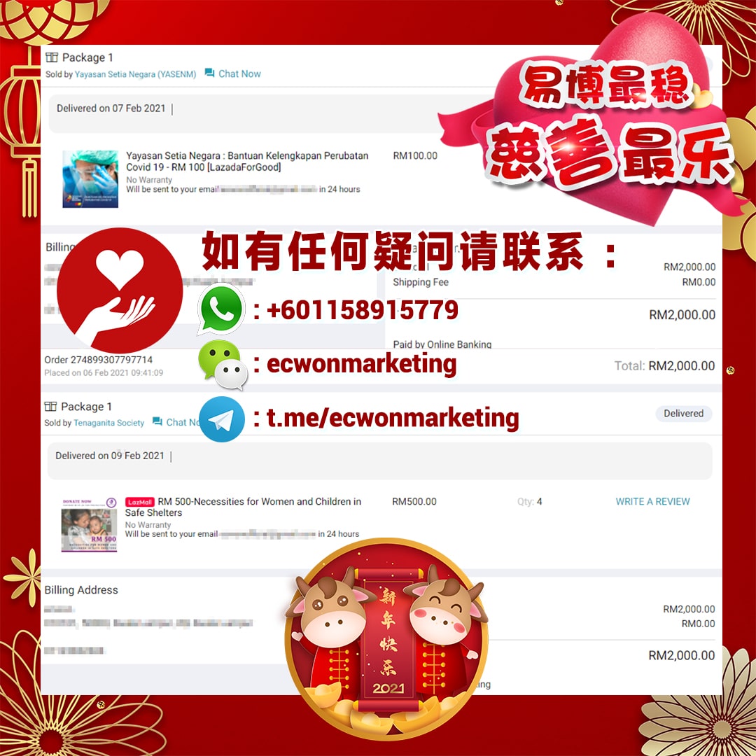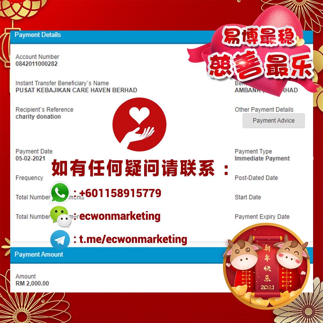 ×DATE UNITS MATTERS(Event/Case) AMOUNT RECEIPT 27/09/2025 One Hope Charity & Welfare September 2025 Donation RM 2,000 more 27/09/2025 One Hope Charity & Welfare September 2025 Donation RM 2,000 more 27/09/2025 UNICEF For Every Child September 2025 Donation RM 2,000 more 27/09/2025 Rayuan Tajaan Anak Yatim Gaza di bawah Projek Yatim KHOM September 2025 Donation RM 2,000 more 27/09/2025 Rayuan Kecemasan Susu Bayi Gaza September 2025 Donation RM 2,000 more 23/01/2024 Auntie Fong Lian (Give Malaysia) January 2024 Donation RM 2,000 more 23/01/2024 Baby Min Thant Chemotherapy Treatments (Give Malaysia) January 2024 Donation RM 2,000 more 23/01/2024 Give Acacia Fighting Chance (Give Malaysia) January 2024 Donation RM 2,000 more 23/01/2024 Haura Cancer Treatment (Give Malaysia) January 2024 Donation RM 2,000 more 23/01/2024 Raysha kidney Treatments (Give Malaysia) January 2024 Donation RM 2,000 more 29/08/2023 Nor Shahidah Heart Surgery August 2023 Donation RM 949.20 more 27/04/2023 Little Girl's Cancer Treatment April 2023 Donation RM 3,343 more 21/02/2023 GIVE Malaysia February 2023 Donation RM 5,000 more 15/12/2022 One Hope Charity & Welfa December 2022 Donation RM 10,000 more 12/07/2022 Lau Mei Jun July 2022 Donation RM 10,000 more 16/04/2022 Pusat Jagaan Kasih Sayang Prasanna April 2022 Donation RM 3,000 more 06/04/2022 Prakash Well Care Centre April 2022 Donation RM 10,000 more 28/03/2022 Yayasan Kebajikan Muslim - Low Xin Yu March 2022 Donation RM 3,000 more 14/02/2022 Puta Baramee Amulet Centre February 2022 Donation RM 2,000 more 31/12/2021 Pertubuhan Kebajikan Mu Zi Kuala Lumpur December Flood Relief RM 50,000 more 27/12/2021 7979 Volunteer Group December Flood Relief RM 6,383.71 more 26/12/2021 Prakash Well Care Centre December Donation RM 2,023.06 more 25/12/2021 Pertubuhan Kebajikan WSC December Flood Relief RM 33,000 more 08/12/2021 Details cannot be made public due to sensitive issues 2021 Qinghan Scholarship RM 10,000 more 31/10/2021 Kiew Lee Yun October Donation RM 2,000 more 14/10/2021 Wong Koy Lean October Donation RM 10,000 more 09/08/2021 Pertubuhan Kebajikan Shi Fang Johor Bahru Johor Urgent Donation for HFNC breathing tube RM 10,000 more 04/08/2021 Rumah Charis ECWON 6TH Anniversary Donation RM 2,000 more 04/08/2021 Be Home For Special Care ECWON 6TH Anniversary Donation RM 2,000 more 04/08/2021 Pusat Jagaan Sri Mesra-Mesra Home Ampang ECWON 6TH Anniversary Donation RM 2,000 more 04/08/2021 En Yuan Old Folk Home ECWON 6TH Anniversary Donation RM 2,000 more 04/08/2021 Association Yee Ran Jing Sheh Handicapped Children's Home ECWON 6TH Anniversary Donation RM 2,000 more 04/08/2021 Penang Handicapped Welfare Association ECWON 6TH Anniversary Donation RM 2,000 more 04/08/2021 Persatuan Rumah Caring Kajang Selangor ECWON 6TH Anniversary Donation RM 2,000 more 04/08/2021 Pertubuhan Kebajikan Orang Tua Cacat Dan Kurang Upaya Taman Connaught ECWON 6TH Anniversary Donation RM 2,000 more 04/08/2021 Pertubuhan Kebajikan Orang Tua Wen Xin ECWON 6TH Anniversary Donation RM 2,000 more 04/08/2021 Pusat Penjagaan Warga Emas Chan ECWON 6TH Anniversary Donation RM 2,000 more 04/08/2021 St. Nicholas' Home ECWON 6TH Anniversary Donation RM 2,000 more 04/08/2021 Pertubuhan Amal Uncle Kentang Malaysia ECWON 6TH Anniversary Donation RM 2,000 more 20/07/2021 White Flag Campaign ECWON 6TH Anniversary Donation RM 6,210.90 more 19/07/2021 Persatuan Kebajikan Amal Da Ai Malaysia Jul'21 Donation RM 1,000 more 01/06/2021 Klang Valley Elderly and Disability Center Klang Valley Elderly and Disability Donation RM 10,000 more 09/02/2021 Pertubuhan Amal Uncle Kentang Malaysia February Donation RM 10,000 more 09/02/2021 Persatuan Kebajikan Prihatin Kuan Yin February Donation RM 3,000 more 09/02/2021 Pkbb Shuang Fu JB February Donation RM 3,000 more 09/02/2021 Pertubuhan Kebajikan Amal Charis Mantin February Donation RM 3,000 more 09/02/2021 Persatuan Kebajikan Warga Emas Ci Shan February Donation RM 3,000 more 09/02/2021 Pertubuhan Pengurusan Rumah Anak-anak Yatim Dan Miskin "Anning" February Donation RM 3,000 more 09/02/2021 Kuching Life Care Society February Donation RM 2,000 more 06/02/2021 NGOhub February Donation RM 2,000 more 06/02/2021 Tenaganita Society February Donation RM 2,000 more 06/02/2021 Yayasan Setia Negara February Donation RM 2,000 more 06/02/2021 Hopis Malaysia February Donation RM 2,000 more 06/02/2021 Pusat Perubatan Universiti Malaya February Donation RM 2,000 more 06/02/2021 Respons Malaysia February Donation RM 2,000 more 06/02/2021 The Lost Food Project February Donation RM 2,000 more 06/02/2021 Unicef February Donation RM 2,000 more 06/02/2021 Protect and Save The Children February Donation RM 3,000 more 06/02/2021 MERCY Malaysia February Donation RM 3,000 more 05/02/2021 Persatuan Kebajikan Ler See February Donation RM 2,000 more 05/02/2021 Persatuan Kebajikan Kanak-kanak OKU Bayan Lebas Pulau Pinang February Donation RM 2,000 more 05/02/2021 Persatuan Insan Istimewa Cheras Selangor February Donation RM 2,000 more 05/02/2021 Persatuan Kebajikan Kanak-kanak Terencat Akal Malaysia February Donation RM 2,000 more 05/02/2021 Pertubuhan Kebajikan Shi Fang Johor February Donation RM 2,000 more 05/02/2021 Pusat Jagaan Kasih Sayang Prasanna February Donation RM 2,000 more 05/02/2021 Pusat Jagaan Kasih Sayang Angel February Donation RM 2,000 more 05/02/2021 Rumah Orang-orang Tua Seri Setia February Donation RM 2,000 more 05/02/2021 Pusat Kebajikan Care Haven Bhd February Donation RM 2,000 more 05/02/2021 Pertubuhan Kebajikan Orang Tua Yi Xing February Donation RM 3,000 more 05/02/2021 Pertubuhan Kebajikan Orang Tua Wen Xin February Donation RM 3,000 more 05/02/2021 Pertubuhan Kebajikan Orang Tua Cacat Dan Kurang Upaya Taman Connaught February Donation RM 3,000 more 05/02/2021 Pusat Penjagaan Warga Emas Chan February Donation RM 3,000 more 05/02/2021 Shine Home February Donation RM 3,000 more 05/02/2021 Pertubuhan Kebajikan Insan Istimewa Kuala Lumpur February Donation RM 3,000 more 05/02/