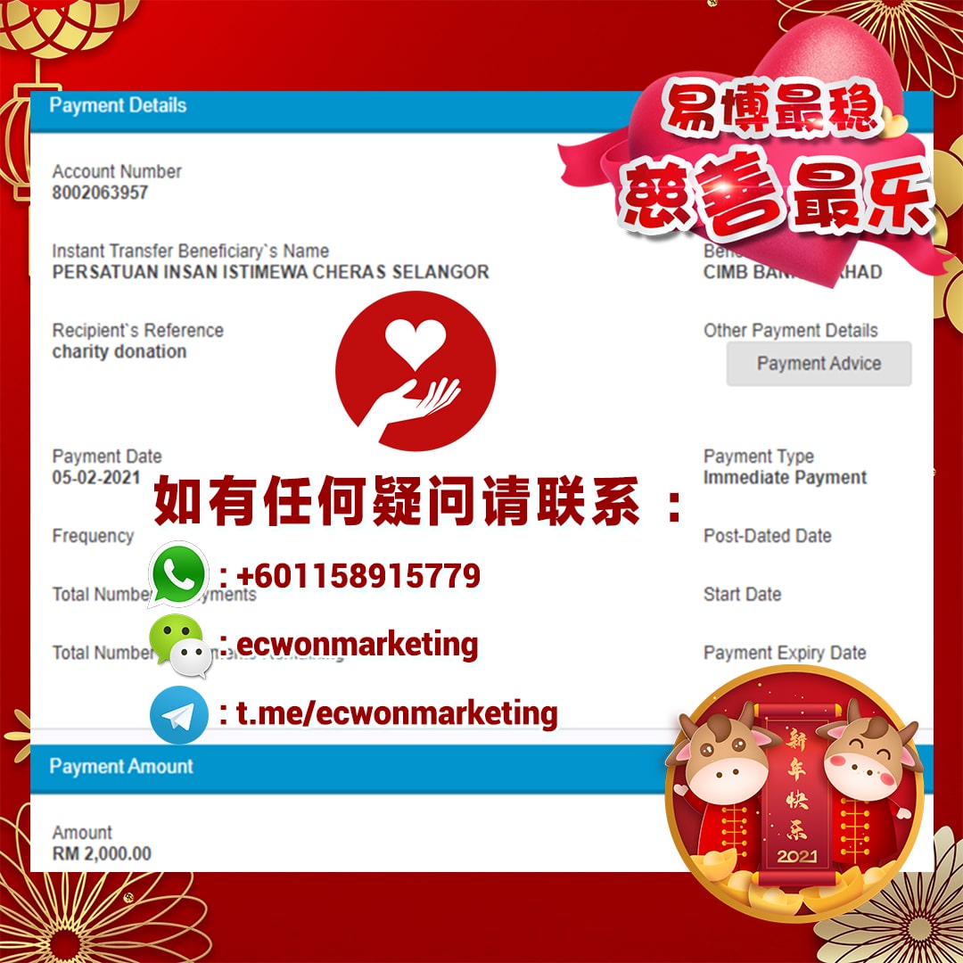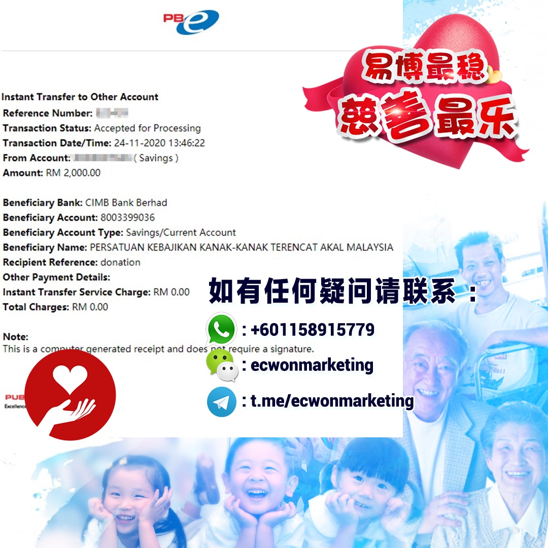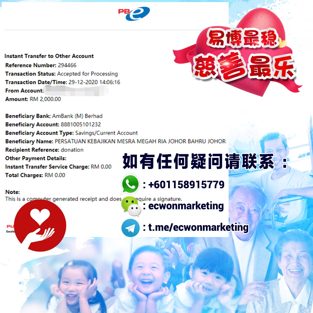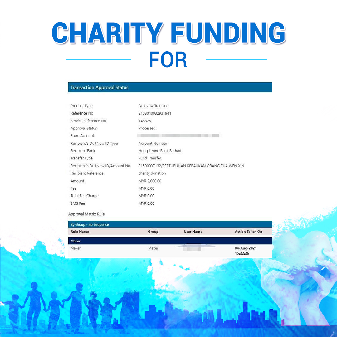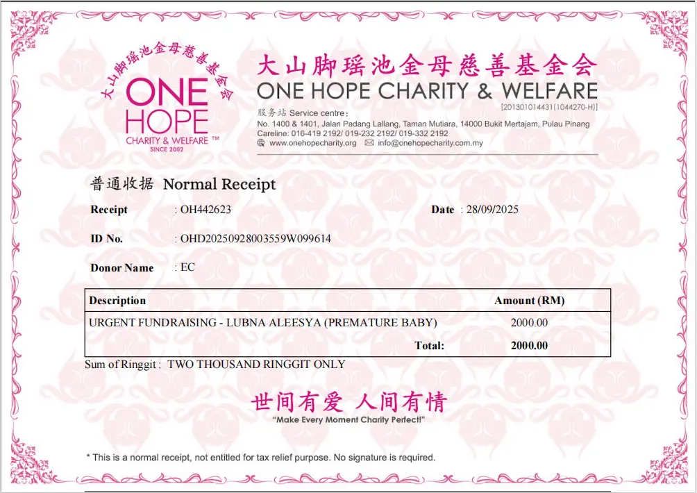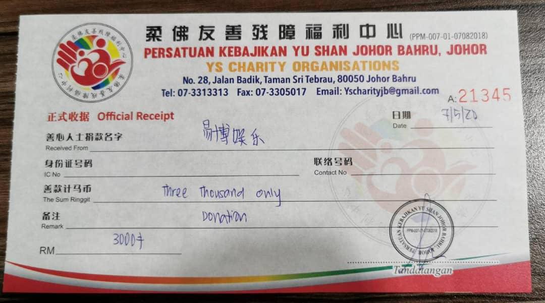 ×DATE UNITS MATTERS(Event/Case) AMOUNT RECEIPT 27/09/2025 One Hope Charity & Welfare September 2025 Donation RM 2,000 more 27/09/2025 One Hope Charity & Welfare September 2025 Donation RM 2,000 more 27/09/2025 UNICEF For Every Child September 2025 Donation RM 2,000 more 27/09/2025 Rayuan Tajaan Anak Yatim Gaza di bawah Projek Yatim KHOM September 2025 Donation RM 2,000 more 27/09/2025 Rayuan Kecemasan Susu Bayi Gaza September 2025 Donation RM 2,000 more 23/01/2024 Auntie Fong Lian (Give Malaysia) January 2024 Donation RM 2,000 more 23/01/2024 Baby Min Thant Chemotherapy Treatments (Give Malaysia) January 2024 Donation RM 2,000 more 23/01/2024 Give Acacia Fighting Chance (Give Malaysia) January 2024 Donation RM 2,000 more 23/01/2024 Haura Cancer Treatment (Give Malaysia) January 2024 Donation RM 2,000 more 23/01/2024 Raysha kidney Treatments (Give Malaysia) January 2024 Donation RM 2,000 more 29/08/2023 Nor Shahidah Heart Surgery August 2023 Donation RM 949.20 more 27/04/2023 Little Girl's Cancer Treatment April 2023 Donation RM 3,343 more 21/02/2023 GIVE Malaysia February 2023 Donation RM 5,000 more 15/12/2022 One Hope Charity & Welfa December 2022 Donation RM 10,000 more 12/07/2022 Lau Mei Jun July 2022 Donation RM 10,000 more 16/04/2022 Pusat Jagaan Kasih Sayang Prasanna April 2022 Donation RM 3,000 more 06/04/2022 Prakash Well Care Centre April 2022 Donation RM 10,000 more 28/03/2022 Yayasan Kebajikan Muslim - Low Xin Yu March 2022 Donation RM 3,000 more 14/02/2022 Puta Baramee Amulet Centre February 2022 Donation RM 2,000 more 31/12/2021 Pertubuhan Kebajikan Mu Zi Kuala Lumpur December Flood Relief RM 50,000 more 27/12/2021 7979 Volunteer Group December Flood Relief RM 6,383.71 more 26/12/2021 Prakash Well Care Centre December Donation RM 2,023.06 more 25/12/2021 Pertubuhan Kebajikan WSC December Flood Relief RM 33,000 more 08/12/2021 Details cannot be made public due to sensitive issues 2021 Qinghan Scholarship RM 10,000 more 31/10/2021 Kiew Lee Yun October Donation RM 2,000 more 14/10/2021 Wong Koy Lean October Donation RM 10,000 more 09/08/2021 Pertubuhan Kebajikan Shi Fang Johor Bahru Johor Urgent Donation for HFNC breathing tube RM 10,000 more 04/08/2021 Rumah Charis ECWON 6TH Anniversary Donation RM 2,000 more 04/08/2021 Be Home For Special Care ECWON 6TH Anniversary Donation RM 2,000 more 04/08/2021 Pusat Jagaan Sri Mesra-Mesra Home Ampang ECWON 6TH Anniversary Donation RM 2,000 more 04/08/2021 En Yuan Old Folk Home ECWON 6TH Anniversary Donation RM 2,000 more 04/08/2021 Association Yee Ran Jing Sheh Handicapped Children's Home ECWON 6TH Anniversary Donation RM 2,000 more 04/08/2021 Penang Handicapped Welfare Association ECWON 6TH Anniversary Donation RM 2,000 more 04/08/2021 Persatuan Rumah Caring Kajang Selangor ECWON 6TH Anniversary Donation RM 2,000 more 04/08/2021 Pertubuhan Kebajikan Orang Tua Cacat Dan Kurang Upaya Taman Connaught ECWON 6TH Anniversary Donation RM 2,000 more 04/08/2021 Pertubuhan Kebajikan Orang Tua Wen Xin ECWON 6TH Anniversary Donation RM 2,000 more 04/08/2021 Pusat Penjagaan Warga Emas Chan ECWON 6TH Anniversary Donation RM 2,000 more 04/08/2021 St. Nicholas' Home ECWON 6TH Anniversary Donation RM 2,000 more 04/08/2021 Pertubuhan Amal Uncle Kentang Malaysia ECWON 6TH Anniversary Donation RM 2,000 more 20/07/2021 White Flag Campaign ECWON 6TH Anniversary Donation RM 6,210.90 more 19/07/2021 Persatuan Kebajikan Amal Da Ai Malaysia Jul'21 Donation RM 1,000 more 01/06/2021 Klang Valley Elderly and Disability Center Klang Valley Elderly and Disability Donation RM 10,000 more 09/02/2021 Pertubuhan Amal Uncle Kentang Malaysia February Donation RM 10,000 more 09/02/2021 Persatuan Kebajikan Prihatin Kuan Yin February Donation RM 3,000 more 09/02/2021 Pkbb Shuang Fu JB February Donation RM 3,000 more 09/02/2021 Pertubuhan Kebajikan Amal Charis Mantin February Donation RM 3,000 more 09/02/2021 Persatuan Kebajikan Warga Emas Ci Shan February Donation RM 3,000 more 09/02/2021 Pertubuhan Pengurusan Rumah Anak-anak Yatim Dan Miskin "Anning" February Donation RM 3,000 more 09/02/2021 Kuching Life Care Society February Donation RM 2,000 more 06/02/2021 NGOhub February Donation RM 2,000 more 06/02/2021 Tenaganita Society February Donation RM 2,000 more 06/02/2021 Yayasan Setia Negara February Donation RM 2,000 more 06/02/2021 Hopis Malaysia February Donation RM 2,000 more 06/02/2021 Pusat Perubatan Universiti Malaya February Donation RM 2,000 more 06/02/2021 Respons Malaysia February Donation RM 2,000 more 06/02/2021 The Lost Food Project February Donation RM 2,000 more 06/02/2021 Unicef February Donation RM 2,000 more 06/02/2021 Protect and Save The Children February Donation RM 3,000 more 06/02/2021 MERCY Malaysia February Donation RM 3,000 more 05/02/2021 Persatuan Kebajikan Ler See February Donation RM 2,000 more 05/02/2021 Persatuan Kebajikan Kanak-kanak OKU Bayan Lebas Pulau Pinang February Donation RM 2,000 more 05/02/2021 Persatuan Insan Istimewa Cheras Selangor February Donation RM 2,000 more 05/02/2021 Persatuan Kebajikan Kanak-kanak Terencat Akal Malaysia February Donation RM 2,000 more 05/02/2021 Pertubuhan Kebajikan Shi Fang Johor February Donation RM 2,000 more 05/02/2021 Pusat Jagaan Kasih Sayang Prasanna February Donation RM 2,000 more 05/02/2021 Pusat Jagaan Kasih Sayang Angel February Donation RM 2,000 more 05/02/2021 Rumah Orang-orang Tua Seri Setia February Donation RM 2,000 more 05/02/2021 Pusat Kebajikan Care Haven Bhd February Donation RM 2,000 more 05/02/2021 Pertubuhan Kebajikan Orang Tua Yi Xing February Donation RM 3,000 more 05/02/2021 Pertubuhan Kebajikan Orang Tua Wen Xin February Donation RM 3,000 more 05/02/2021 Pertubuhan Kebajikan Orang Tua Cacat Dan Kurang Upaya Taman Connaught February Donation RM 3,000 more 05/02/2021 Pusat Penjagaan Warga Emas Chan February Donation RM 3,000 more 05/02/2021 Shine Home February Donation RM 3,000 more 05/02/2021 Pertubuhan Kebajikan Insan Istimewa Kuala Lumpur February Donation RM 3,000 more 05/02/