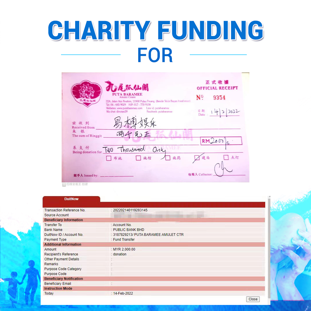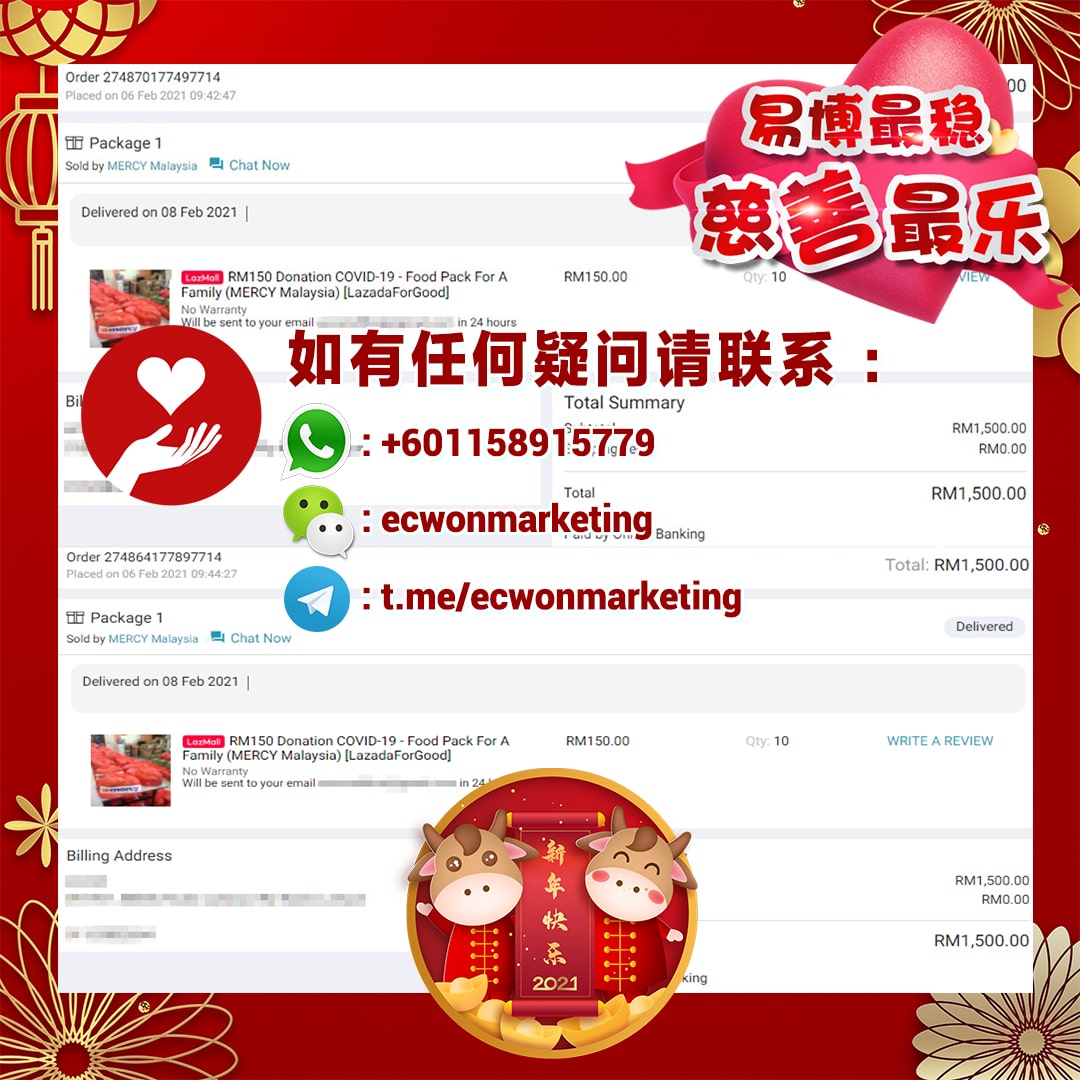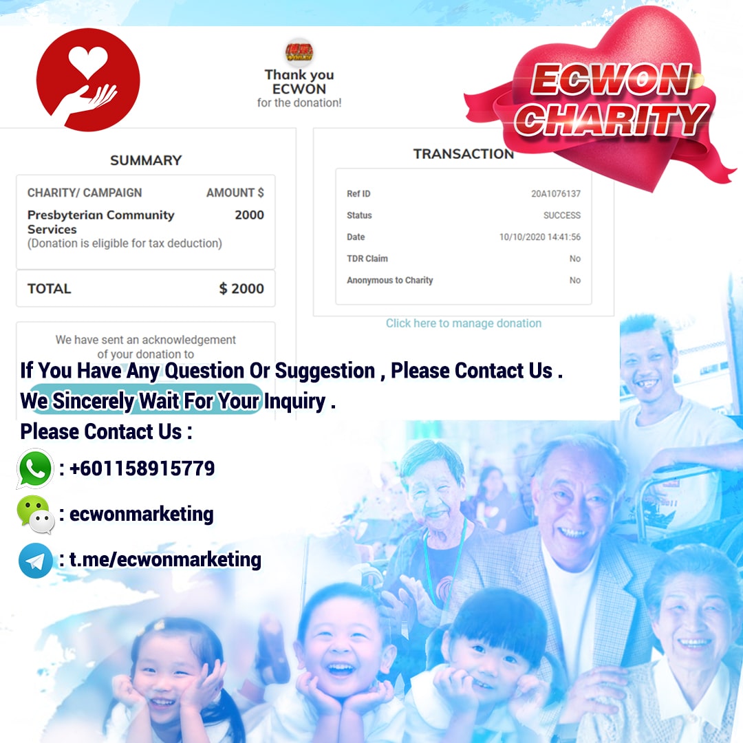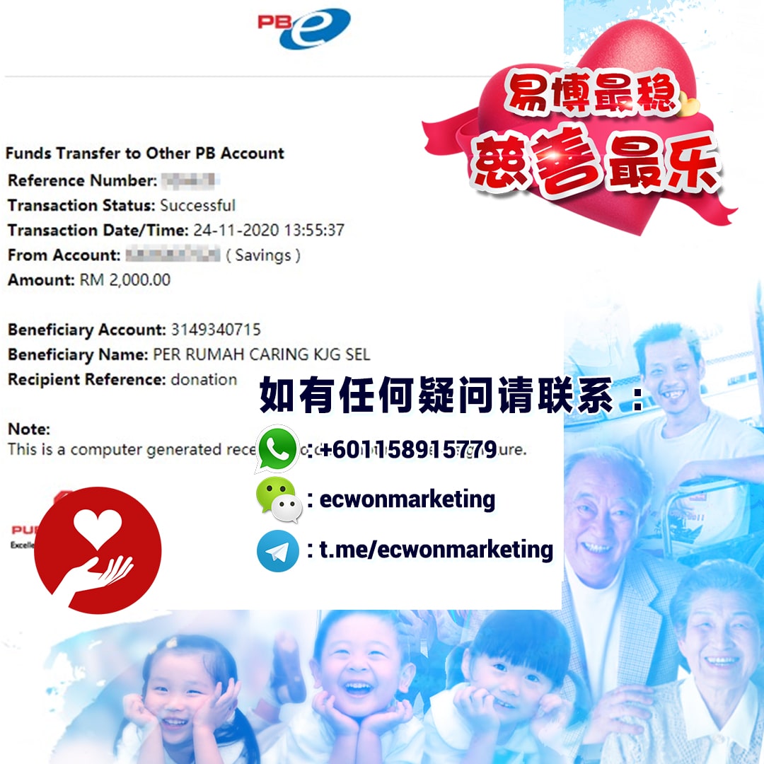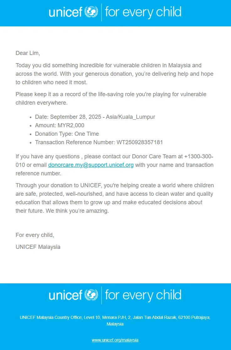 ×DATE UNITS MATTERS(Event/Case) AMOUNT RECEIPT 27/09/2025 One Hope Charity & Welfare September 2025 Donation RM 2,000 more 27/09/2025 One Hope Charity & Welfare September 2025 Donation RM 2,000 more 27/09/2025 UNICEF For Every Child September 2025 Donation RM 2,000 more 27/09/2025 Rayuan Tajaan Anak Yatim Gaza di bawah Projek Yatim KHOM September 2025 Donation RM 2,000 more 27/09/2025 Rayuan Kecemasan Susu Bayi Gaza September 2025 Donation RM 2,000 more 23/01/2024 Auntie Fong Lian (Give Malaysia) January 2024 Donation RM 2,000 more 23/01/2024 Baby Min Thant Chemotherapy Treatments (Give Malaysia) January 2024 Donation RM 2,000 more 23/01/2024 Give Acacia Fighting Chance (Give Malaysia) January 2024 Donation RM 2,000 more 23/01/2024 Haura Cancer Treatment (Give Malaysia) January 2024 Donation RM 2,000 more 23/01/2024 Raysha kidney Treatments (Give Malaysia) January 2024 Donation RM 2,000 more 29/08/2023 Nor Shahidah Heart Surgery August 2023 Donation RM 949.20 more 27/04/2023 Little Girl's Cancer Treatment April 2023 Donation RM 3,343 more 21/02/2023 GIVE Malaysia February 2023 Donation RM 5,000 more 15/12/2022 One Hope Charity & Welfa December 2022 Donation RM 10,000 more 12/07/2022 Lau Mei Jun July 2022 Donation RM 10,000 more 16/04/2022 Pusat Jagaan Kasih Sayang Prasanna April 2022 Donation RM 3,000 more 06/04/2022 Prakash Well Care Centre April 2022 Donation RM 10,000 more 28/03/2022 Yayasan Kebajikan Muslim - Low Xin Yu March 2022 Donation RM 3,000 more 14/02/2022 Puta Baramee Amulet Centre February 2022 Donation RM 2,000 more 31/12/2021 Pertubuhan Kebajikan Mu Zi Kuala Lumpur December Flood Relief RM 50,000 more 27/12/2021 7979 Volunteer Group December Flood Relief RM 6,383.71 more 26/12/2021 Prakash Well Care Centre December Donation RM 2,023.06 more 25/12/2021 Pertubuhan Kebajikan WSC December Flood Relief RM 33,000 more 08/12/2021 Details cannot be made public due to sensitive issues 2021 Qinghan Scholarship RM 10,000 more 31/10/2021 Kiew Lee Yun October Donation RM 2,000 more 14/10/2021 Wong Koy Lean October Donation RM 10,000 more 09/08/2021 Pertubuhan Kebajikan Shi Fang Johor Bahru Johor Urgent Donation for HFNC breathing tube RM 10,000 more 04/08/2021 Rumah Charis ECWON 6TH Anniversary Donation RM 2,000 more 04/08/2021 Be Home For Special Care ECWON 6TH Anniversary Donation RM 2,000 more 04/08/2021 Pusat Jagaan Sri Mesra-Mesra Home Ampang ECWON 6TH Anniversary Donation RM 2,000 more 04/08/2021 En Yuan Old Folk Home ECWON 6TH Anniversary Donation RM 2,000 more 04/08/2021 Association Yee Ran Jing Sheh Handicapped Children's Home ECWON 6TH Anniversary Donation RM 2,000 more 04/08/2021 Penang Handicapped Welfare Association ECWON 6TH Anniversary Donation RM 2,000 more 04/08/2021 Persatuan Rumah Caring Kajang Selangor ECWON 6TH Anniversary Donation RM 2,000 more 04/08/2021 Pertubuhan Kebajikan Orang Tua Cacat Dan Kurang Upaya Taman Connaught ECWON 6TH Anniversary Donation RM 2,000 more 04/08/2021 Pertubuhan Kebajikan Orang Tua Wen Xin ECWON 6TH Anniversary Donation RM 2,000 more 04/08/2021 Pusat Penjagaan Warga Emas Chan ECWON 6TH Anniversary Donation RM 2,000 more 04/08/2021 St. Nicholas' Home ECWON 6TH Anniversary Donation RM 2,000 more 04/08/2021 Pertubuhan Amal Uncle Kentang Malaysia ECWON 6TH Anniversary Donation RM 2,000 more 20/07/2021 White Flag Campaign ECWON 6TH Anniversary Donation RM 6,210.90 more 19/07/2021 Persatuan Kebajikan Amal Da Ai Malaysia Jul'21 Donation RM 1,000 more 01/06/2021 Klang Valley Elderly and Disability Center Klang Valley Elderly and Disability Donation RM 10,000 more 09/02/2021 Pertubuhan Amal Uncle Kentang Malaysia February Donation RM 10,000 more 09/02/2021 Persatuan Kebajikan Prihatin Kuan Yin February Donation RM 3,000 more 09/02/2021 Pkbb Shuang Fu JB February Donation RM 3,000 more 09/02/2021 Pertubuhan Kebajikan Amal Charis Mantin February Donation RM 3,000 more 09/02/2021 Persatuan Kebajikan Warga Emas Ci Shan February Donation RM 3,000 more 09/02/2021 Pertubuhan Pengurusan Rumah Anak-anak Yatim Dan Miskin "Anning" February Donation RM 3,000 more 09/02/2021 Kuching Life Care Society February Donation RM 2,000 more 06/02/2021 NGOhub February Donation RM 2,000 more 06/02/2021 Tenaganita Society February Donation RM 2,000 more 06/02/2021 Yayasan Setia Negara February Donation RM 2,000 more 06/02/2021 Hopis Malaysia February Donation RM 2,000 more 06/02/2021 Pusat Perubatan Universiti Malaya February Donation RM 2,000 more 06/02/2021 Respons Malaysia February Donation RM 2,000 more 06/02/2021 The Lost Food Project February Donation RM 2,000 more 06/02/2021 Unicef February Donation RM 2,000 more 06/02/2021 Protect and Save The Children February Donation RM 3,000 more 06/02/2021 MERCY Malaysia February Donation RM 3,000 more 05/02/2021 Persatuan Kebajikan Ler See February Donation RM 2,000 more 05/02/2021 Persatuan Kebajikan Kanak-kanak OKU Bayan Lebas Pulau Pinang February Donation RM 2,000 more 05/02/2021 Persatuan Insan Istimewa Cheras Selangor February Donation RM 2,000 more 05/02/2021 Persatuan Kebajikan Kanak-kanak Terencat Akal Malaysia February Donation RM 2,000 more 05/02/2021 Pertubuhan Kebajikan Shi Fang Johor February Donation RM 2,000 more 05/02/2021 Pusat Jagaan Kasih Sayang Prasanna February Donation RM 2,000 more 05/02/2021 Pusat Jagaan Kasih Sayang Angel February Donation RM 2,000 more 05/02/2021 Rumah Orang-orang Tua Seri Setia February Donation RM 2,000 more 05/02/2021 Pusat Kebajikan Care Haven Bhd February Donation RM 2,000 more 05/02/2021 Pertubuhan Kebajikan Orang Tua Yi Xing February Donation RM 3,000 more 05/02/2021 Pertubuhan Kebajikan Orang Tua Wen Xin February Donation RM 3,000 more 05/02/2021 Pertubuhan Kebajikan Orang Tua Cacat Dan Kurang Upaya Taman Connaught February Donation RM 3,000 more 05/02/2021 Pusat Penjagaan Warga Emas Chan February Donation RM 3,000 more 05/02/2021 Shine Home February Donation RM 3,000 more 05/02/2021 Pertubuhan Kebajikan Insan Istimewa Kuala Lumpur February Donation RM 3,000 more 05/02/