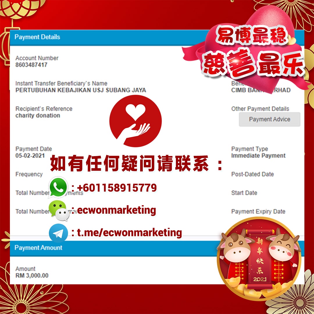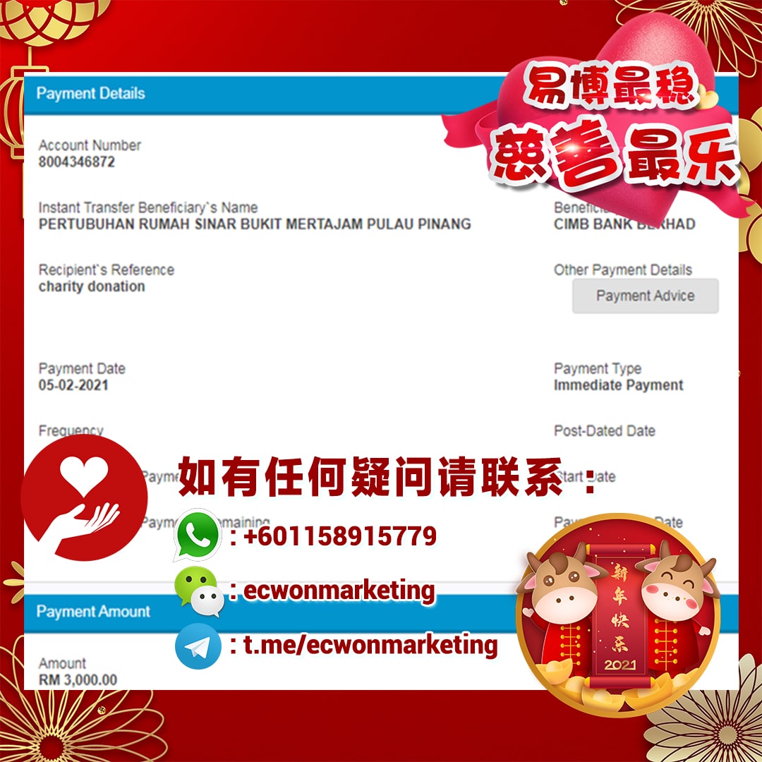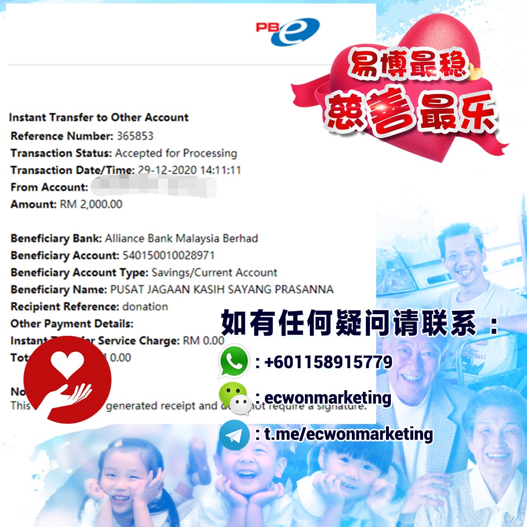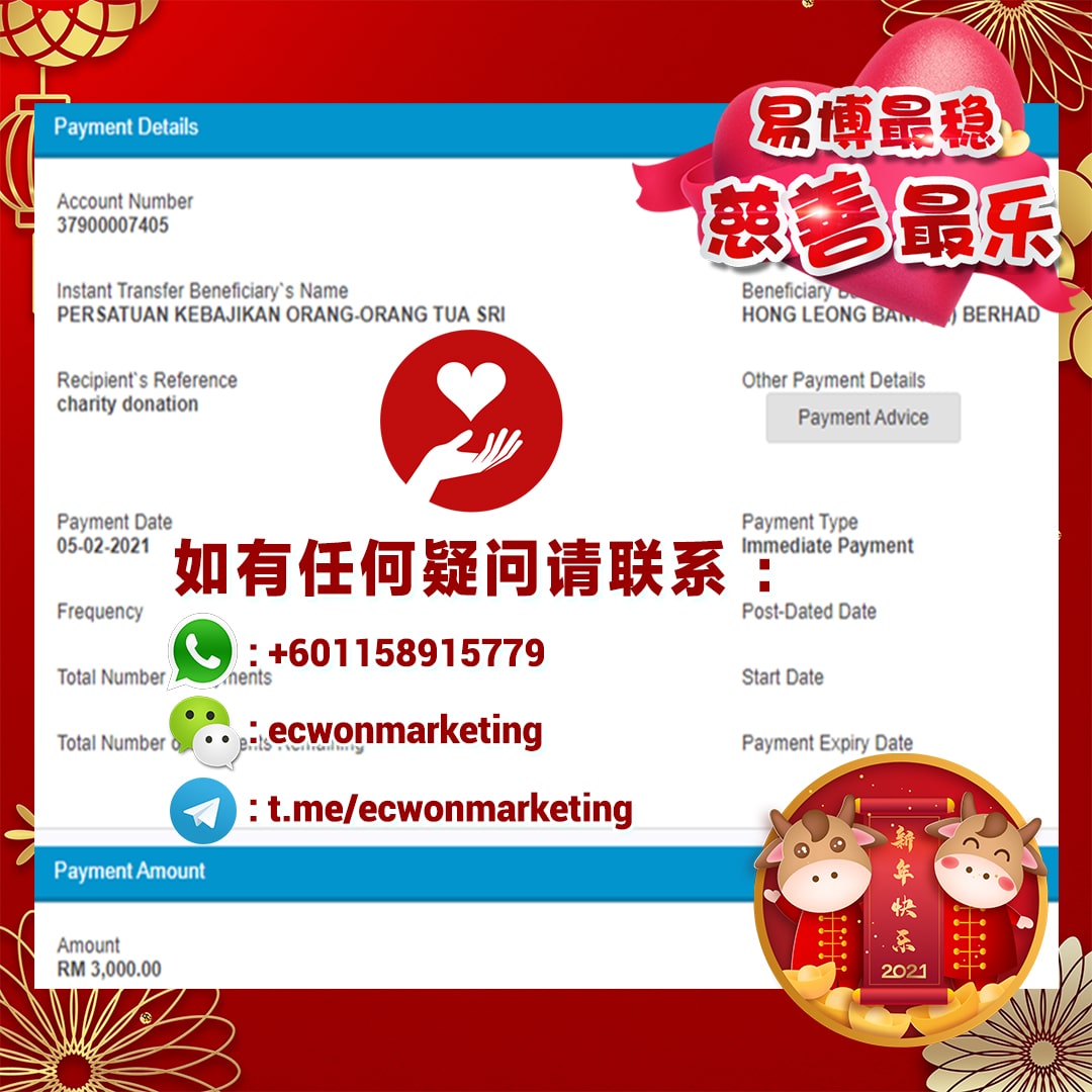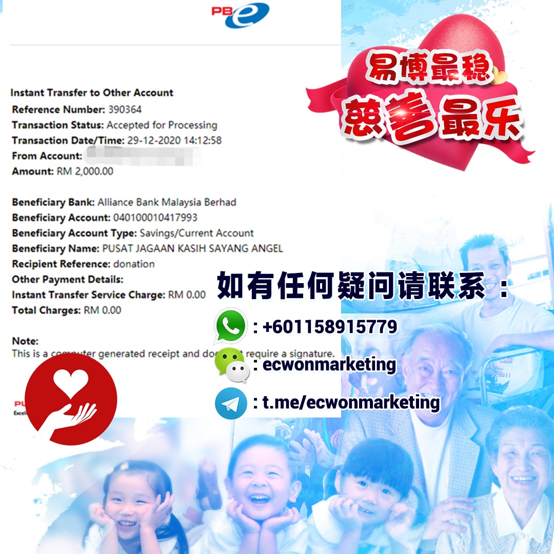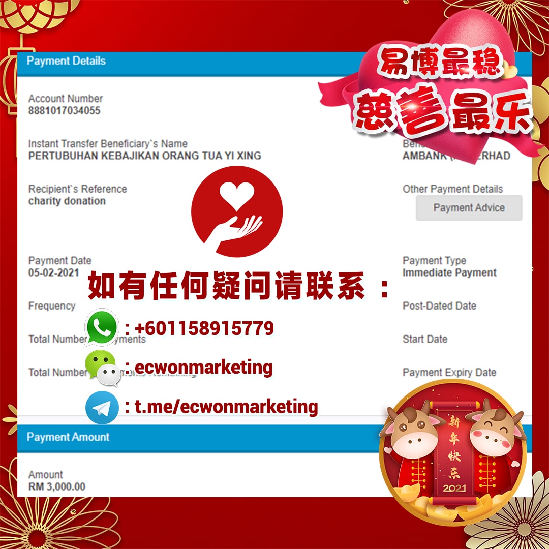 ×DATE UNITS MATTERS(Event/Case) AMOUNT RECEIPT 27/09/2025 One Hope Charity & Welfare September 2025 Donation RM 2,000 more 27/09/2025 One Hope Charity & Welfare September 2025 Donation RM 2,000 more 27/09/2025 UNICEF For Every Child September 2025 Donation RM 2,000 more 27/09/2025 Rayuan Tajaan Anak Yatim Gaza di bawah Projek Yatim KHOM September 2025 Donation RM 2,000 more 27/09/2025 Rayuan Kecemasan Susu Bayi Gaza September 2025 Donation RM 2,000 more 23/01/2024 Auntie Fong Lian (Give Malaysia) January 2024 Donation RM 2,000 more 23/01/2024 Baby Min Thant Chemotherapy Treatments (Give Malaysia) January 2024 Donation RM 2,000 more 23/01/2024 Give Acacia Fighting Chance (Give Malaysia) January 2024 Donation RM 2,000 more 23/01/2024 Haura Cancer Treatment (Give Malaysia) January 2024 Donation RM 2,000 more 23/01/2024 Raysha kidney Treatments (Give Malaysia) January 2024 Donation RM 2,000 more 29/08/2023 Nor Shahidah Heart Surgery August 2023 Donation RM 949.20 more 27/04/2023 Little Girl's Cancer Treatment April 2023 Donation RM 3,343 more 21/02/2023 GIVE Malaysia February 2023 Donation RM 5,000 more 15/12/2022 One Hope Charity & Welfa December 2022 Donation RM 10,000 more 12/07/2022 Lau Mei Jun July 2022 Donation RM 10,000 more 16/04/2022 Pusat Jagaan Kasih Sayang Prasanna April 2022 Donation RM 3,000 more 06/04/2022 Prakash Well Care Centre April 2022 Donation RM 10,000 more 28/03/2022 Yayasan Kebajikan Muslim - Low Xin Yu March 2022 Donation RM 3,000 more 14/02/2022 Puta Baramee Amulet Centre February 2022 Donation RM 2,000 more 31/12/2021 Pertubuhan Kebajikan Mu Zi Kuala Lumpur December Flood Relief RM 50,000 more 27/12/2021 7979 Volunteer Group December Flood Relief RM 6,383.71 more 26/12/2021 Prakash Well Care Centre December Donation RM 2,023.06 more 25/12/2021 Pertubuhan Kebajikan WSC December Flood Relief RM 33,000 more 08/12/2021 Details cannot be made public due to sensitive issues 2021 Qinghan Scholarship RM 10,000 more 31/10/2021 Kiew Lee Yun October Donation RM 2,000 more 14/10/2021 Wong Koy Lean October Donation RM 10,000 more 09/08/2021 Pertubuhan Kebajikan Shi Fang Johor Bahru Johor Urgent Donation for HFNC breathing tube RM 10,000 more 04/08/2021 Rumah Charis ECWON 6TH Anniversary Donation RM 2,000 more 04/08/2021 Be Home For Special Care ECWON 6TH Anniversary Donation RM 2,000 more 04/08/2021 Pusat Jagaan Sri Mesra-Mesra Home Ampang ECWON 6TH Anniversary Donation RM 2,000 more 04/08/2021 En Yuan Old Folk Home ECWON 6TH Anniversary Donation RM 2,000 more 04/08/2021 Association Yee Ran Jing Sheh Handicapped Children's Home ECWON 6TH Anniversary Donation RM 2,000 more 04/08/2021 Penang Handicapped Welfare Association ECWON 6TH Anniversary Donation RM 2,000 more 04/08/2021 Persatuan Rumah Caring Kajang Selangor ECWON 6TH Anniversary Donation RM 2,000 more 04/08/2021 Pertubuhan Kebajikan Orang Tua Cacat Dan Kurang Upaya Taman Connaught ECWON 6TH Anniversary Donation RM 2,000 more 04/08/2021 Pertubuhan Kebajikan Orang Tua Wen Xin ECWON 6TH Anniversary Donation RM 2,000 more 04/08/2021 Pusat Penjagaan Warga Emas Chan ECWON 6TH Anniversary Donation RM 2,000 more 04/08/2021 St. Nicholas' Home ECWON 6TH Anniversary Donation RM 2,000 more 04/08/2021 Pertubuhan Amal Uncle Kentang Malaysia ECWON 6TH Anniversary Donation RM 2,000 more 20/07/2021 White Flag Campaign ECWON 6TH Anniversary Donation RM 6,210.90 more 19/07/2021 Persatuan Kebajikan Amal Da Ai Malaysia Jul'21 Donation RM 1,000 more 01/06/2021 Klang Valley Elderly and Disability Center Klang Valley Elderly and Disability Donation RM 10,000 more 09/02/2021 Pertubuhan Amal Uncle Kentang Malaysia February Donation RM 10,000 more 09/02/2021 Persatuan Kebajikan Prihatin Kuan Yin February Donation RM 3,000 more 09/02/2021 Pkbb Shuang Fu JB February Donation RM 3,000 more 09/02/2021 Pertubuhan Kebajikan Amal Charis Mantin February Donation RM 3,000 more 09/02/2021 Persatuan Kebajikan Warga Emas Ci Shan February Donation RM 3,000 more 09/02/2021 Pertubuhan Pengurusan Rumah Anak-anak Yatim Dan Miskin "Anning" February Donation RM 3,000 more 09/02/2021 Kuching Life Care Society February Donation RM 2,000 more 06/02/2021 NGOhub February Donation RM 2,000 more 06/02/2021 Tenaganita Society February Donation RM 2,000 more 06/02/2021 Yayasan Setia Negara February Donation RM 2,000 more 06/02/2021 Hopis Malaysia February Donation RM 2,000 more 06/02/2021 Pusat Perubatan Universiti Malaya February Donation RM 2,000 more 06/02/2021 Respons Malaysia February Donation RM 2,000 more 06/02/2021 The Lost Food Project February Donation RM 2,000 more 06/02/2021 Unicef February Donation RM 2,000 more 06/02/2021 Protect and Save The Children February Donation RM 3,000 more 06/02/2021 MERCY Malaysia February Donation RM 3,000 more 05/02/2021 Persatuan Kebajikan Ler See February Donation RM 2,000 more 05/02/2021 Persatuan Kebajikan Kanak-kanak OKU Bayan Lebas Pulau Pinang February Donation RM 2,000 more 05/02/2021 Persatuan Insan Istimewa Cheras Selangor February Donation RM 2,000 more 05/02/2021 Persatuan Kebajikan Kanak-kanak Terencat Akal Malaysia February Donation RM 2,000 more 05/02/2021 Pertubuhan Kebajikan Shi Fang Johor February Donation RM 2,000 more 05/02/2021 Pusat Jagaan Kasih Sayang Prasanna February Donation RM 2,000 more 05/02/2021 Pusat Jagaan Kasih Sayang Angel February Donation RM 2,000 more 05/02/2021 Rumah Orang-orang Tua Seri Setia February Donation RM 2,000 more 05/02/2021 Pusat Kebajikan Care Haven Bhd February Donation RM 2,000 more 05/02/2021 Pertubuhan Kebajikan Orang Tua Yi Xing February Donation RM 3,000 more 05/02/2021 Pertubuhan Kebajikan Orang Tua Wen Xin February Donation RM 3,000 more 05/02/2021 Pertubuhan Kebajikan Orang Tua Cacat Dan Kurang Upaya Taman Connaught February Donation RM 3,000 more 05/02/2021 Pusat Penjagaan Warga Emas Chan February Donation RM 3,000 more 05/02/2021 Shine Home February Donation RM 3,000 more 05/02/2021 Pertubuhan Kebajikan Insan Istimewa Kuala Lumpur February Donation RM 3,000 more 05/02/