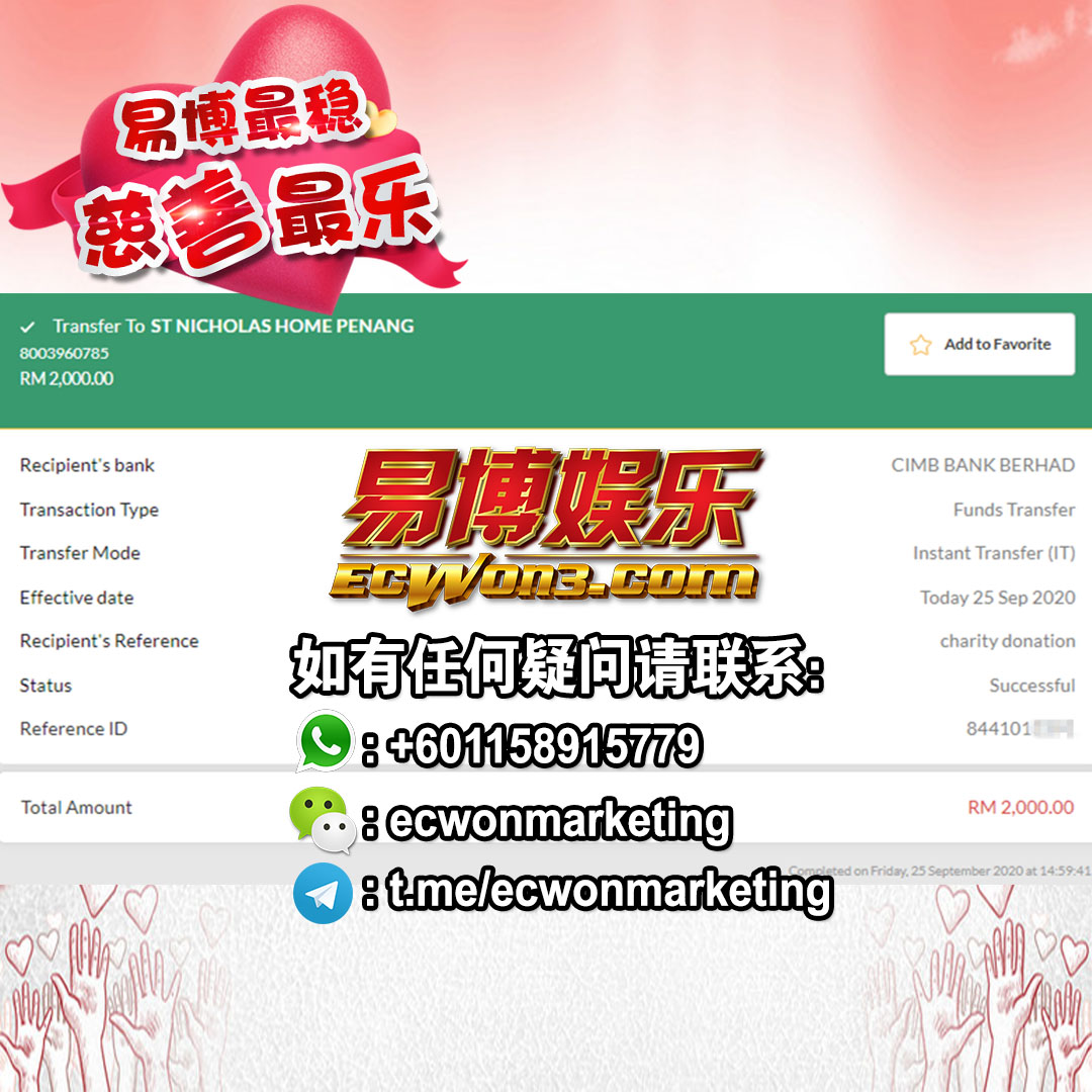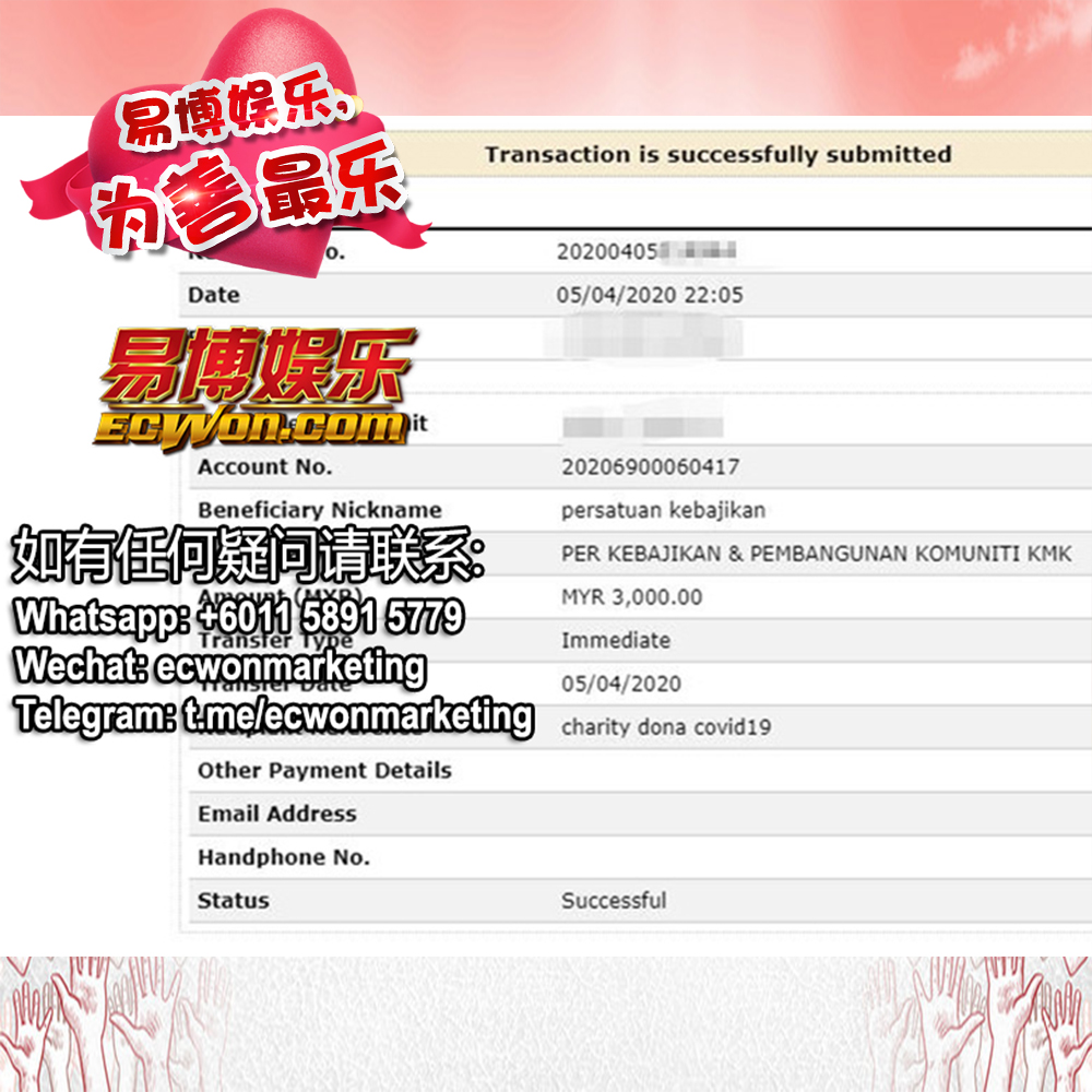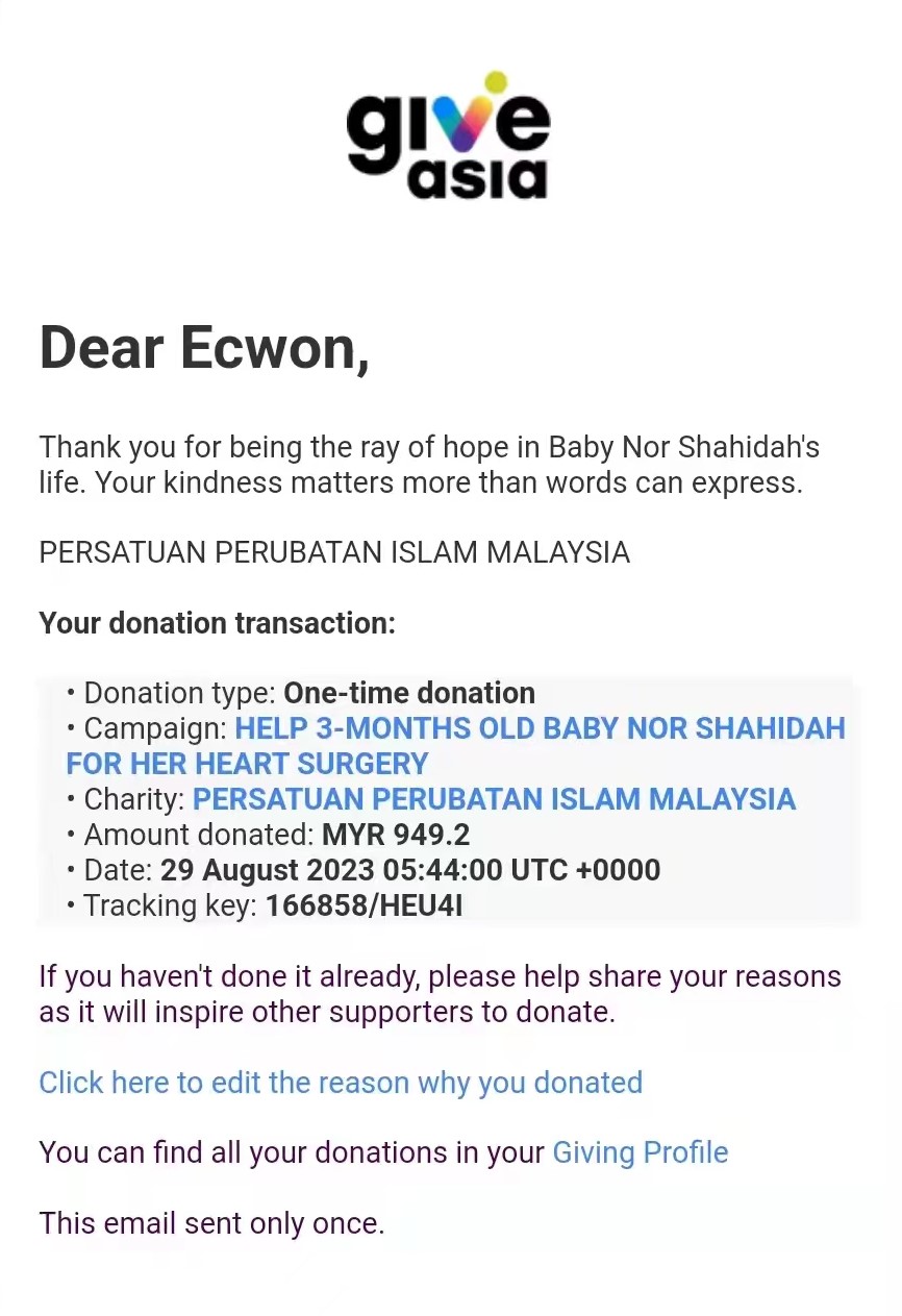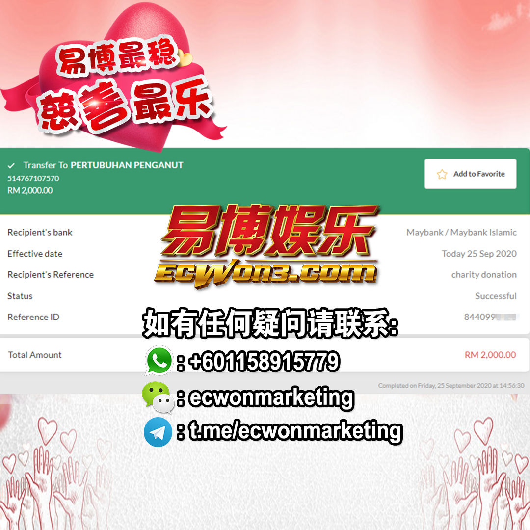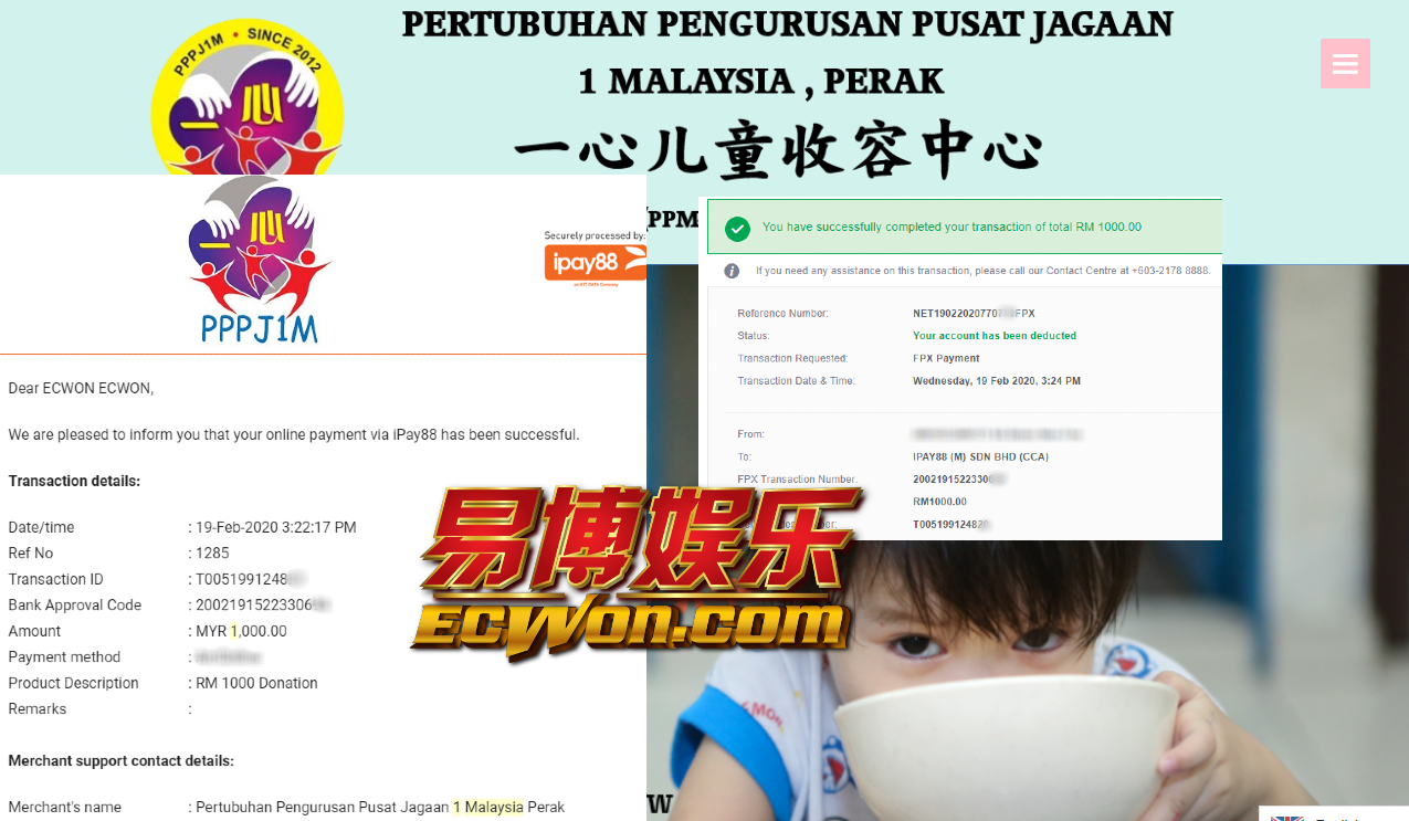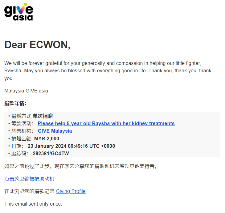 ×DATE UNITS MATTERS(Event/Case) AMOUNT RECEIPT 27/09/2025 One Hope Charity & Welfare September 2025 Donation RM 2,000 more 27/09/2025 One Hope Charity & Welfare September 2025 Donation RM 2,000 more 27/09/2025 UNICEF For Every Child September 2025 Donation RM 2,000 more 27/09/2025 Rayuan Tajaan Anak Yatim Gaza di bawah Projek Yatim KHOM September 2025 Donation RM 2,000 more 27/09/2025 Rayuan Kecemasan Susu Bayi Gaza September 2025 Donation RM 2,000 more 23/01/2024 Auntie Fong Lian (Give Malaysia) January 2024 Donation RM 2,000 more 23/01/2024 Baby Min Thant Chemotherapy Treatments (Give Malaysia) January 2024 Donation RM 2,000 more 23/01/2024 Give Acacia Fighting Chance (Give Malaysia) January 2024 Donation RM 2,000 more 23/01/2024 Haura Cancer Treatment (Give Malaysia) January 2024 Donation RM 2,000 more 23/01/2024 Raysha kidney Treatments (Give Malaysia) January 2024 Donation RM 2,000 more 29/08/2023 Nor Shahidah Heart Surgery August 2023 Donation RM 949.20 more 27/04/2023 Little Girl's Cancer Treatment April 2023 Donation RM 3,343 more 21/02/2023 GIVE Malaysia February 2023 Donation RM 5,000 more 15/12/2022 One Hope Charity & Welfa December 2022 Donation RM 10,000 more 12/07/2022 Lau Mei Jun July 2022 Donation RM 10,000 more 16/04/2022 Pusat Jagaan Kasih Sayang Prasanna April 2022 Donation RM 3,000 more 06/04/2022 Prakash Well Care Centre April 2022 Donation RM 10,000 more 28/03/2022 Yayasan Kebajikan Muslim - Low Xin Yu March 2022 Donation RM 3,000 more 14/02/2022 Puta Baramee Amulet Centre February 2022 Donation RM 2,000 more 31/12/2021 Pertubuhan Kebajikan Mu Zi Kuala Lumpur December Flood Relief RM 50,000 more 27/12/2021 7979 Volunteer Group December Flood Relief RM 6,383.71 more 26/12/2021 Prakash Well Care Centre December Donation RM 2,023.06 more 25/12/2021 Pertubuhan Kebajikan WSC December Flood Relief RM 33,000 more 08/12/2021 Details cannot be made public due to sensitive issues 2021 Qinghan Scholarship RM 10,000 more 31/10/2021 Kiew Lee Yun October Donation RM 2,000 more 14/10/2021 Wong Koy Lean October Donation RM 10,000 more 09/08/2021 Pertubuhan Kebajikan Shi Fang Johor Bahru Johor Urgent Donation for HFNC breathing tube RM 10,000 more 04/08/2021 Rumah Charis ECWON 6TH Anniversary Donation RM 2,000 more 04/08/2021 Be Home For Special Care ECWON 6TH Anniversary Donation RM 2,000 more 04/08/2021 Pusat Jagaan Sri Mesra-Mesra Home Ampang ECWON 6TH Anniversary Donation RM 2,000 more 04/08/2021 En Yuan Old Folk Home ECWON 6TH Anniversary Donation RM 2,000 more 04/08/2021 Association Yee Ran Jing Sheh Handicapped Children's Home ECWON 6TH Anniversary Donation RM 2,000 more 04/08/2021 Penang Handicapped Welfare Association ECWON 6TH Anniversary Donation RM 2,000 more 04/08/2021 Persatuan Rumah Caring Kajang Selangor ECWON 6TH Anniversary Donation RM 2,000 more 04/08/2021 Pertubuhan Kebajikan Orang Tua Cacat Dan Kurang Upaya Taman Connaught ECWON 6TH Anniversary Donation RM 2,000 more 04/08/2021 Pertubuhan Kebajikan Orang Tua Wen Xin ECWON 6TH Anniversary Donation RM 2,000 more 04/08/2021 Pusat Penjagaan Warga Emas Chan ECWON 6TH Anniversary Donation RM 2,000 more 04/08/2021 St. Nicholas' Home ECWON 6TH Anniversary Donation RM 2,000 more 04/08/2021 Pertubuhan Amal Uncle Kentang Malaysia ECWON 6TH Anniversary Donation RM 2,000 more 20/07/2021 White Flag Campaign ECWON 6TH Anniversary Donation RM 6,210.90 more 19/07/2021 Persatuan Kebajikan Amal Da Ai Malaysia Jul'21 Donation RM 1,000 more 01/06/2021 Klang Valley Elderly and Disability Center Klang Valley Elderly and Disability Donation RM 10,000 more 09/02/2021 Pertubuhan Amal Uncle Kentang Malaysia February Donation RM 10,000 more 09/02/2021 Persatuan Kebajikan Prihatin Kuan Yin February Donation RM 3,000 more 09/02/2021 Pkbb Shuang Fu JB February Donation RM 3,000 more 09/02/2021 Pertubuhan Kebajikan Amal Charis Mantin February Donation RM 3,000 more 09/02/2021 Persatuan Kebajikan Warga Emas Ci Shan February Donation RM 3,000 more 09/02/2021 Pertubuhan Pengurusan Rumah Anak-anak Yatim Dan Miskin "Anning" February Donation RM 3,000 more 09/02/2021 Kuching Life Care Society February Donation RM 2,000 more 06/02/2021 NGOhub February Donation RM 2,000 more 06/02/2021 Tenaganita Society February Donation RM 2,000 more 06/02/2021 Yayasan Setia Negara February Donation RM 2,000 more 06/02/2021 Hopis Malaysia February Donation RM 2,000 more 06/02/2021 Pusat Perubatan Universiti Malaya February Donation RM 2,000 more 06/02/2021 Respons Malaysia February Donation RM 2,000 more 06/02/2021 The Lost Food Project February Donation RM 2,000 more 06/02/2021 Unicef February Donation RM 2,000 more 06/02/2021 Protect and Save The Children February Donation RM 3,000 more 06/02/2021 MERCY Malaysia February Donation RM 3,000 more 05/02/2021 Persatuan Kebajikan Ler See February Donation RM 2,000 more 05/02/2021 Persatuan Kebajikan Kanak-kanak OKU Bayan Lebas Pulau Pinang February Donation RM 2,000 more 05/02/2021 Persatuan Insan Istimewa Cheras Selangor February Donation RM 2,000 more 05/02/2021 Persatuan Kebajikan Kanak-kanak Terencat Akal Malaysia February Donation RM 2,000 more 05/02/2021 Pertubuhan Kebajikan Shi Fang Johor February Donation RM 2,000 more 05/02/2021 Pusat Jagaan Kasih Sayang Prasanna February Donation RM 2,000 more 05/02/2021 Pusat Jagaan Kasih Sayang Angel February Donation RM 2,000 more 05/02/2021 Rumah Orang-orang Tua Seri Setia February Donation RM 2,000 more 05/02/2021 Pusat Kebajikan Care Haven Bhd February Donation RM 2,000 more 05/02/2021 Pertubuhan Kebajikan Orang Tua Yi Xing February Donation RM 3,000 more 05/02/2021 Pertubuhan Kebajikan Orang Tua Wen Xin February Donation RM 3,000 more 05/02/2021 Pertubuhan Kebajikan Orang Tua Cacat Dan Kurang Upaya Taman Connaught February Donation RM 3,000 more 05/02/2021 Pusat Penjagaan Warga Emas Chan February Donation RM 3,000 more 05/02/2021 Shine Home February Donation RM 3,000 more 05/02/2021 Pertubuhan Kebajikan Insan Istimewa Kuala Lumpur February Donation RM 3,000 more 05/02/