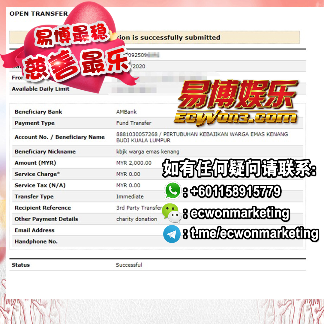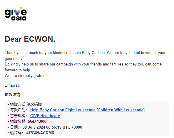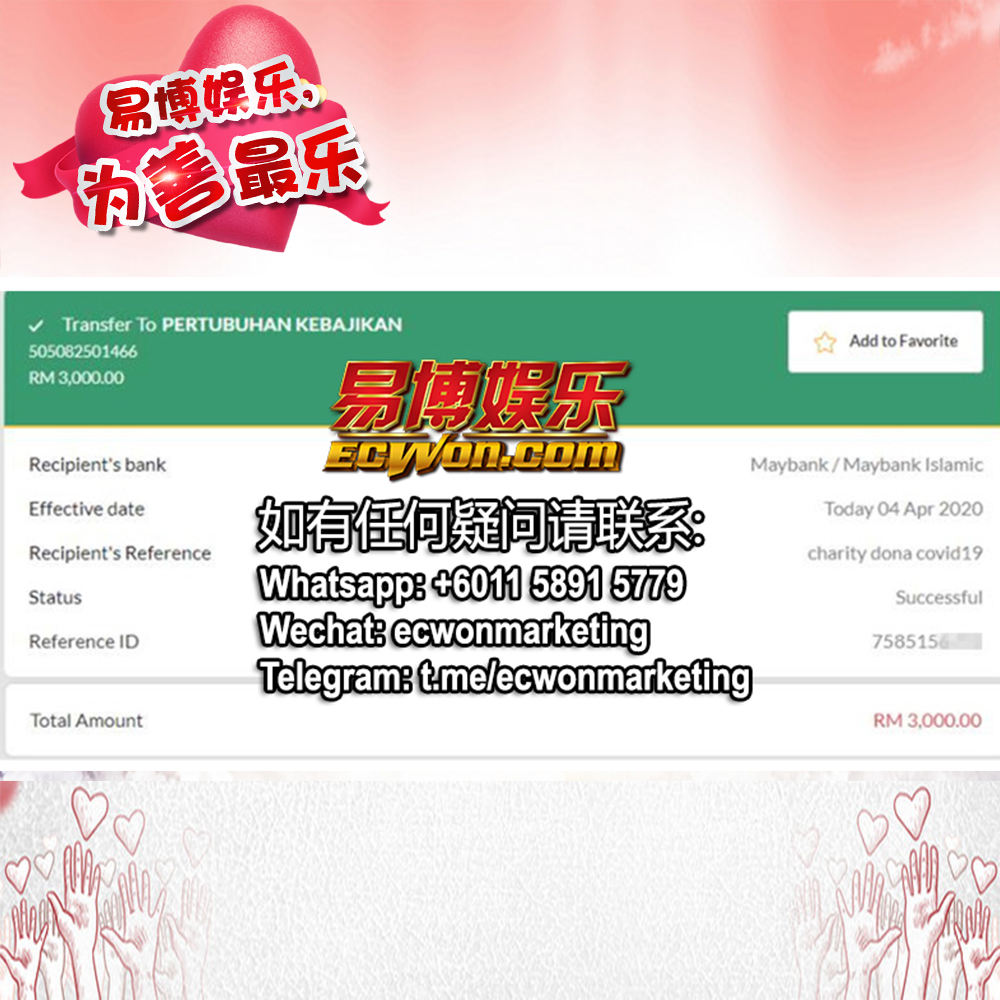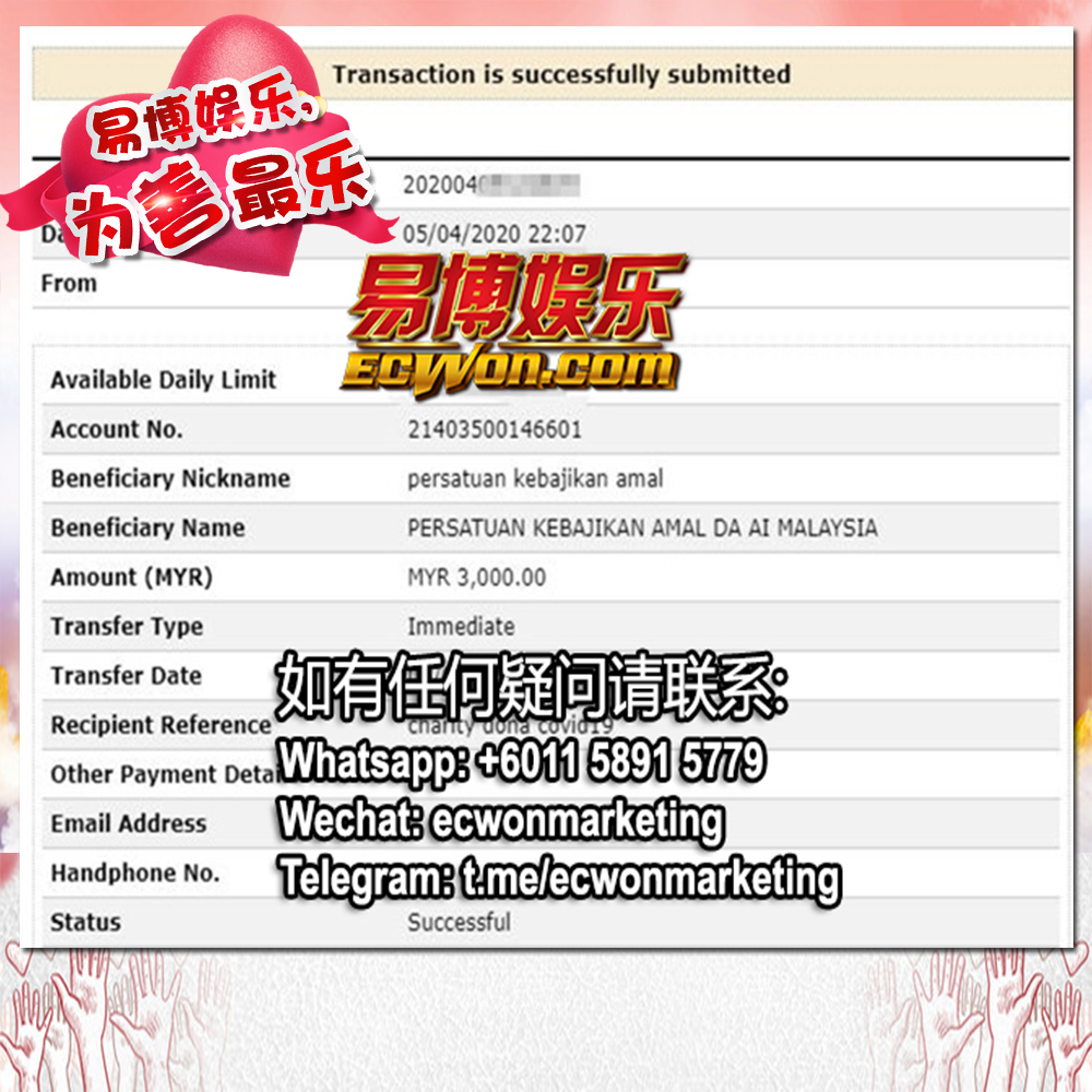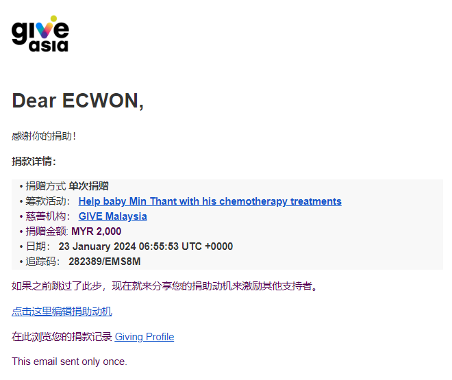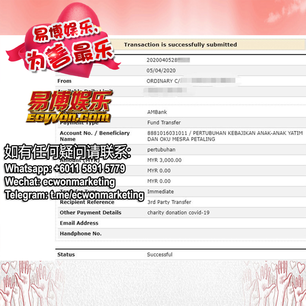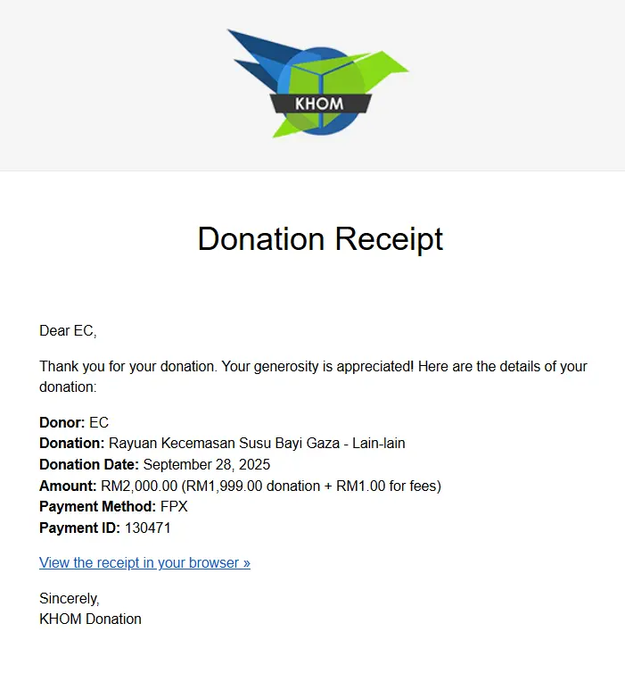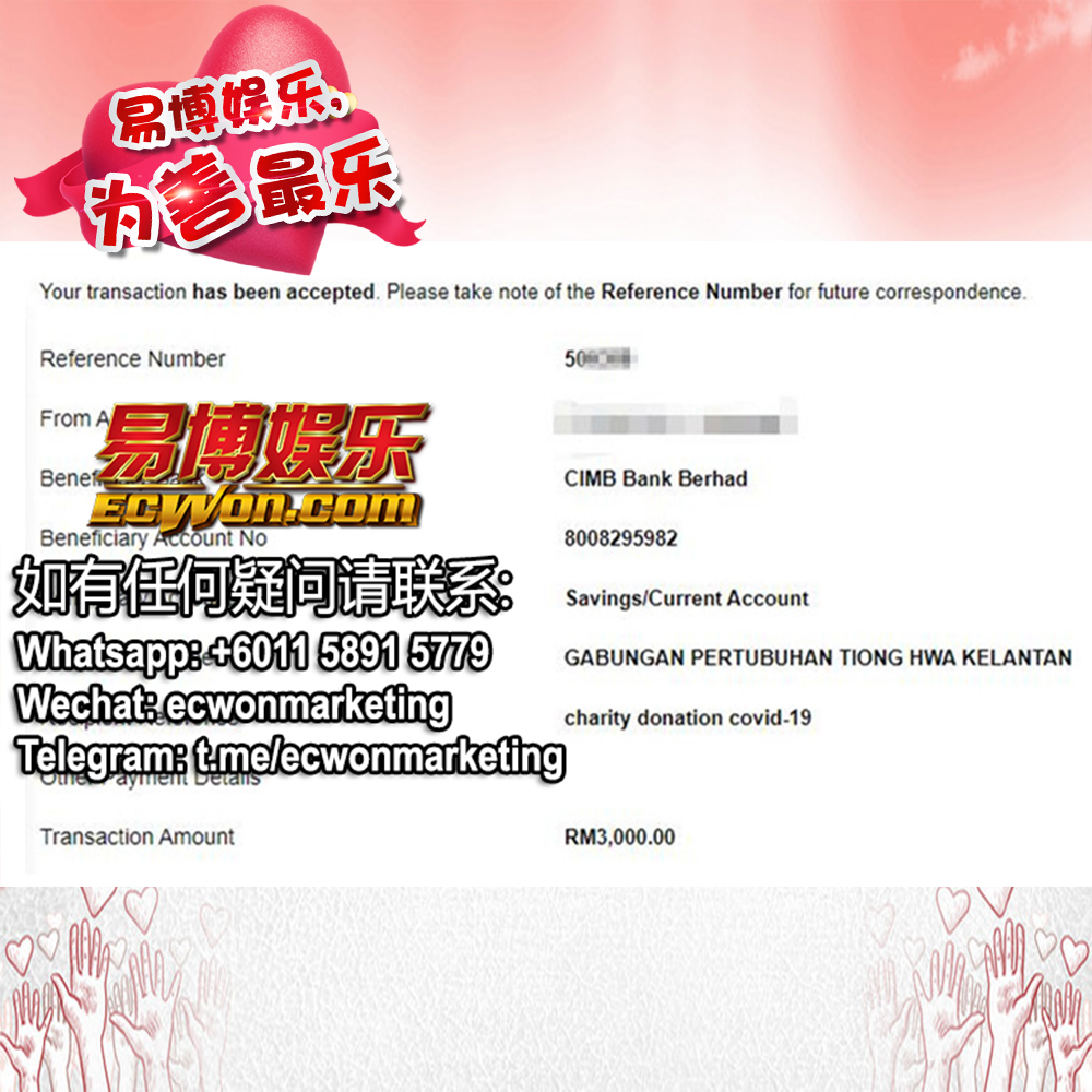 ×DATE UNITS MATTERS(Event/Case) AMOUNT RECEIPT 27/09/2025 One Hope Charity & Welfare September 2025 Donation RM 2,000 more 27/09/2025 One Hope Charity & Welfare September 2025 Donation RM 2,000 more 27/09/2025 UNICEF For Every Child September 2025 Donation RM 2,000 more 27/09/2025 Rayuan Tajaan Anak Yatim Gaza di bawah Projek Yatim KHOM September 2025 Donation RM 2,000 more 27/09/2025 Rayuan Kecemasan Susu Bayi Gaza September 2025 Donation RM 2,000 more 23/01/2024 Auntie Fong Lian (Give Malaysia) January 2024 Donation RM 2,000 more 23/01/2024 Baby Min Thant Chemotherapy Treatments (Give Malaysia) January 2024 Donation RM 2,000 more 23/01/2024 Give Acacia Fighting Chance (Give Malaysia) January 2024 Donation RM 2,000 more 23/01/2024 Haura Cancer Treatment (Give Malaysia) January 2024 Donation RM 2,000 more 23/01/2024 Raysha kidney Treatments (Give Malaysia) January 2024 Donation RM 2,000 more 29/08/2023 Nor Shahidah Heart Surgery August 2023 Donation RM 949.20 more 27/04/2023 Little Girl's Cancer Treatment April 2023 Donation RM 3,343 more 21/02/2023 GIVE Malaysia February 2023 Donation RM 5,000 more 15/12/2022 One Hope Charity & Welfa December 2022 Donation RM 10,000 more 12/07/2022 Lau Mei Jun July 2022 Donation RM 10,000 more 16/04/2022 Pusat Jagaan Kasih Sayang Prasanna April 2022 Donation RM 3,000 more 06/04/2022 Prakash Well Care Centre April 2022 Donation RM 10,000 more 28/03/2022 Yayasan Kebajikan Muslim - Low Xin Yu March 2022 Donation RM 3,000 more 14/02/2022 Puta Baramee Amulet Centre February 2022 Donation RM 2,000 more 31/12/2021 Pertubuhan Kebajikan Mu Zi Kuala Lumpur December Flood Relief RM 50,000 more 27/12/2021 7979 Volunteer Group December Flood Relief RM 6,383.71 more 26/12/2021 Prakash Well Care Centre December Donation RM 2,023.06 more 25/12/2021 Pertubuhan Kebajikan WSC December Flood Relief RM 33,000 more 08/12/2021 Details cannot be made public due to sensitive issues 2021 Qinghan Scholarship RM 10,000 more 31/10/2021 Kiew Lee Yun October Donation RM 2,000 more 14/10/2021 Wong Koy Lean October Donation RM 10,000 more 09/08/2021 Pertubuhan Kebajikan Shi Fang Johor Bahru Johor Urgent Donation for HFNC breathing tube RM 10,000 more 04/08/2021 Rumah Charis ECWON 6TH Anniversary Donation RM 2,000 more 04/08/2021 Be Home For Special Care ECWON 6TH Anniversary Donation RM 2,000 more 04/08/2021 Pusat Jagaan Sri Mesra-Mesra Home Ampang ECWON 6TH Anniversary Donation RM 2,000 more 04/08/2021 En Yuan Old Folk Home ECWON 6TH Anniversary Donation RM 2,000 more 04/08/2021 Association Yee Ran Jing Sheh Handicapped Children's Home ECWON 6TH Anniversary Donation RM 2,000 more 04/08/2021 Penang Handicapped Welfare Association ECWON 6TH Anniversary Donation RM 2,000 more 04/08/2021 Persatuan Rumah Caring Kajang Selangor ECWON 6TH Anniversary Donation RM 2,000 more 04/08/2021 Pertubuhan Kebajikan Orang Tua Cacat Dan Kurang Upaya Taman Connaught ECWON 6TH Anniversary Donation RM 2,000 more 04/08/2021 Pertubuhan Kebajikan Orang Tua Wen Xin ECWON 6TH Anniversary Donation RM 2,000 more 04/08/2021 Pusat Penjagaan Warga Emas Chan ECWON 6TH Anniversary Donation RM 2,000 more 04/08/2021 St. Nicholas' Home ECWON 6TH Anniversary Donation RM 2,000 more 04/08/2021 Pertubuhan Amal Uncle Kentang Malaysia ECWON 6TH Anniversary Donation RM 2,000 more 20/07/2021 White Flag Campaign ECWON 6TH Anniversary Donation RM 6,210.90 more 19/07/2021 Persatuan Kebajikan Amal Da Ai Malaysia Jul'21 Donation RM 1,000 more 01/06/2021 Klang Valley Elderly and Disability Center Klang Valley Elderly and Disability Donation RM 10,000 more 09/02/2021 Pertubuhan Amal Uncle Kentang Malaysia February Donation RM 10,000 more 09/02/2021 Persatuan Kebajikan Prihatin Kuan Yin February Donation RM 3,000 more 09/02/2021 Pkbb Shuang Fu JB February Donation RM 3,000 more 09/02/2021 Pertubuhan Kebajikan Amal Charis Mantin February Donation RM 3,000 more 09/02/2021 Persatuan Kebajikan Warga Emas Ci Shan February Donation RM 3,000 more 09/02/2021 Pertubuhan Pengurusan Rumah Anak-anak Yatim Dan Miskin "Anning" February Donation RM 3,000 more 09/02/2021 Kuching Life Care Society February Donation RM 2,000 more 06/02/2021 NGOhub February Donation RM 2,000 more 06/02/2021 Tenaganita Society February Donation RM 2,000 more 06/02/2021 Yayasan Setia Negara February Donation RM 2,000 more 06/02/2021 Hopis Malaysia February Donation RM 2,000 more 06/02/2021 Pusat Perubatan Universiti Malaya February Donation RM 2,000 more 06/02/2021 Respons Malaysia February Donation RM 2,000 more 06/02/2021 The Lost Food Project February Donation RM 2,000 more 06/02/2021 Unicef February Donation RM 2,000 more 06/02/2021 Protect and Save The Children February Donation RM 3,000 more 06/02/2021 MERCY Malaysia February Donation RM 3,000 more 05/02/2021 Persatuan Kebajikan Ler See February Donation RM 2,000 more 05/02/2021 Persatuan Kebajikan Kanak-kanak OKU Bayan Lebas Pulau Pinang February Donation RM 2,000 more 05/02/2021 Persatuan Insan Istimewa Cheras Selangor February Donation RM 2,000 more 05/02/2021 Persatuan Kebajikan Kanak-kanak Terencat Akal Malaysia February Donation RM 2,000 more 05/02/2021 Pertubuhan Kebajikan Shi Fang Johor February Donation RM 2,000 more 05/02/2021 Pusat Jagaan Kasih Sayang Prasanna February Donation RM 2,000 more 05/02/2021 Pusat Jagaan Kasih Sayang Angel February Donation RM 2,000 more 05/02/2021 Rumah Orang-orang Tua Seri Setia February Donation RM 2,000 more 05/02/2021 Pusat Kebajikan Care Haven Bhd February Donation RM 2,000 more 05/02/2021 Pertubuhan Kebajikan Orang Tua Yi Xing February Donation RM 3,000 more 05/02/2021 Pertubuhan Kebajikan Orang Tua Wen Xin February Donation RM 3,000 more 05/02/2021 Pertubuhan Kebajikan Orang Tua Cacat Dan Kurang Upaya Taman Connaught February Donation RM 3,000 more 05/02/2021 Pusat Penjagaan Warga Emas Chan February Donation RM 3,000 more 05/02/2021 Shine Home February Donation RM 3,000 more 05/02/2021 Pertubuhan Kebajikan Insan Istimewa Kuala Lumpur February Donation RM 3,000 more 05/02/