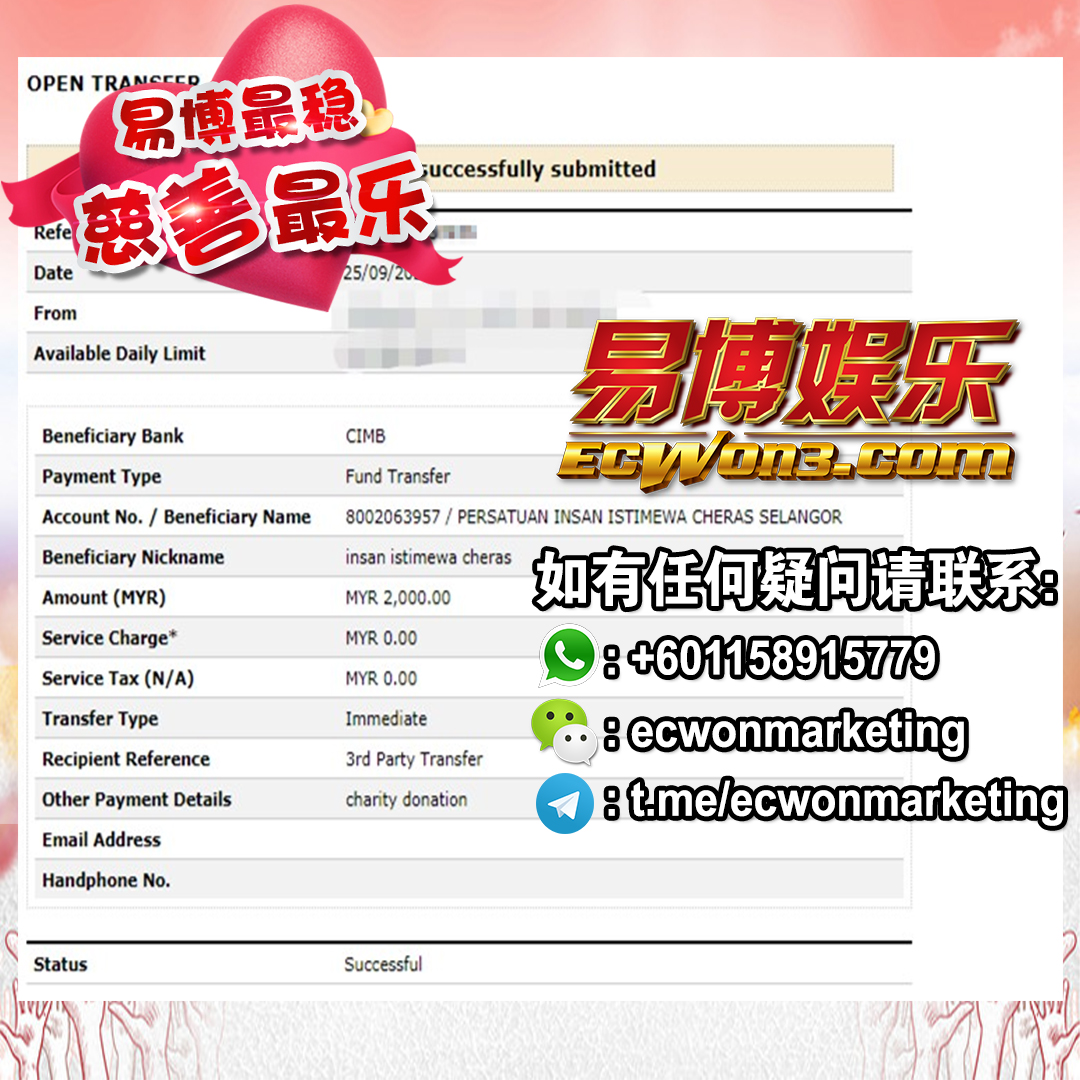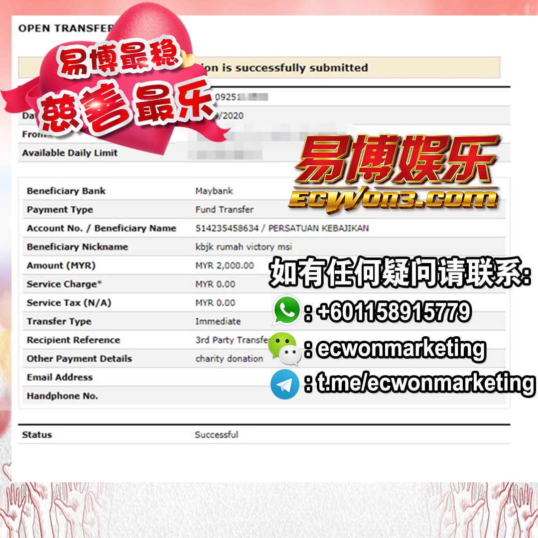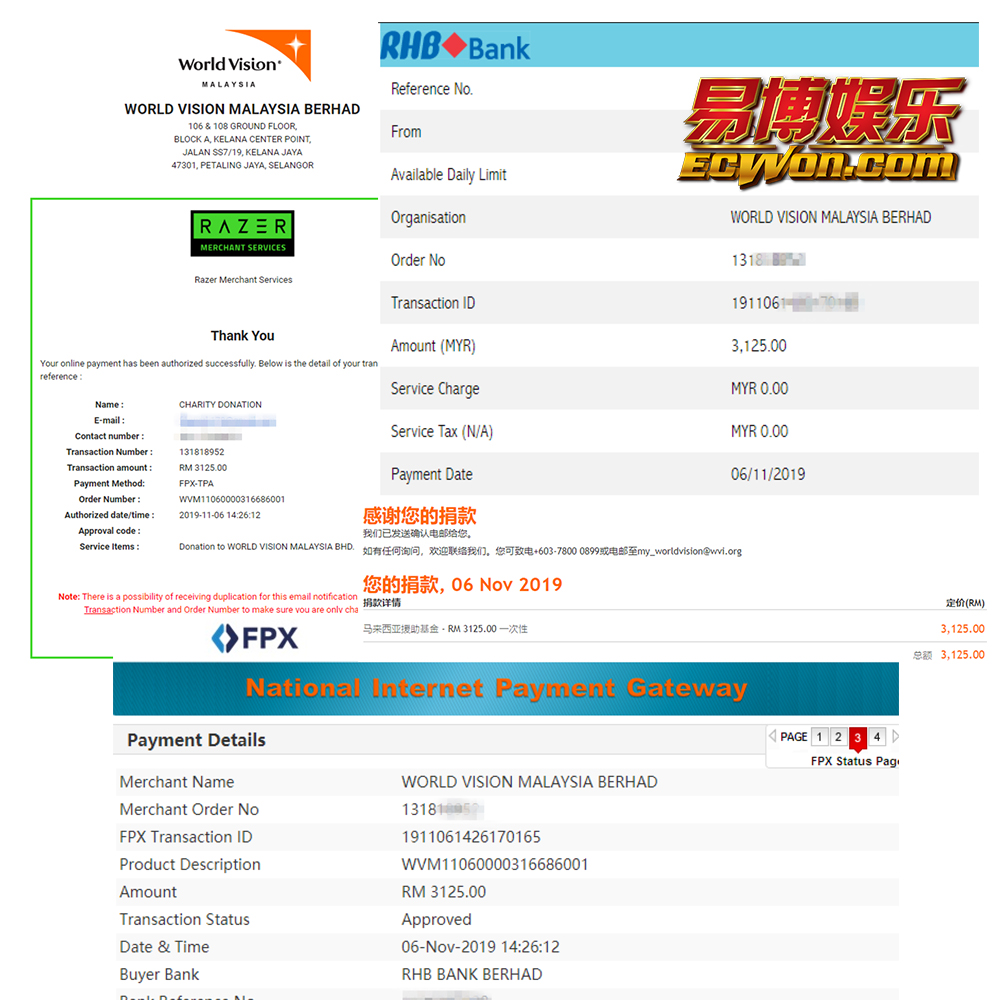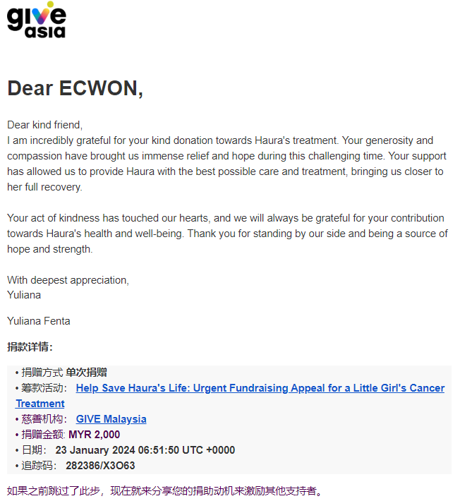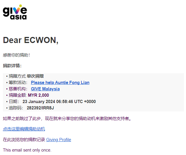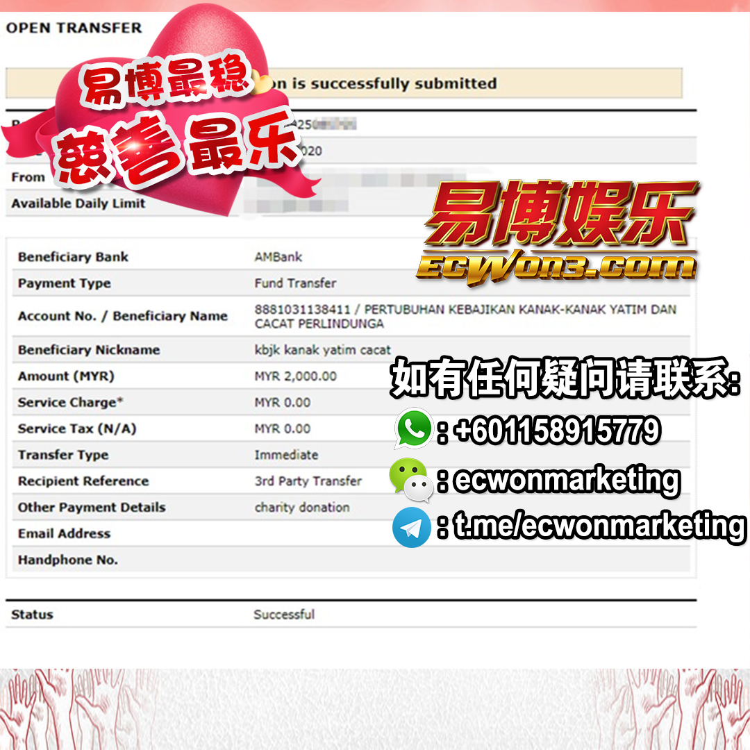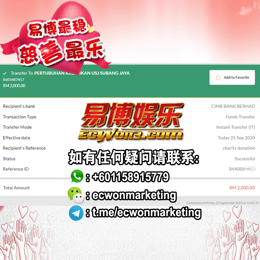 ×DATE UNITS MATTERS(Event/Case) AMOUNT RECEIPT 27/09/2025 One Hope Charity & Welfare September 2025 Donation RM 2,000 more 27/09/2025 One Hope Charity & Welfare September 2025 Donation RM 2,000 more 27/09/2025 UNICEF For Every Child September 2025 Donation RM 2,000 more 27/09/2025 Rayuan Tajaan Anak Yatim Gaza di bawah Projek Yatim KHOM September 2025 Donation RM 2,000 more 27/09/2025 Rayuan Kecemasan Susu Bayi Gaza September 2025 Donation RM 2,000 more 23/01/2024 Auntie Fong Lian (Give Malaysia) January 2024 Donation RM 2,000 more 23/01/2024 Baby Min Thant Chemotherapy Treatments (Give Malaysia) January 2024 Donation RM 2,000 more 23/01/2024 Give Acacia Fighting Chance (Give Malaysia) January 2024 Donation RM 2,000 more 23/01/2024 Haura Cancer Treatment (Give Malaysia) January 2024 Donation RM 2,000 more 23/01/2024 Raysha kidney Treatments (Give Malaysia) January 2024 Donation RM 2,000 more 29/08/2023 Nor Shahidah Heart Surgery August 2023 Donation RM 949.20 more 27/04/2023 Little Girl's Cancer Treatment April 2023 Donation RM 3,343 more 21/02/2023 GIVE Malaysia February 2023 Donation RM 5,000 more 15/12/2022 One Hope Charity & Welfa December 2022 Donation RM 10,000 more 12/07/2022 Lau Mei Jun July 2022 Donation RM 10,000 more 16/04/2022 Pusat Jagaan Kasih Sayang Prasanna April 2022 Donation RM 3,000 more 06/04/2022 Prakash Well Care Centre April 2022 Donation RM 10,000 more 28/03/2022 Yayasan Kebajikan Muslim - Low Xin Yu March 2022 Donation RM 3,000 more 14/02/2022 Puta Baramee Amulet Centre February 2022 Donation RM 2,000 more 31/12/2021 Pertubuhan Kebajikan Mu Zi Kuala Lumpur December Flood Relief RM 50,000 more 27/12/2021 7979 Volunteer Group December Flood Relief RM 6,383.71 more 26/12/2021 Prakash Well Care Centre December Donation RM 2,023.06 more 25/12/2021 Pertubuhan Kebajikan WSC December Flood Relief RM 33,000 more 08/12/2021 Details cannot be made public due to sensitive issues 2021 Qinghan Scholarship RM 10,000 more 31/10/2021 Kiew Lee Yun October Donation RM 2,000 more 14/10/2021 Wong Koy Lean October Donation RM 10,000 more 09/08/2021 Pertubuhan Kebajikan Shi Fang Johor Bahru Johor Urgent Donation for HFNC breathing tube RM 10,000 more 04/08/2021 Rumah Charis ECWON 6TH Anniversary Donation RM 2,000 more 04/08/2021 Be Home For Special Care ECWON 6TH Anniversary Donation RM 2,000 more 04/08/2021 Pusat Jagaan Sri Mesra-Mesra Home Ampang ECWON 6TH Anniversary Donation RM 2,000 more 04/08/2021 En Yuan Old Folk Home ECWON 6TH Anniversary Donation RM 2,000 more 04/08/2021 Association Yee Ran Jing Sheh Handicapped Children's Home ECWON 6TH Anniversary Donation RM 2,000 more 04/08/2021 Penang Handicapped Welfare Association ECWON 6TH Anniversary Donation RM 2,000 more 04/08/2021 Persatuan Rumah Caring Kajang Selangor ECWON 6TH Anniversary Donation RM 2,000 more 04/08/2021 Pertubuhan Kebajikan Orang Tua Cacat Dan Kurang Upaya Taman Connaught ECWON 6TH Anniversary Donation RM 2,000 more 04/08/2021 Pertubuhan Kebajikan Orang Tua Wen Xin ECWON 6TH Anniversary Donation RM 2,000 more 04/08/2021 Pusat Penjagaan Warga Emas Chan ECWON 6TH Anniversary Donation RM 2,000 more 04/08/2021 St. Nicholas' Home ECWON 6TH Anniversary Donation RM 2,000 more 04/08/2021 Pertubuhan Amal Uncle Kentang Malaysia ECWON 6TH Anniversary Donation RM 2,000 more 20/07/2021 White Flag Campaign ECWON 6TH Anniversary Donation RM 6,210.90 more 19/07/2021 Persatuan Kebajikan Amal Da Ai Malaysia Jul'21 Donation RM 1,000 more 01/06/2021 Klang Valley Elderly and Disability Center Klang Valley Elderly and Disability Donation RM 10,000 more 09/02/2021 Pertubuhan Amal Uncle Kentang Malaysia February Donation RM 10,000 more 09/02/2021 Persatuan Kebajikan Prihatin Kuan Yin February Donation RM 3,000 more 09/02/2021 Pkbb Shuang Fu JB February Donation RM 3,000 more 09/02/2021 Pertubuhan Kebajikan Amal Charis Mantin February Donation RM 3,000 more 09/02/2021 Persatuan Kebajikan Warga Emas Ci Shan February Donation RM 3,000 more 09/02/2021 Pertubuhan Pengurusan Rumah Anak-anak Yatim Dan Miskin "Anning" February Donation RM 3,000 more 09/02/2021 Kuching Life Care Society February Donation RM 2,000 more 06/02/2021 NGOhub February Donation RM 2,000 more 06/02/2021 Tenaganita Society February Donation RM 2,000 more 06/02/2021 Yayasan Setia Negara February Donation RM 2,000 more 06/02/2021 Hopis Malaysia February Donation RM 2,000 more 06/02/2021 Pusat Perubatan Universiti Malaya February Donation RM 2,000 more 06/02/2021 Respons Malaysia February Donation RM 2,000 more 06/02/2021 The Lost Food Project February Donation RM 2,000 more 06/02/2021 Unicef February Donation RM 2,000 more 06/02/2021 Protect and Save The Children February Donation RM 3,000 more 06/02/2021 MERCY Malaysia February Donation RM 3,000 more 05/02/2021 Persatuan Kebajikan Ler See February Donation RM 2,000 more 05/02/2021 Persatuan Kebajikan Kanak-kanak OKU Bayan Lebas Pulau Pinang February Donation RM 2,000 more 05/02/2021 Persatuan Insan Istimewa Cheras Selangor February Donation RM 2,000 more 05/02/2021 Persatuan Kebajikan Kanak-kanak Terencat Akal Malaysia February Donation RM 2,000 more 05/02/2021 Pertubuhan Kebajikan Shi Fang Johor February Donation RM 2,000 more 05/02/2021 Pusat Jagaan Kasih Sayang Prasanna February Donation RM 2,000 more 05/02/2021 Pusat Jagaan Kasih Sayang Angel February Donation RM 2,000 more 05/02/2021 Rumah Orang-orang Tua Seri Setia February Donation RM 2,000 more 05/02/2021 Pusat Kebajikan Care Haven Bhd February Donation RM 2,000 more 05/02/2021 Pertubuhan Kebajikan Orang Tua Yi Xing February Donation RM 3,000 more 05/02/2021 Pertubuhan Kebajikan Orang Tua Wen Xin February Donation RM 3,000 more 05/02/2021 Pertubuhan Kebajikan Orang Tua Cacat Dan Kurang Upaya Taman Connaught February Donation RM 3,000 more 05/02/2021 Pusat Penjagaan Warga Emas Chan February Donation RM 3,000 more 05/02/2021 Shine Home February Donation RM 3,000 more 05/02/2021 Pertubuhan Kebajikan Insan Istimewa Kuala Lumpur February Donation RM 3,000 more 05/02/