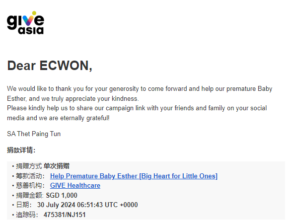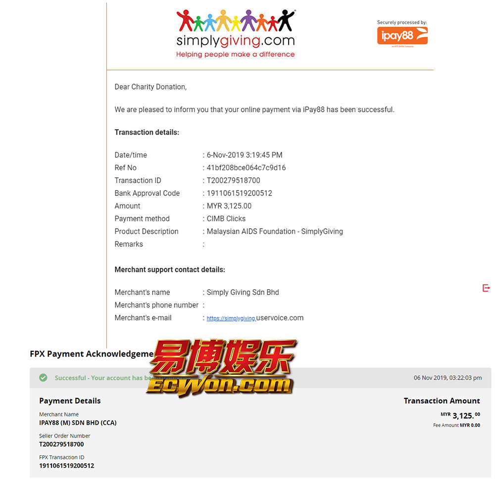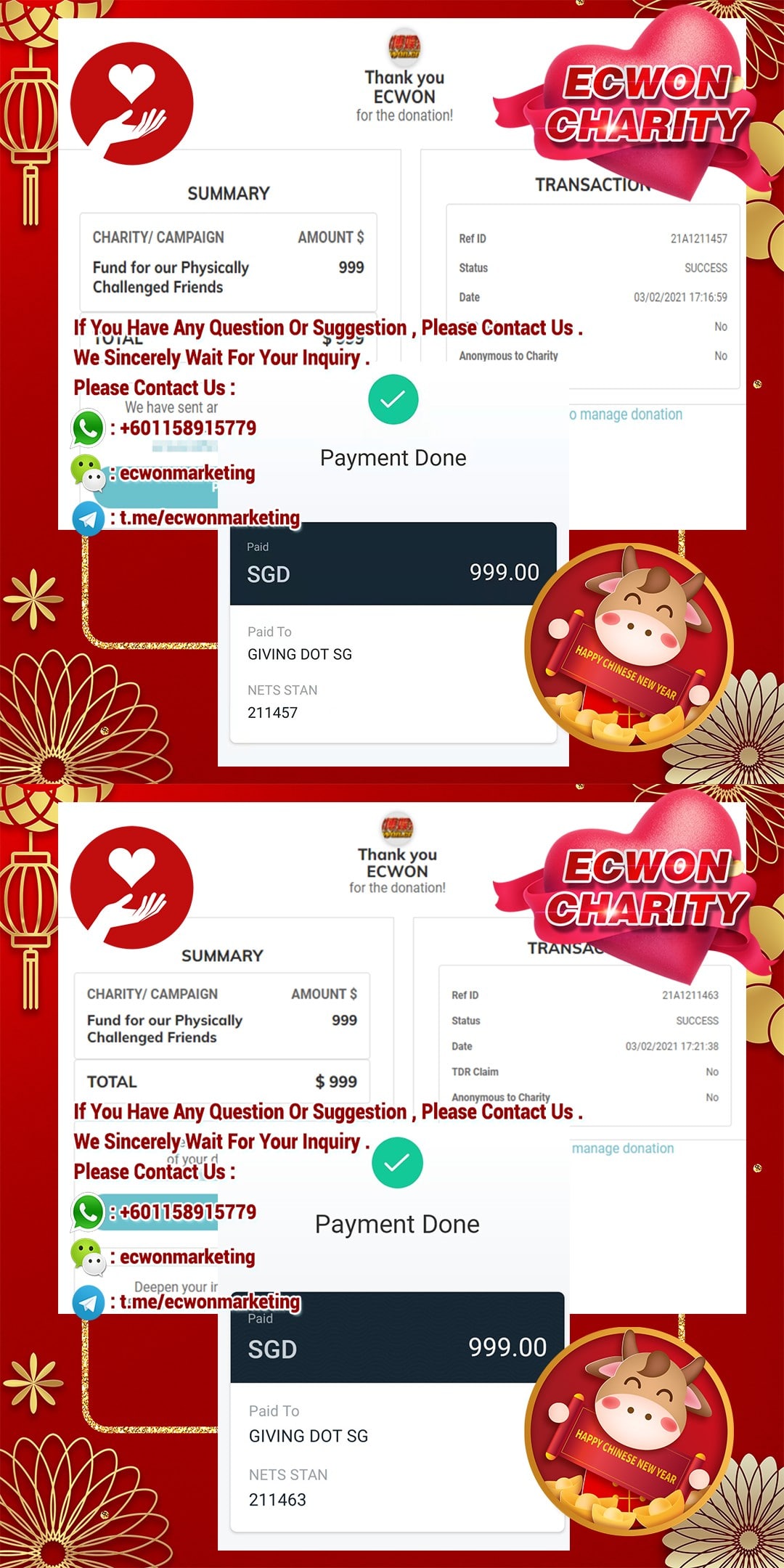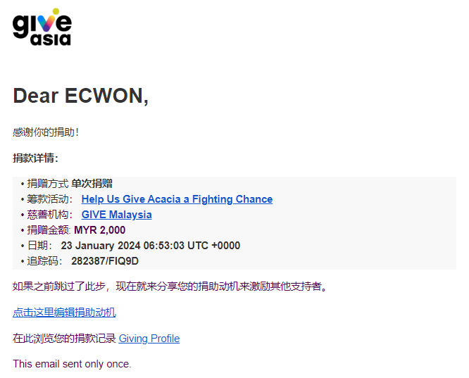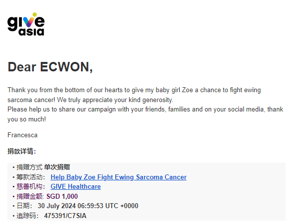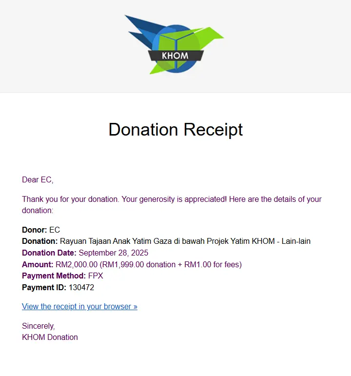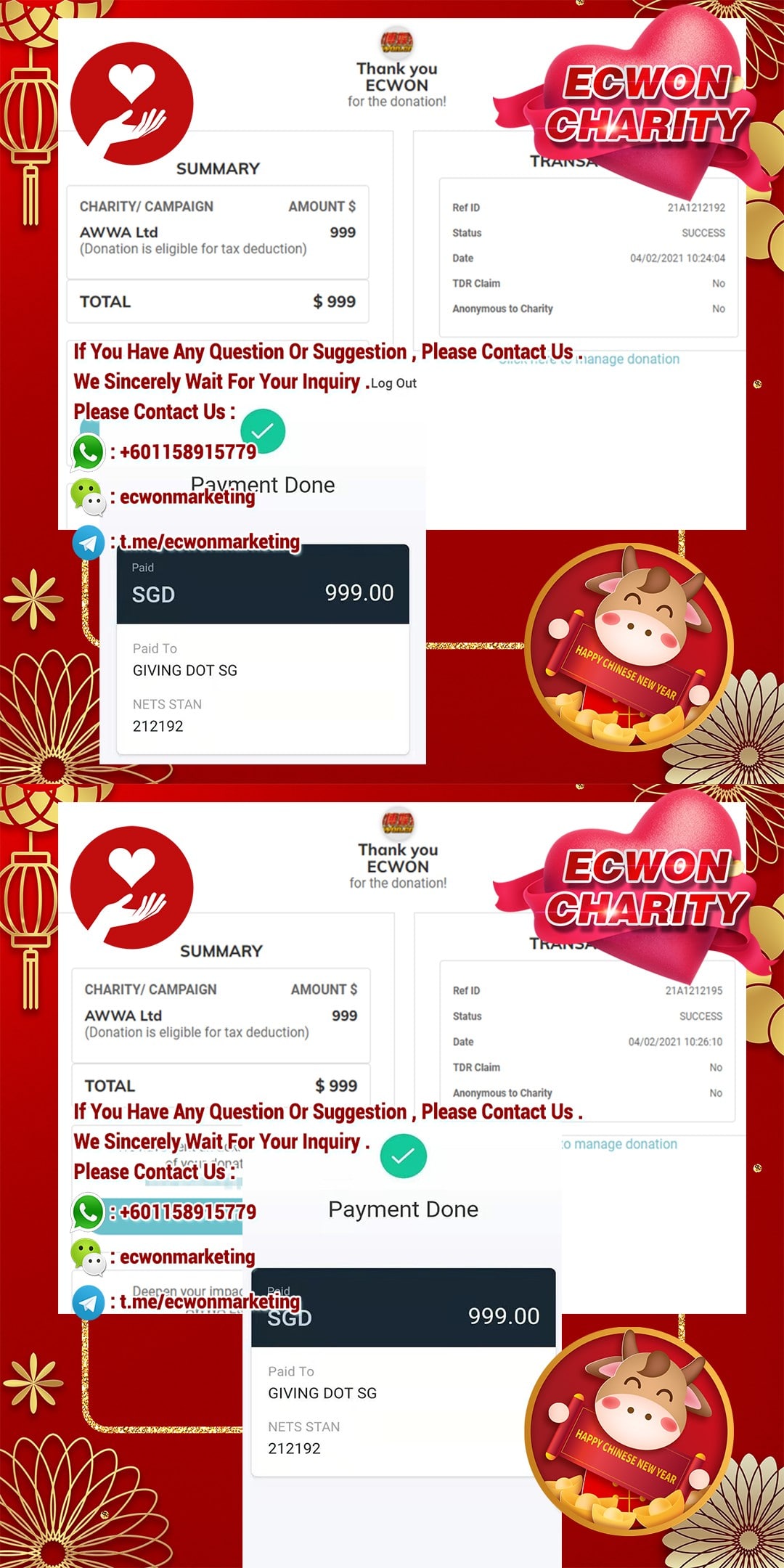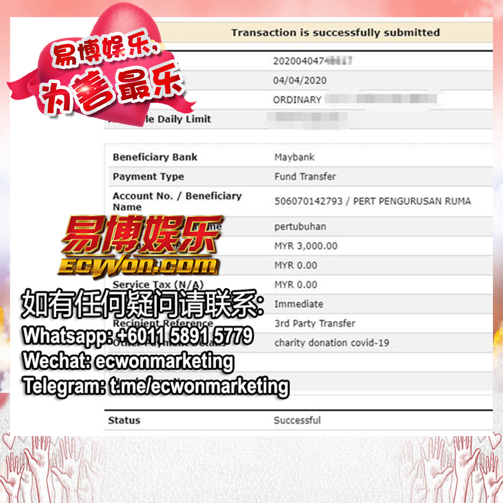 ×DATE UNITS MATTERS(Event/Case) AMOUNT RECEIPT 27/09/2025 One Hope Charity & Welfare September 2025 Donation RM 2,000 more 27/09/2025 One Hope Charity & Welfare September 2025 Donation RM 2,000 more 27/09/2025 UNICEF For Every Child September 2025 Donation RM 2,000 more 27/09/2025 Rayuan Tajaan Anak Yatim Gaza di bawah Projek Yatim KHOM September 2025 Donation RM 2,000 more 27/09/2025 Rayuan Kecemasan Susu Bayi Gaza September 2025 Donation RM 2,000 more 23/01/2024 Auntie Fong Lian (Give Malaysia) January 2024 Donation RM 2,000 more 23/01/2024 Baby Min Thant Chemotherapy Treatments (Give Malaysia) January 2024 Donation RM 2,000 more 23/01/2024 Give Acacia Fighting Chance (Give Malaysia) January 2024 Donation RM 2,000 more 23/01/2024 Haura Cancer Treatment (Give Malaysia) January 2024 Donation RM 2,000 more 23/01/2024 Raysha kidney Treatments (Give Malaysia) January 2024 Donation RM 2,000 more 29/08/2023 Nor Shahidah Heart Surgery August 2023 Donation RM 949.20 more 27/04/2023 Little Girl's Cancer Treatment April 2023 Donation RM 3,343 more 21/02/2023 GIVE Malaysia February 2023 Donation RM 5,000 more 15/12/2022 One Hope Charity & Welfa December 2022 Donation RM 10,000 more 12/07/2022 Lau Mei Jun July 2022 Donation RM 10,000 more 16/04/2022 Pusat Jagaan Kasih Sayang Prasanna April 2022 Donation RM 3,000 more 06/04/2022 Prakash Well Care Centre April 2022 Donation RM 10,000 more 28/03/2022 Yayasan Kebajikan Muslim - Low Xin Yu March 2022 Donation RM 3,000 more 14/02/2022 Puta Baramee Amulet Centre February 2022 Donation RM 2,000 more 31/12/2021 Pertubuhan Kebajikan Mu Zi Kuala Lumpur December Flood Relief RM 50,000 more 27/12/2021 7979 Volunteer Group December Flood Relief RM 6,383.71 more 26/12/2021 Prakash Well Care Centre December Donation RM 2,023.06 more 25/12/2021 Pertubuhan Kebajikan WSC December Flood Relief RM 33,000 more 08/12/2021 Details cannot be made public due to sensitive issues 2021 Qinghan Scholarship RM 10,000 more 31/10/2021 Kiew Lee Yun October Donation RM 2,000 more 14/10/2021 Wong Koy Lean October Donation RM 10,000 more 09/08/2021 Pertubuhan Kebajikan Shi Fang Johor Bahru Johor Urgent Donation for HFNC breathing tube RM 10,000 more 04/08/2021 Rumah Charis ECWON 6TH Anniversary Donation RM 2,000 more 04/08/2021 Be Home For Special Care ECWON 6TH Anniversary Donation RM 2,000 more 04/08/2021 Pusat Jagaan Sri Mesra-Mesra Home Ampang ECWON 6TH Anniversary Donation RM 2,000 more 04/08/2021 En Yuan Old Folk Home ECWON 6TH Anniversary Donation RM 2,000 more 04/08/2021 Association Yee Ran Jing Sheh Handicapped Children's Home ECWON 6TH Anniversary Donation RM 2,000 more 04/08/2021 Penang Handicapped Welfare Association ECWON 6TH Anniversary Donation RM 2,000 more 04/08/2021 Persatuan Rumah Caring Kajang Selangor ECWON 6TH Anniversary Donation RM 2,000 more 04/08/2021 Pertubuhan Kebajikan Orang Tua Cacat Dan Kurang Upaya Taman Connaught ECWON 6TH Anniversary Donation RM 2,000 more 04/08/2021 Pertubuhan Kebajikan Orang Tua Wen Xin ECWON 6TH Anniversary Donation RM 2,000 more 04/08/2021 Pusat Penjagaan Warga Emas Chan ECWON 6TH Anniversary Donation RM 2,000 more 04/08/2021 St. Nicholas' Home ECWON 6TH Anniversary Donation RM 2,000 more 04/08/2021 Pertubuhan Amal Uncle Kentang Malaysia ECWON 6TH Anniversary Donation RM 2,000 more 20/07/2021 White Flag Campaign ECWON 6TH Anniversary Donation RM 6,210.90 more 19/07/2021 Persatuan Kebajikan Amal Da Ai Malaysia Jul'21 Donation RM 1,000 more 01/06/2021 Klang Valley Elderly and Disability Center Klang Valley Elderly and Disability Donation RM 10,000 more 09/02/2021 Pertubuhan Amal Uncle Kentang Malaysia February Donation RM 10,000 more 09/02/2021 Persatuan Kebajikan Prihatin Kuan Yin February Donation RM 3,000 more 09/02/2021 Pkbb Shuang Fu JB February Donation RM 3,000 more 09/02/2021 Pertubuhan Kebajikan Amal Charis Mantin February Donation RM 3,000 more 09/02/2021 Persatuan Kebajikan Warga Emas Ci Shan February Donation RM 3,000 more 09/02/2021 Pertubuhan Pengurusan Rumah Anak-anak Yatim Dan Miskin "Anning" February Donation RM 3,000 more 09/02/2021 Kuching Life Care Society February Donation RM 2,000 more 06/02/2021 NGOhub February Donation RM 2,000 more 06/02/2021 Tenaganita Society February Donation RM 2,000 more 06/02/2021 Yayasan Setia Negara February Donation RM 2,000 more 06/02/2021 Hopis Malaysia February Donation RM 2,000 more 06/02/2021 Pusat Perubatan Universiti Malaya February Donation RM 2,000 more 06/02/2021 Respons Malaysia February Donation RM 2,000 more 06/02/2021 The Lost Food Project February Donation RM 2,000 more 06/02/2021 Unicef February Donation RM 2,000 more 06/02/2021 Protect and Save The Children February Donation RM 3,000 more 06/02/2021 MERCY Malaysia February Donation RM 3,000 more 05/02/2021 Persatuan Kebajikan Ler See February Donation RM 2,000 more 05/02/2021 Persatuan Kebajikan Kanak-kanak OKU Bayan Lebas Pulau Pinang February Donation RM 2,000 more 05/02/2021 Persatuan Insan Istimewa Cheras Selangor February Donation RM 2,000 more 05/02/2021 Persatuan Kebajikan Kanak-kanak Terencat Akal Malaysia February Donation RM 2,000 more 05/02/2021 Pertubuhan Kebajikan Shi Fang Johor February Donation RM 2,000 more 05/02/2021 Pusat Jagaan Kasih Sayang Prasanna February Donation RM 2,000 more 05/02/2021 Pusat Jagaan Kasih Sayang Angel February Donation RM 2,000 more 05/02/2021 Rumah Orang-orang Tua Seri Setia February Donation RM 2,000 more 05/02/2021 Pusat Kebajikan Care Haven Bhd February Donation RM 2,000 more 05/02/2021 Pertubuhan Kebajikan Orang Tua Yi Xing February Donation RM 3,000 more 05/02/2021 Pertubuhan Kebajikan Orang Tua Wen Xin February Donation RM 3,000 more 05/02/2021 Pertubuhan Kebajikan Orang Tua Cacat Dan Kurang Upaya Taman Connaught February Donation RM 3,000 more 05/02/2021 Pusat Penjagaan Warga Emas Chan February Donation RM 3,000 more 05/02/2021 Shine Home February Donation RM 3,000 more 05/02/2021 Pertubuhan Kebajikan Insan Istimewa Kuala Lumpur February Donation RM 3,000 more 05/02/