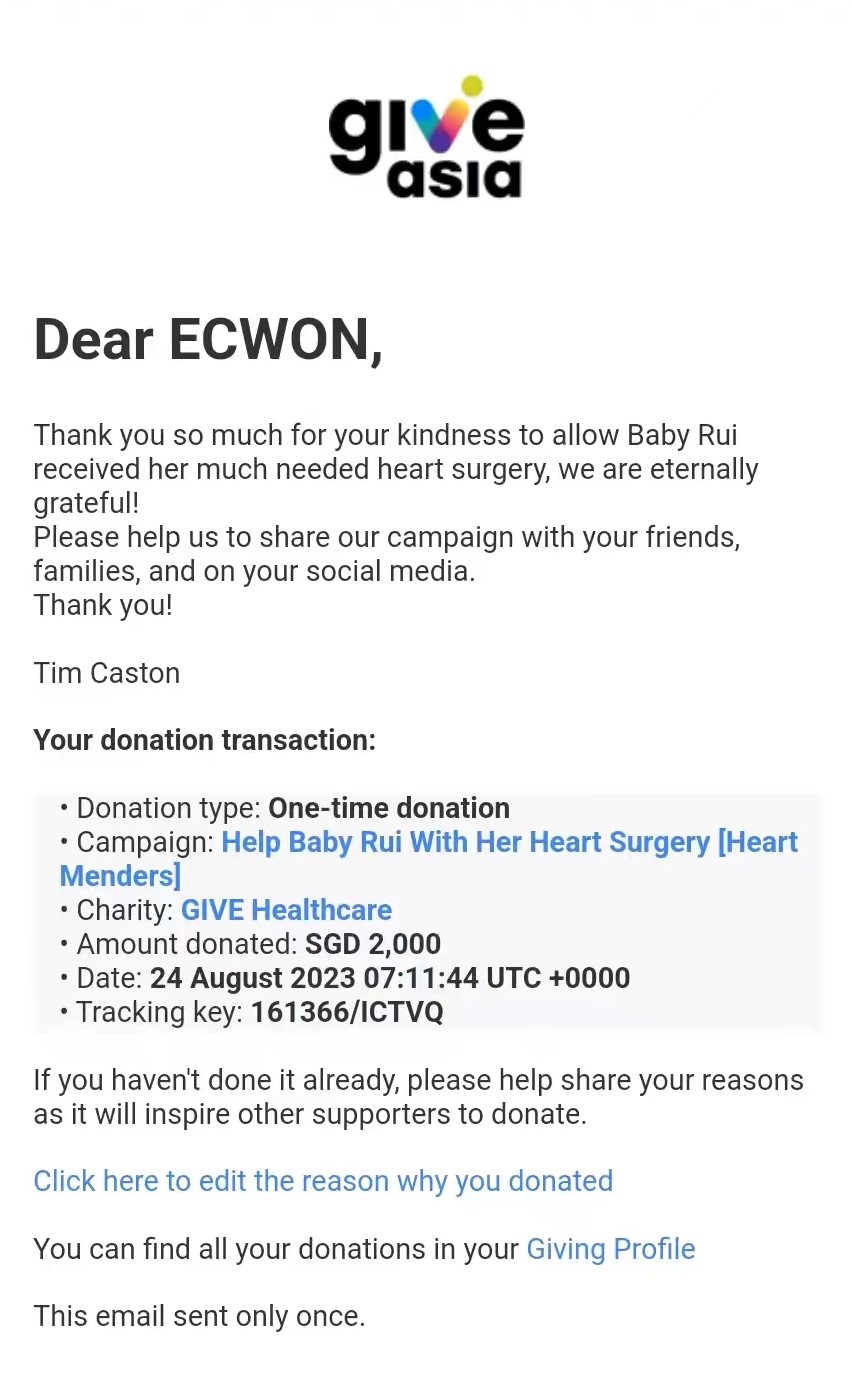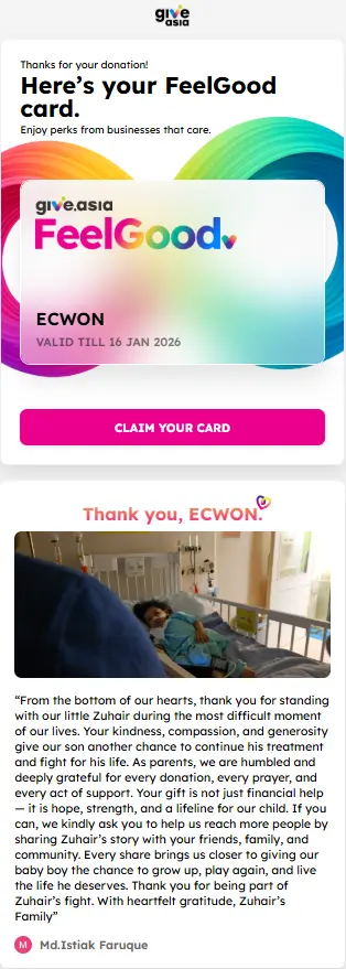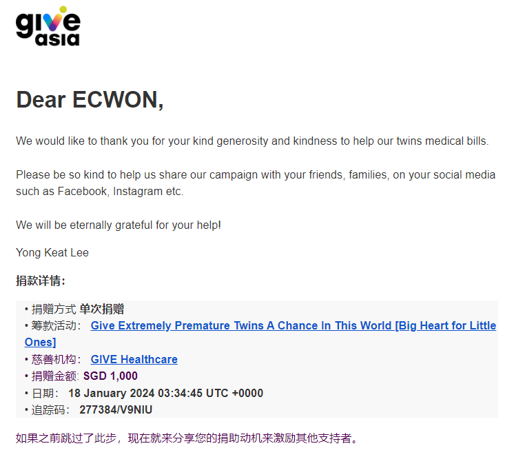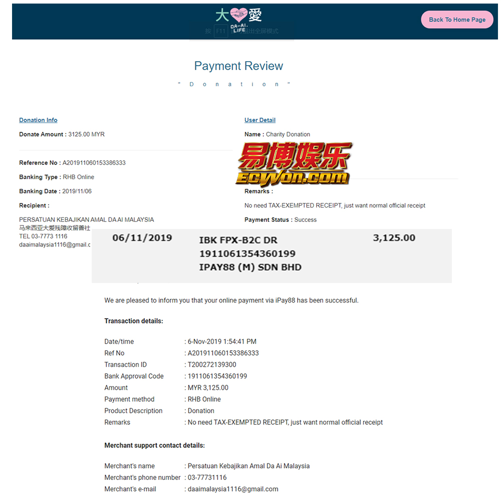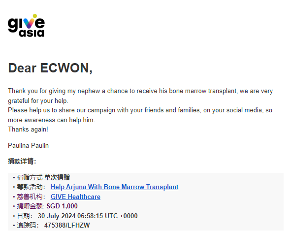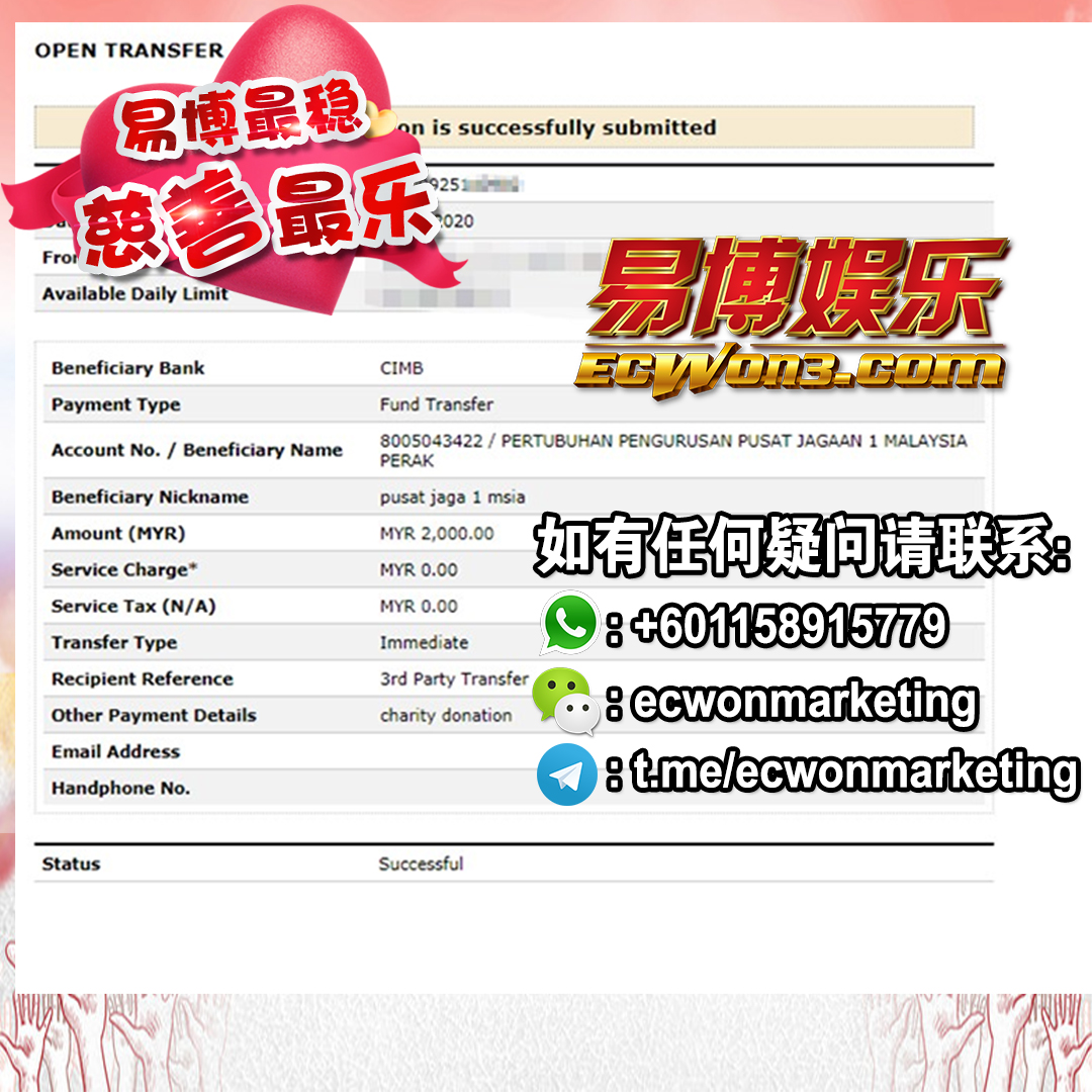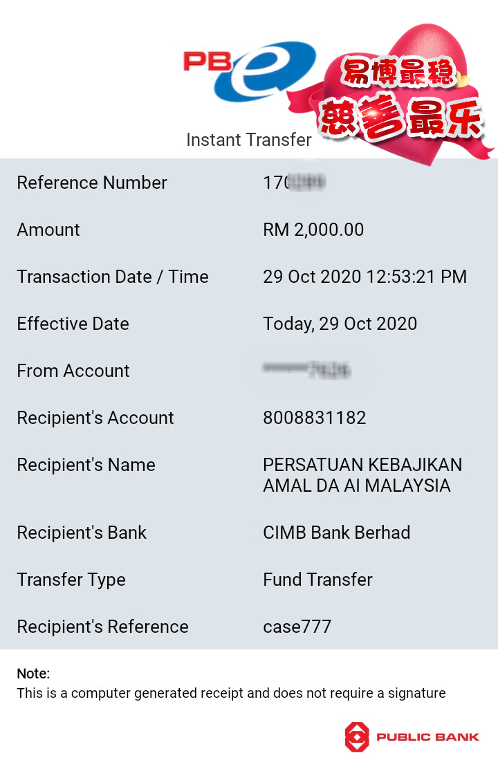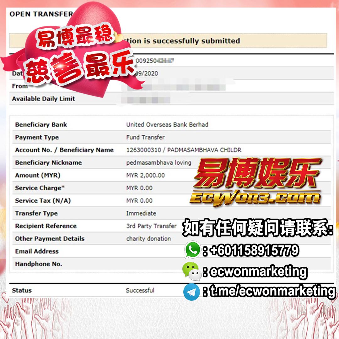 ×DATE UNITS MATTERS(Event/Case) AMOUNT RECEIPT 27/09/2025 One Hope Charity & Welfare September 2025 Donation RM 2,000 more 27/09/2025 One Hope Charity & Welfare September 2025 Donation RM 2,000 more 27/09/2025 UNICEF For Every Child September 2025 Donation RM 2,000 more 27/09/2025 Rayuan Tajaan Anak Yatim Gaza di bawah Projek Yatim KHOM September 2025 Donation RM 2,000 more 27/09/2025 Rayuan Kecemasan Susu Bayi Gaza September 2025 Donation RM 2,000 more 23/01/2024 Auntie Fong Lian (Give Malaysia) January 2024 Donation RM 2,000 more 23/01/2024 Baby Min Thant Chemotherapy Treatments (Give Malaysia) January 2024 Donation RM 2,000 more 23/01/2024 Give Acacia Fighting Chance (Give Malaysia) January 2024 Donation RM 2,000 more 23/01/2024 Haura Cancer Treatment (Give Malaysia) January 2024 Donation RM 2,000 more 23/01/2024 Raysha kidney Treatments (Give Malaysia) January 2024 Donation RM 2,000 more 29/08/2023 Nor Shahidah Heart Surgery August 2023 Donation RM 949.20 more 27/04/2023 Little Girl's Cancer Treatment April 2023 Donation RM 3,343 more 21/02/2023 GIVE Malaysia February 2023 Donation RM 5,000 more 15/12/2022 One Hope Charity & Welfa December 2022 Donation RM 10,000 more 12/07/2022 Lau Mei Jun July 2022 Donation RM 10,000 more 16/04/2022 Pusat Jagaan Kasih Sayang Prasanna April 2022 Donation RM 3,000 more 06/04/2022 Prakash Well Care Centre April 2022 Donation RM 10,000 more 28/03/2022 Yayasan Kebajikan Muslim - Low Xin Yu March 2022 Donation RM 3,000 more 14/02/2022 Puta Baramee Amulet Centre February 2022 Donation RM 2,000 more 31/12/2021 Pertubuhan Kebajikan Mu Zi Kuala Lumpur December Flood Relief RM 50,000 more 27/12/2021 7979 Volunteer Group December Flood Relief RM 6,383.71 more 26/12/2021 Prakash Well Care Centre December Donation RM 2,023.06 more 25/12/2021 Pertubuhan Kebajikan WSC December Flood Relief RM 33,000 more 08/12/2021 Details cannot be made public due to sensitive issues 2021 Qinghan Scholarship RM 10,000 more 31/10/2021 Kiew Lee Yun October Donation RM 2,000 more 14/10/2021 Wong Koy Lean October Donation RM 10,000 more 09/08/2021 Pertubuhan Kebajikan Shi Fang Johor Bahru Johor Urgent Donation for HFNC breathing tube RM 10,000 more 04/08/2021 Rumah Charis ECWON 6TH Anniversary Donation RM 2,000 more 04/08/2021 Be Home For Special Care ECWON 6TH Anniversary Donation RM 2,000 more 04/08/2021 Pusat Jagaan Sri Mesra-Mesra Home Ampang ECWON 6TH Anniversary Donation RM 2,000 more 04/08/2021 En Yuan Old Folk Home ECWON 6TH Anniversary Donation RM 2,000 more 04/08/2021 Association Yee Ran Jing Sheh Handicapped Children's Home ECWON 6TH Anniversary Donation RM 2,000 more 04/08/2021 Penang Handicapped Welfare Association ECWON 6TH Anniversary Donation RM 2,000 more 04/08/2021 Persatuan Rumah Caring Kajang Selangor ECWON 6TH Anniversary Donation RM 2,000 more 04/08/2021 Pertubuhan Kebajikan Orang Tua Cacat Dan Kurang Upaya Taman Connaught ECWON 6TH Anniversary Donation RM 2,000 more 04/08/2021 Pertubuhan Kebajikan Orang Tua Wen Xin ECWON 6TH Anniversary Donation RM 2,000 more 04/08/2021 Pusat Penjagaan Warga Emas Chan ECWON 6TH Anniversary Donation RM 2,000 more 04/08/2021 St. Nicholas' Home ECWON 6TH Anniversary Donation RM 2,000 more 04/08/2021 Pertubuhan Amal Uncle Kentang Malaysia ECWON 6TH Anniversary Donation RM 2,000 more 20/07/2021 White Flag Campaign ECWON 6TH Anniversary Donation RM 6,210.90 more 19/07/2021 Persatuan Kebajikan Amal Da Ai Malaysia Jul'21 Donation RM 1,000 more 01/06/2021 Klang Valley Elderly and Disability Center Klang Valley Elderly and Disability Donation RM 10,000 more 09/02/2021 Pertubuhan Amal Uncle Kentang Malaysia February Donation RM 10,000 more 09/02/2021 Persatuan Kebajikan Prihatin Kuan Yin February Donation RM 3,000 more 09/02/2021 Pkbb Shuang Fu JB February Donation RM 3,000 more 09/02/2021 Pertubuhan Kebajikan Amal Charis Mantin February Donation RM 3,000 more 09/02/2021 Persatuan Kebajikan Warga Emas Ci Shan February Donation RM 3,000 more 09/02/2021 Pertubuhan Pengurusan Rumah Anak-anak Yatim Dan Miskin "Anning" February Donation RM 3,000 more 09/02/2021 Kuching Life Care Society February Donation RM 2,000 more 06/02/2021 NGOhub February Donation RM 2,000 more 06/02/2021 Tenaganita Society February Donation RM 2,000 more 06/02/2021 Yayasan Setia Negara February Donation RM 2,000 more 06/02/2021 Hopis Malaysia February Donation RM 2,000 more 06/02/2021 Pusat Perubatan Universiti Malaya February Donation RM 2,000 more 06/02/2021 Respons Malaysia February Donation RM 2,000 more 06/02/2021 The Lost Food Project February Donation RM 2,000 more 06/02/2021 Unicef February Donation RM 2,000 more 06/02/2021 Protect and Save The Children February Donation RM 3,000 more 06/02/2021 MERCY Malaysia February Donation RM 3,000 more 05/02/2021 Persatuan Kebajikan Ler See February Donation RM 2,000 more 05/02/2021 Persatuan Kebajikan Kanak-kanak OKU Bayan Lebas Pulau Pinang February Donation RM 2,000 more 05/02/2021 Persatuan Insan Istimewa Cheras Selangor February Donation RM 2,000 more 05/02/2021 Persatuan Kebajikan Kanak-kanak Terencat Akal Malaysia February Donation RM 2,000 more 05/02/2021 Pertubuhan Kebajikan Shi Fang Johor February Donation RM 2,000 more 05/02/2021 Pusat Jagaan Kasih Sayang Prasanna February Donation RM 2,000 more 05/02/2021 Pusat Jagaan Kasih Sayang Angel February Donation RM 2,000 more 05/02/2021 Rumah Orang-orang Tua Seri Setia February Donation RM 2,000 more 05/02/2021 Pusat Kebajikan Care Haven Bhd February Donation RM 2,000 more 05/02/2021 Pertubuhan Kebajikan Orang Tua Yi Xing February Donation RM 3,000 more 05/02/2021 Pertubuhan Kebajikan Orang Tua Wen Xin February Donation RM 3,000 more 05/02/2021 Pertubuhan Kebajikan Orang Tua Cacat Dan Kurang Upaya Taman Connaught February Donation RM 3,000 more 05/02/2021 Pusat Penjagaan Warga Emas Chan February Donation RM 3,000 more 05/02/2021 Shine Home February Donation RM 3,000 more 05/02/2021 Pertubuhan Kebajikan Insan Istimewa Kuala Lumpur February Donation RM 3,000 more 05/02/